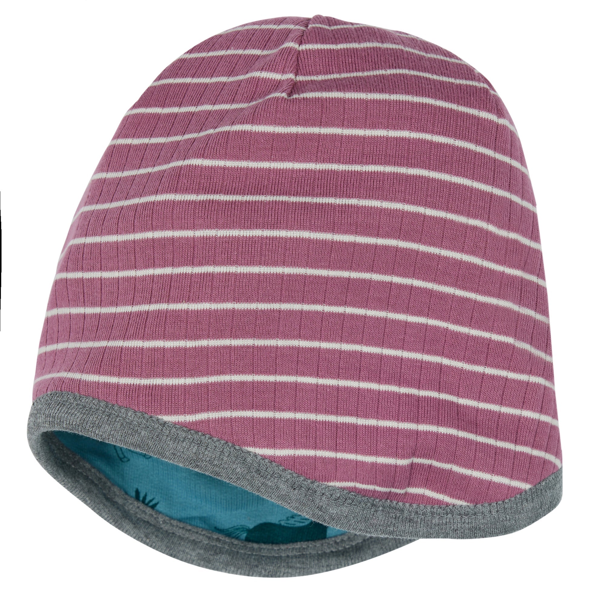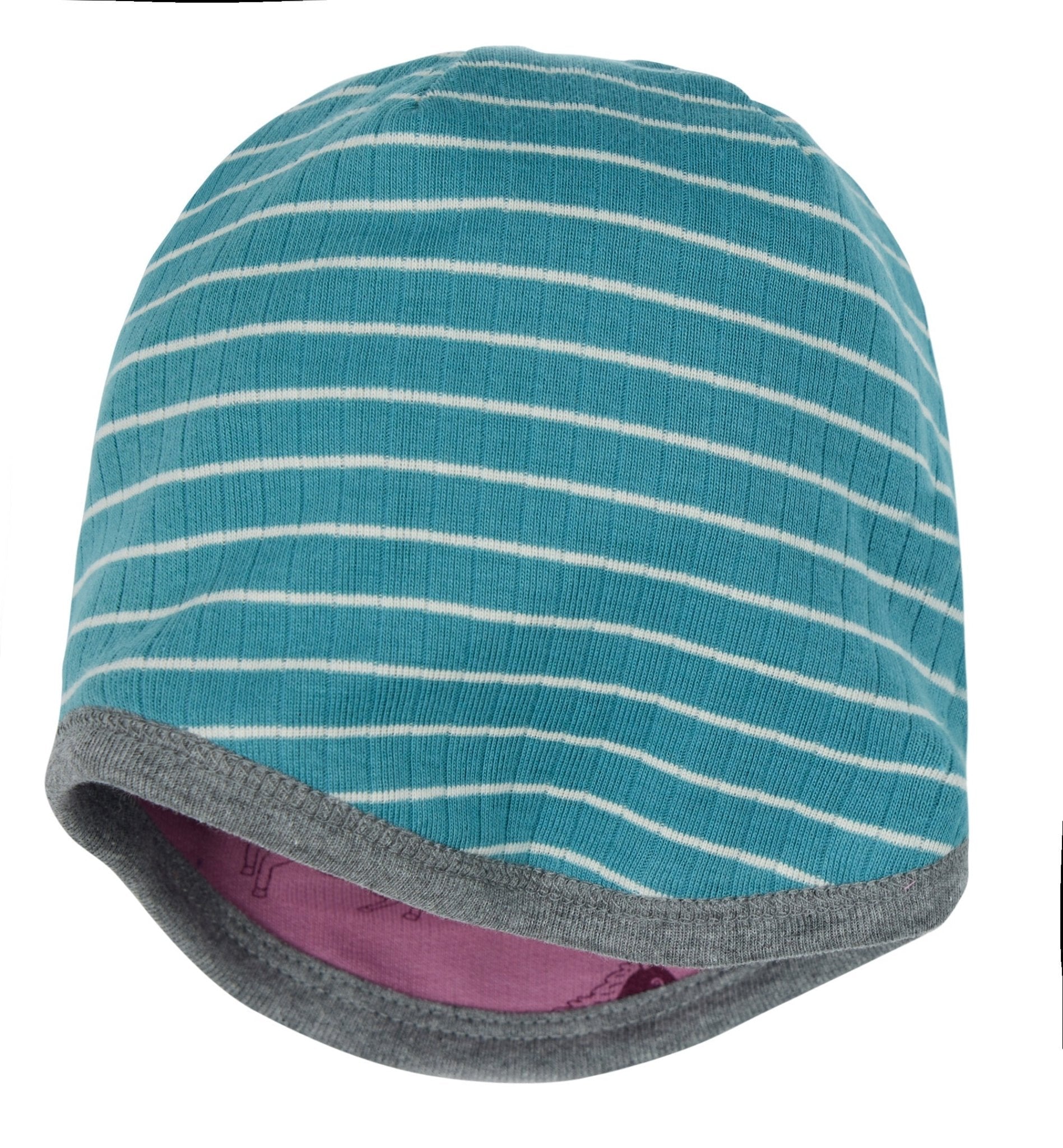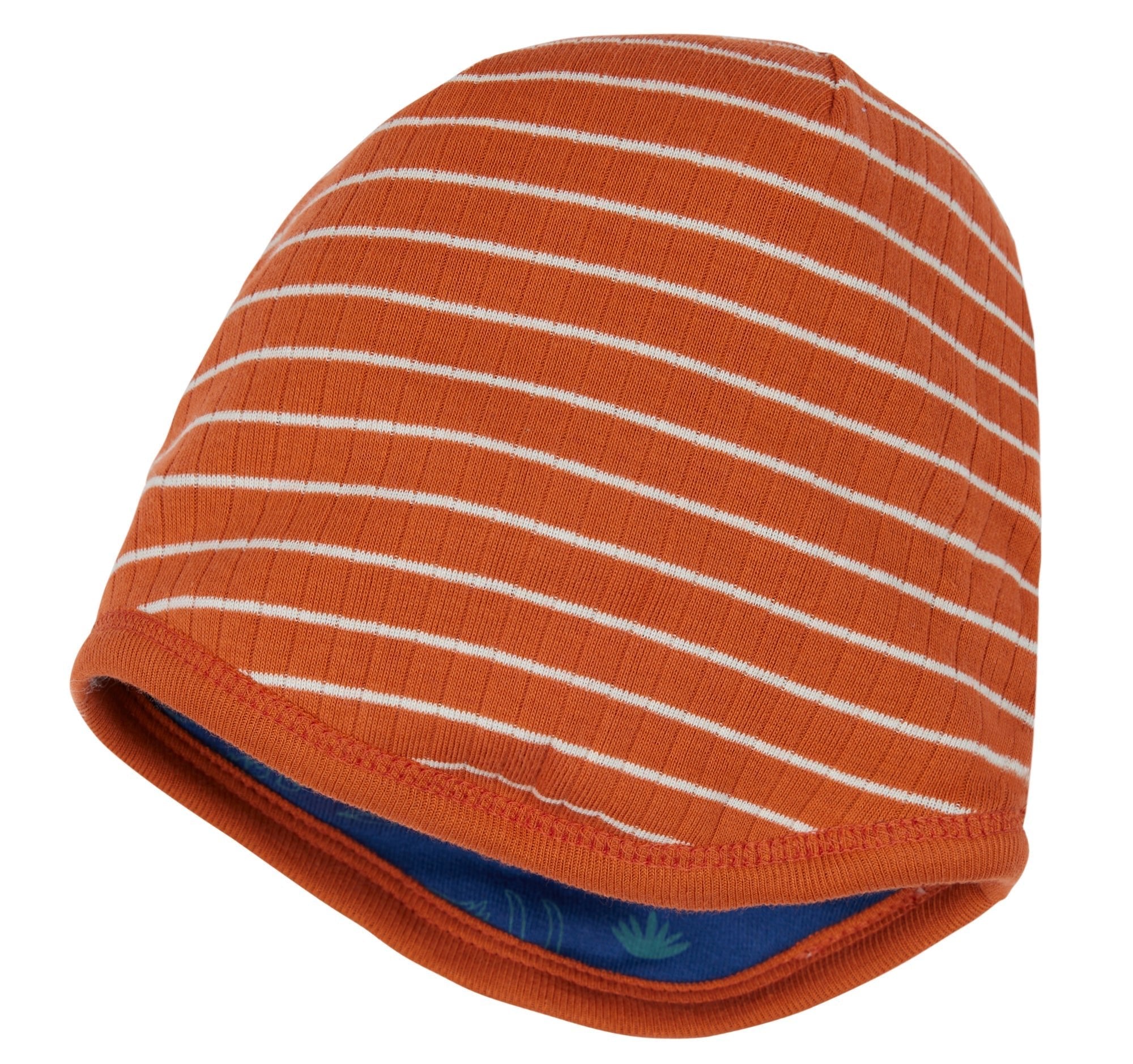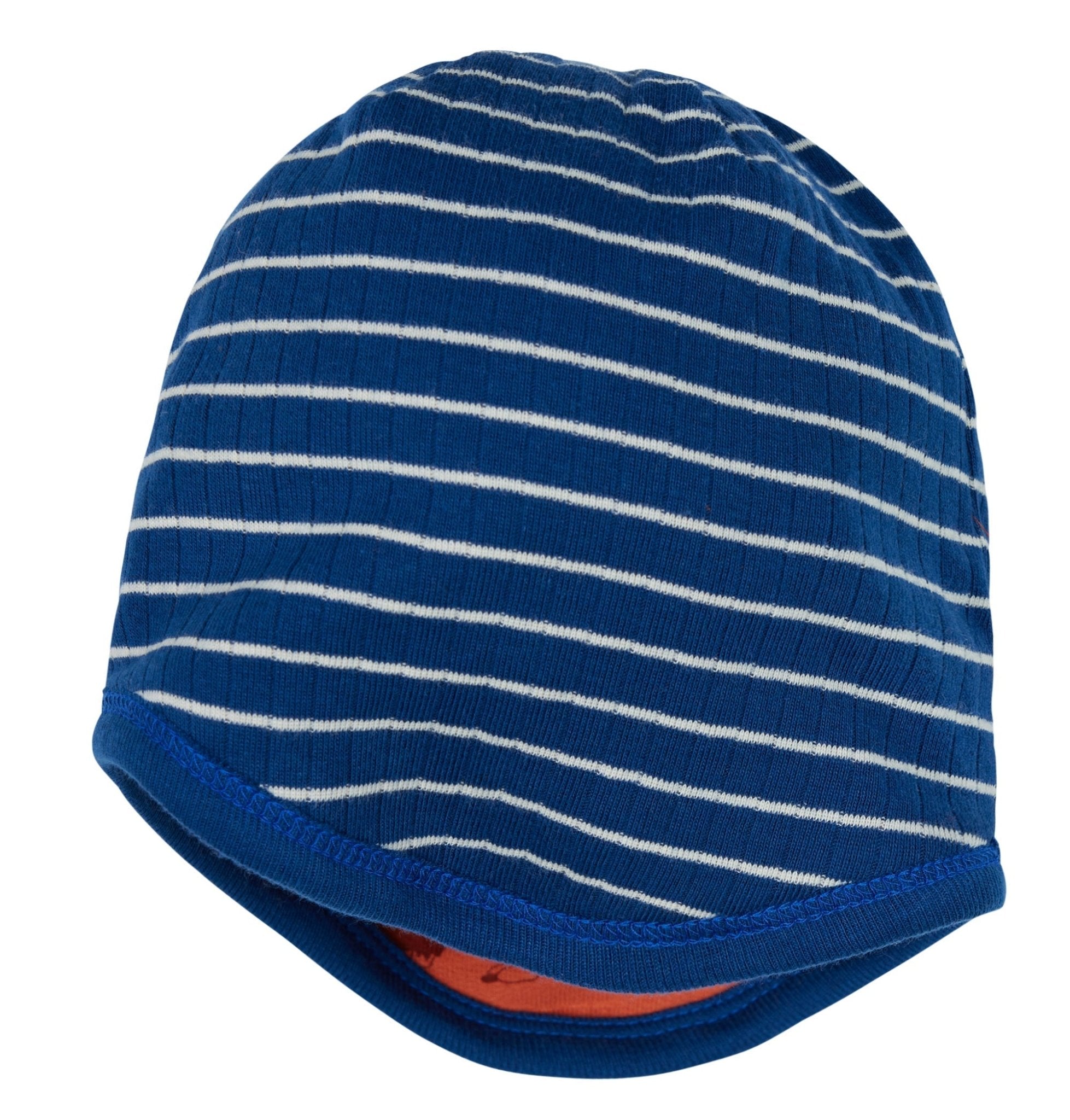 Wendemütze mit ganzflächigem Druck. Die andere Seite ist aus geringeltem Jersey gefertigt. Die Kante ist kontrastfarbig eingefasst. Vorne Logo-Etikett, hinten mit Fähnchen. Made in Portugal. Waschbar bei 30°C