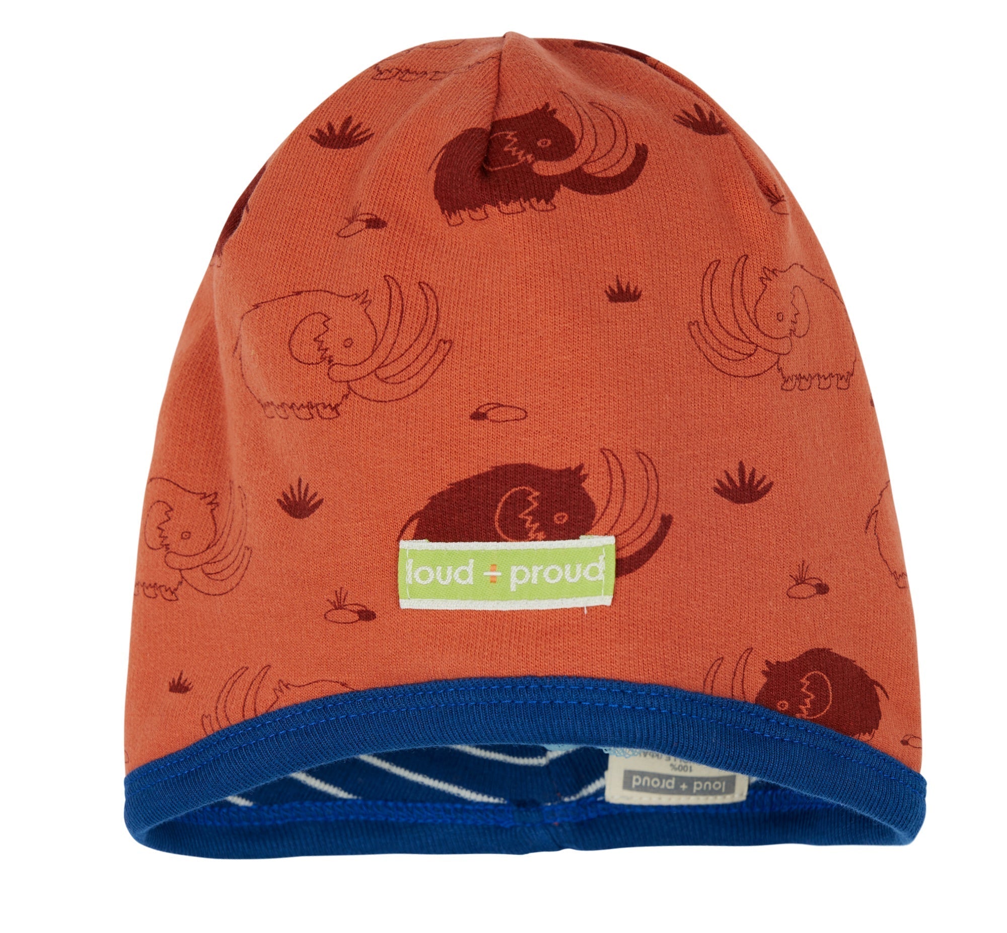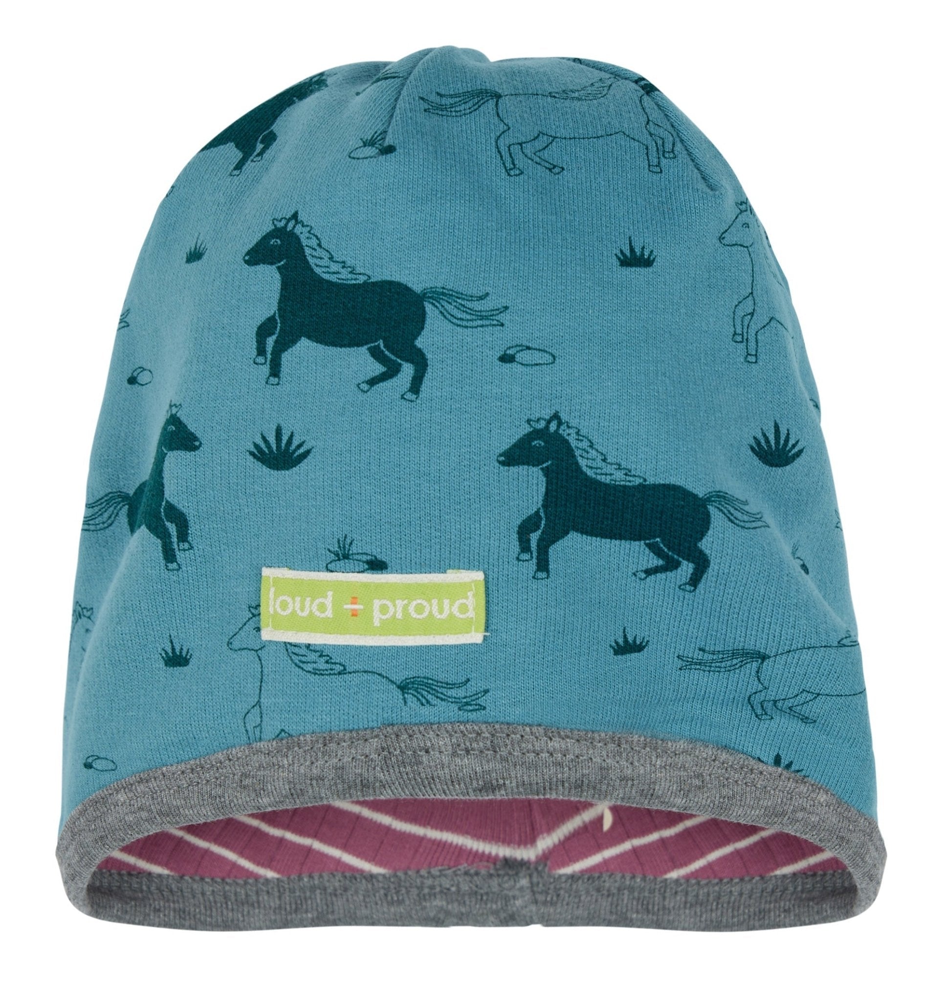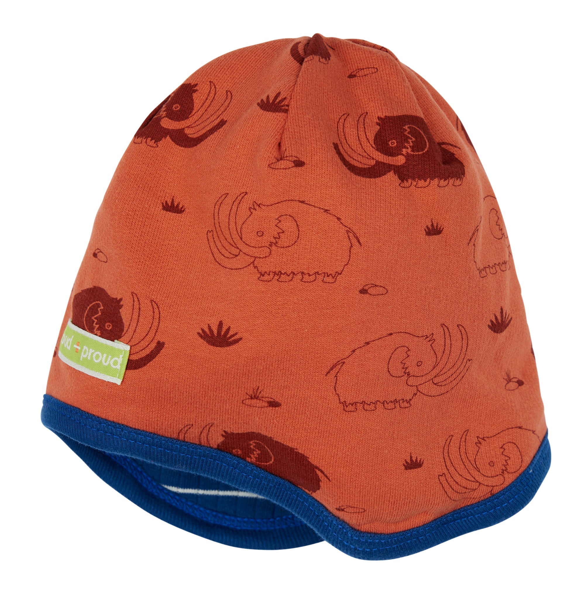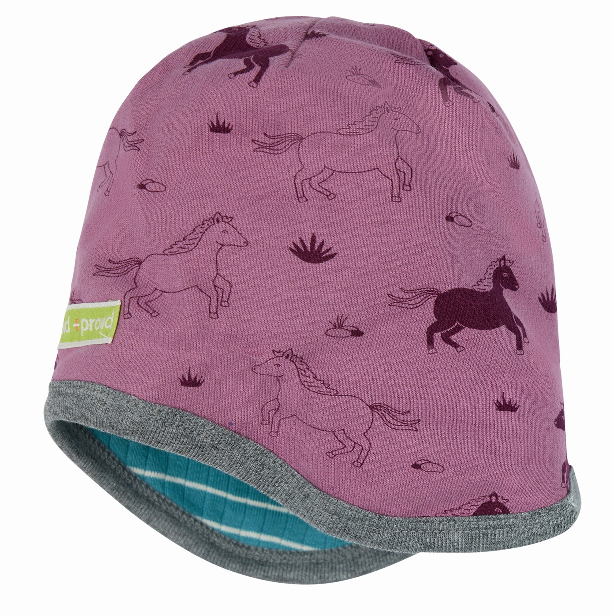 Wendemütze mit ganzflächigem Druck. Die andere Seite ist aus geringeltem Jersey gefertigt. Die Kante ist kontrastfarbig eingefasst. Vorne Logo-Etikett, hinten mit Fähnchen. Made in Portugal. Waschbar bei 30°C
