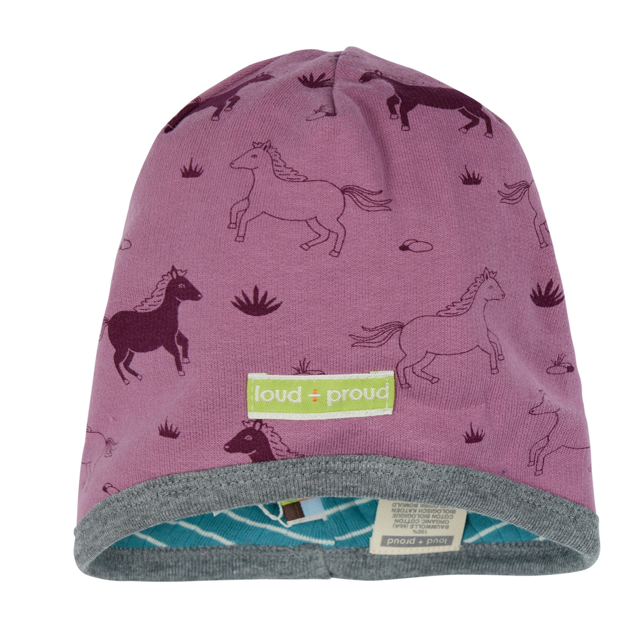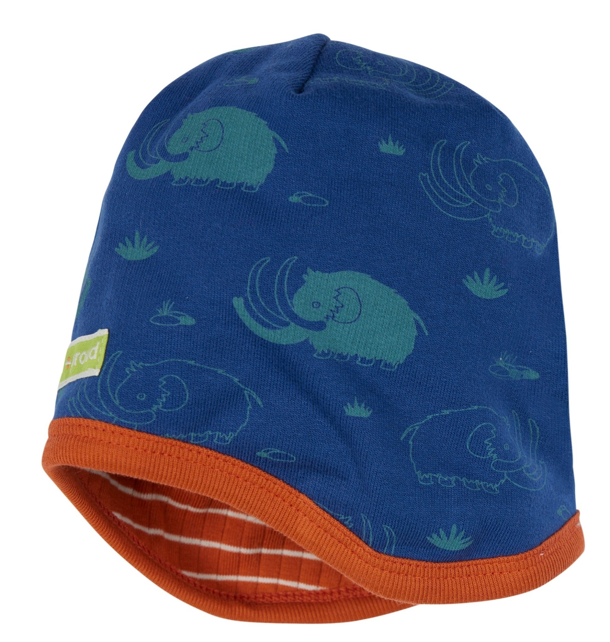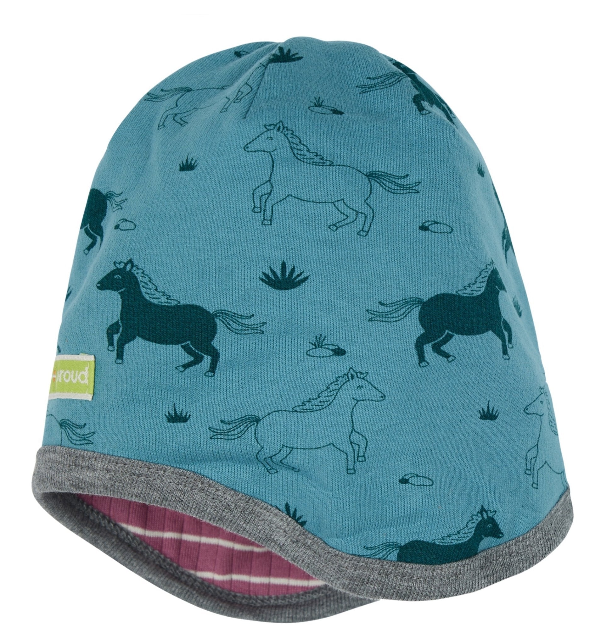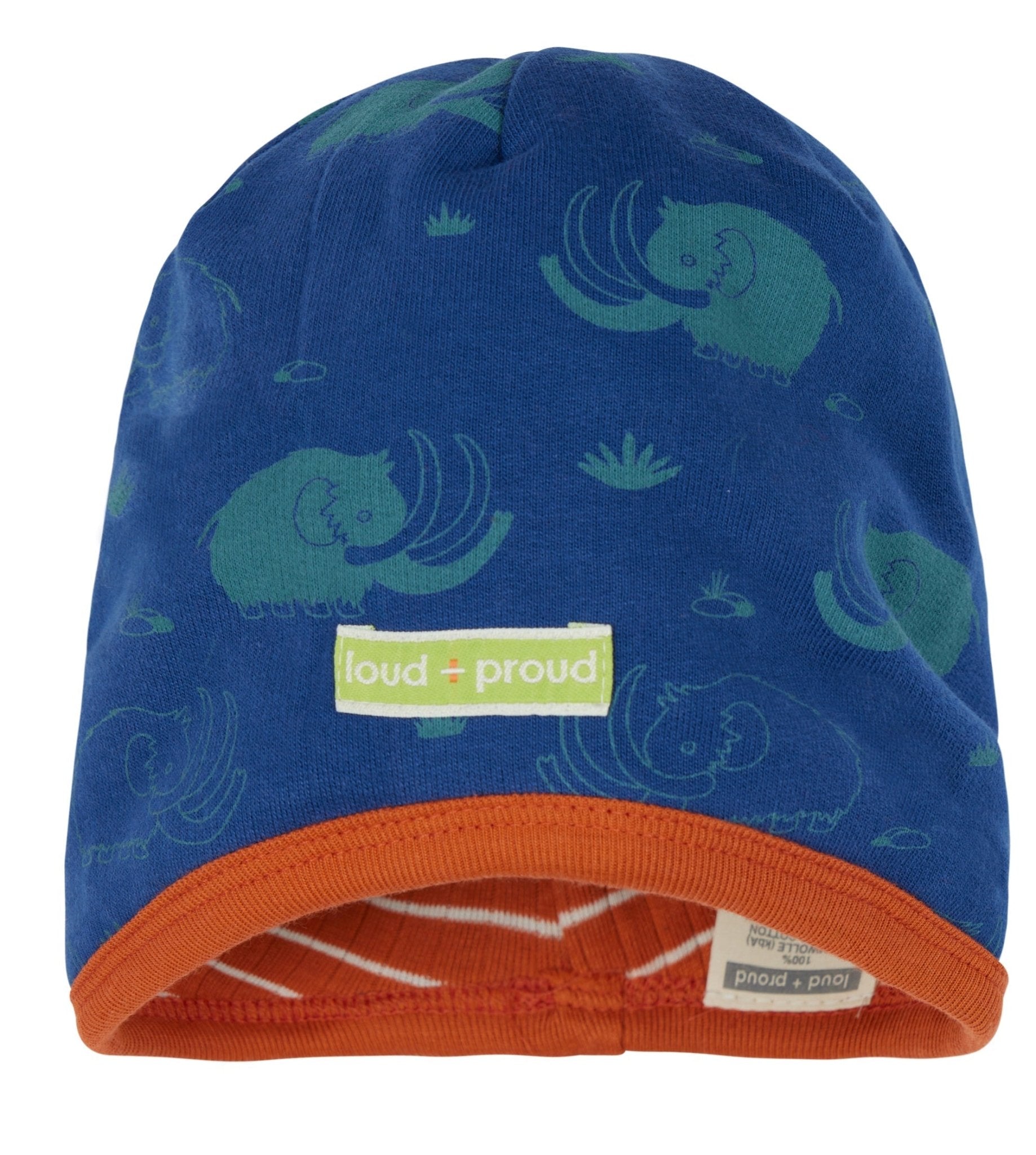 Wendemütze mit ganzflächigem Druck. Die andere Seite ist aus geringeltem Jersey gefertigt. Die Kante ist kontrastfarbig eingefasst. Vorne Logo-Etikett, hinten mit Fähnchen. Made in Portugal. Waschbar bei 30°C