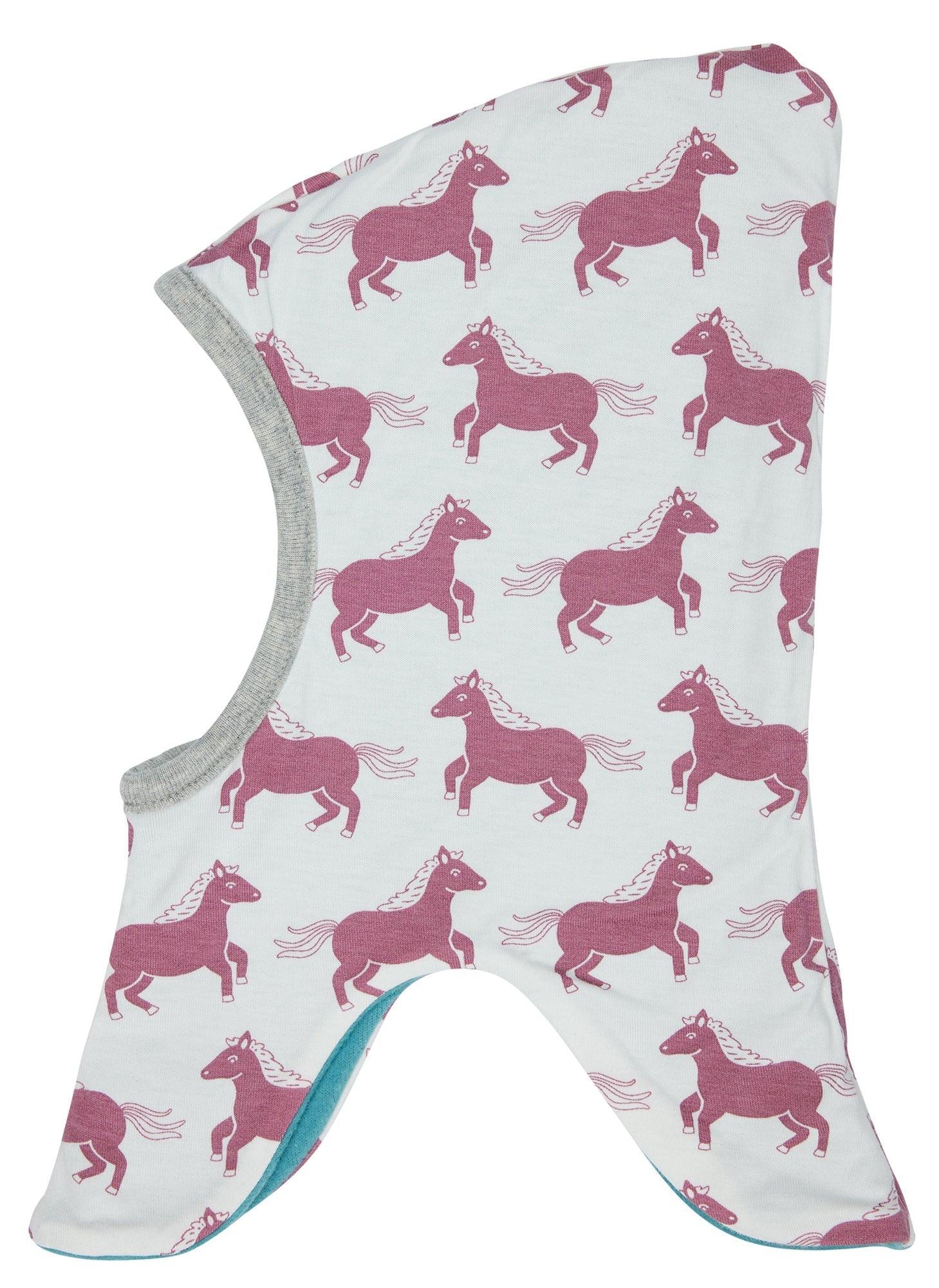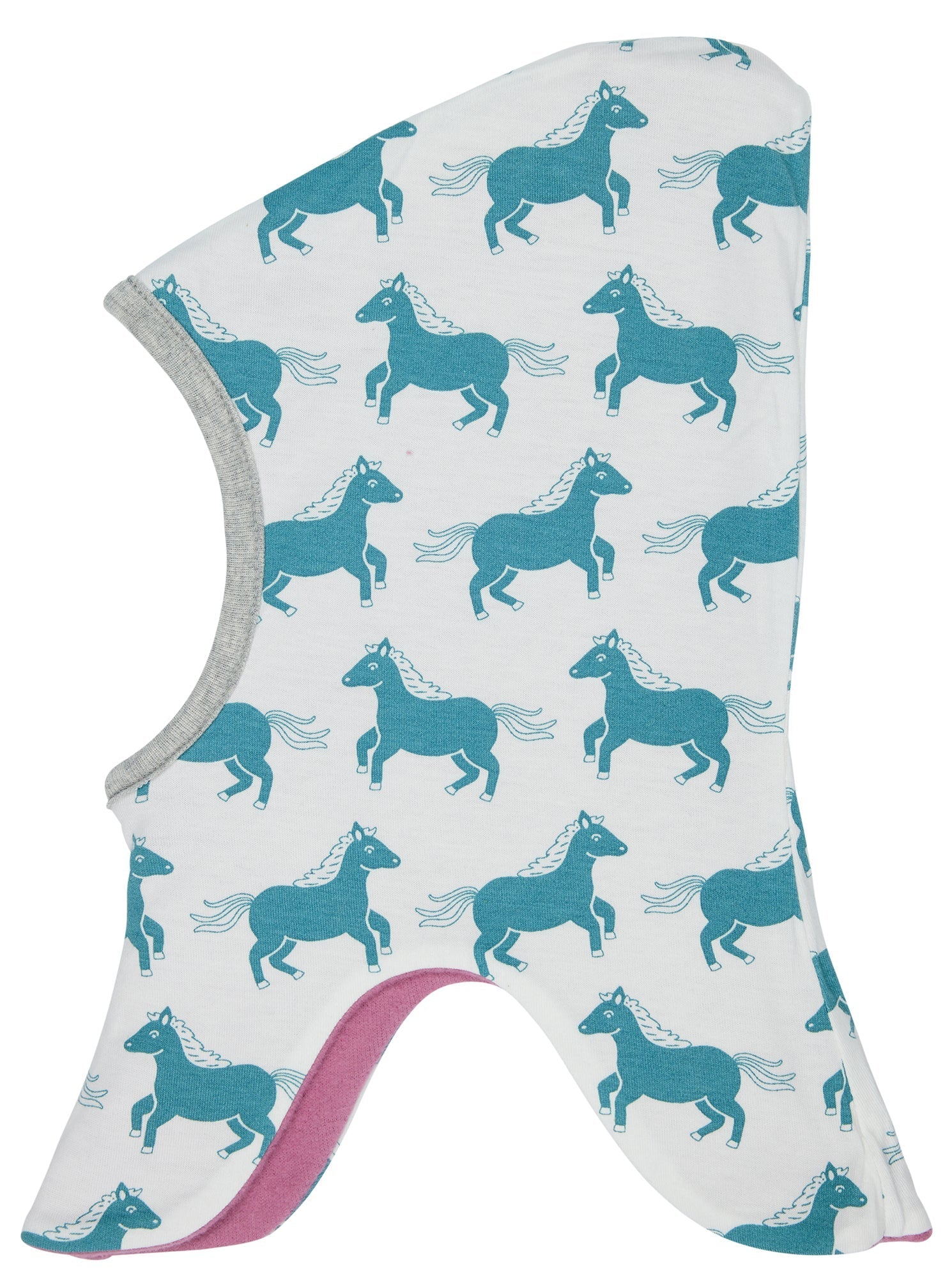 Weiche Schlupfmütze zum Wenden. Eine Seite ist aus bedrucktem Jersey, die andere Seite aus Fleece gefertigt. Vorne Logo-Etikett, hinten mit Fähnchen. Made in Portugal. Waschbar bei 30°C