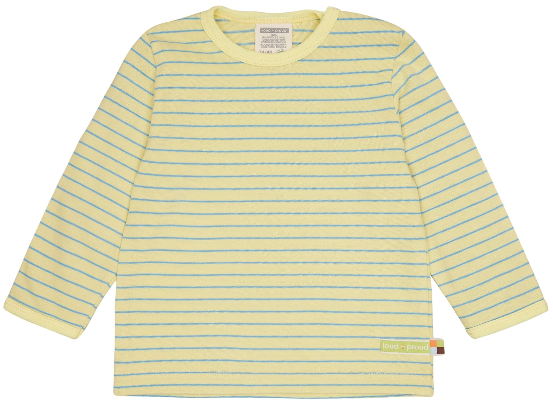 Gestreiftes Shirt aus weichem Jersey mit geschmirgelter Oberfläche. Bis Größe 86/92 linke Schulter mit verdecktem Druckknopfverschluß. Fähnchen an der Seitennaht. Made in Portugal. Waschbar bei 30°C.