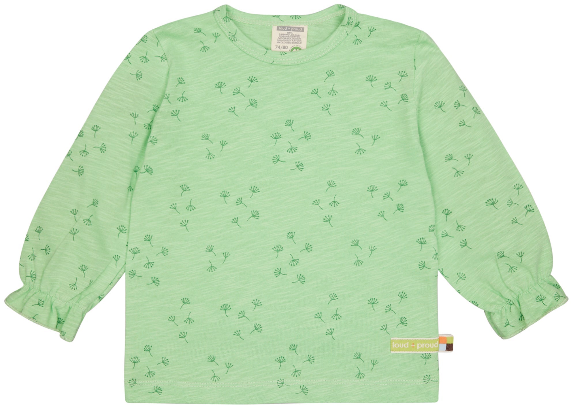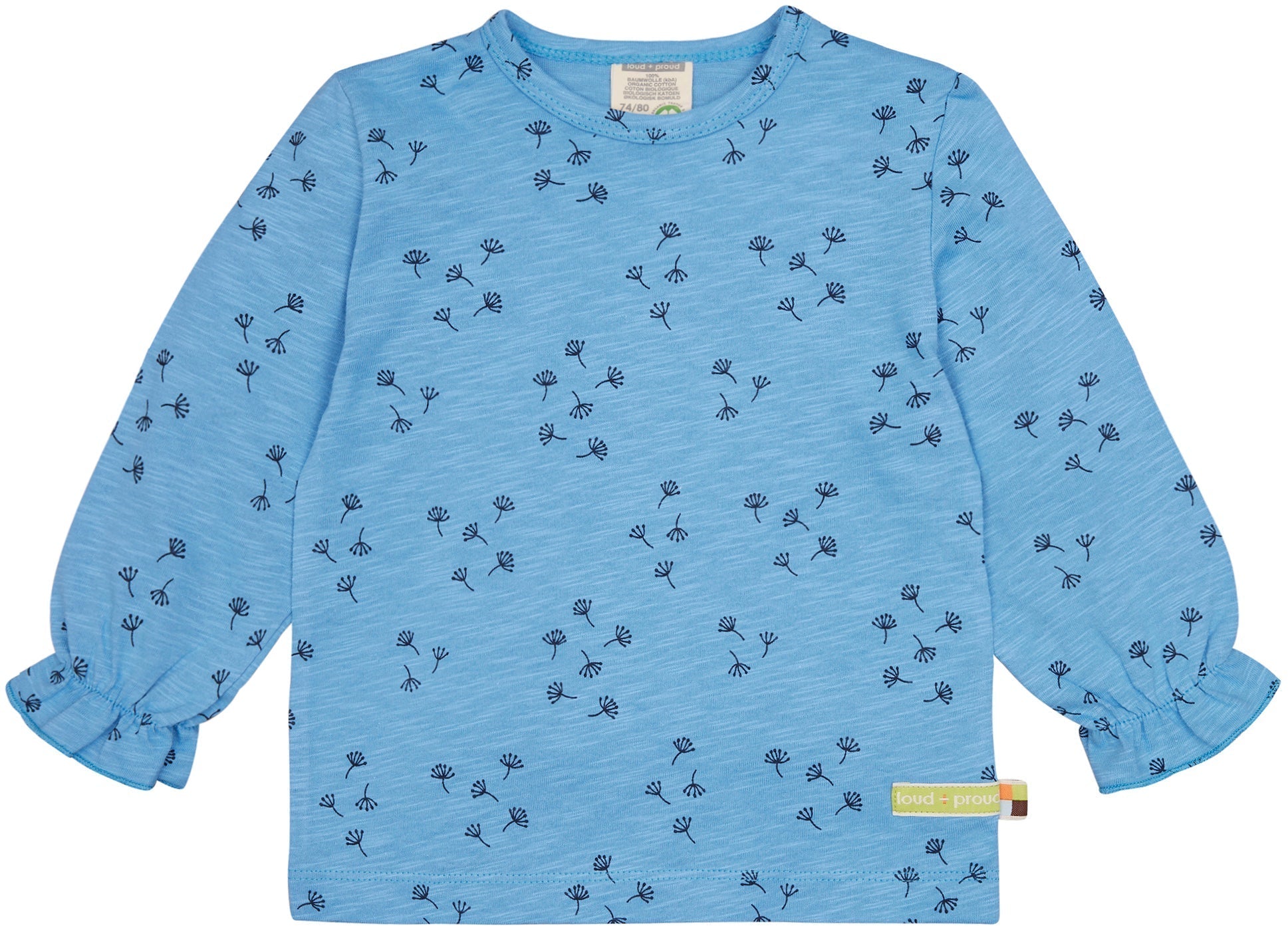 Shirt aus Slub Jersey mit ganzflächigem Druck (Wasserbasierender Druck). Ärmelbündchen gerüscht. Bis Größe 86/92 linke Schulter mit verdecktem Druckknopfverschluß. Fähnchen an der Seitennaht. Made in Portugal. Waschbar bei 30°C.