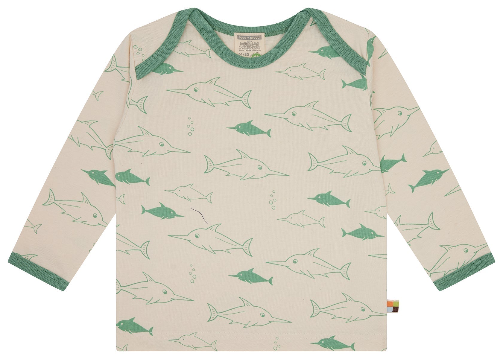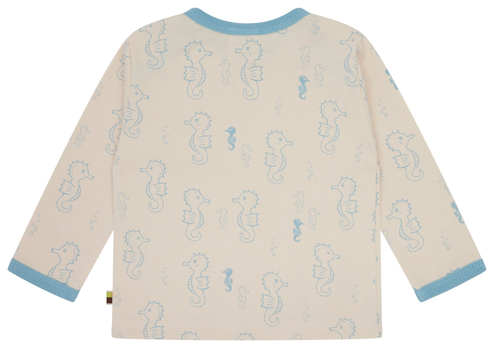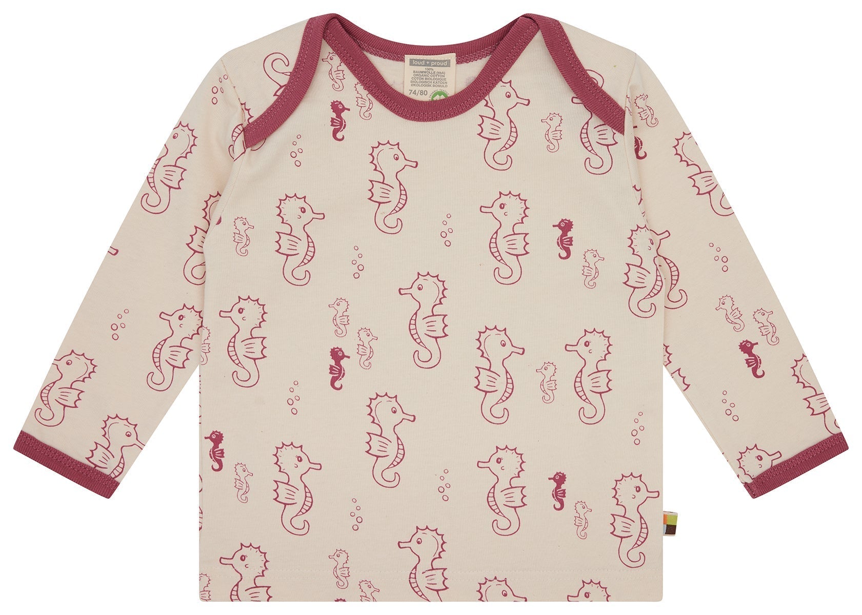 Langarm Shirt aus ungefärbtem weichem Single Jersey mit ganzflächig aufgedrucktem Tiermotiv (Wasserbasierender Druck). Alle Kanten sind mit Feinripp in Kontrastfarbe eingefasst. Bis Größe 86/92 weit zu öffnendes Halsloch, ab Größe 98/104 Rundhals-Ausschnitt. Fähnchen an der Seitennaht. Made in Hungary. Waschbar bei 30°C.