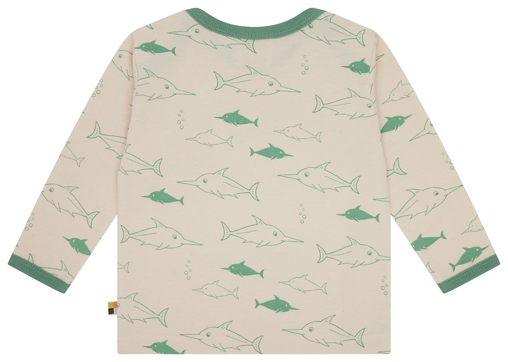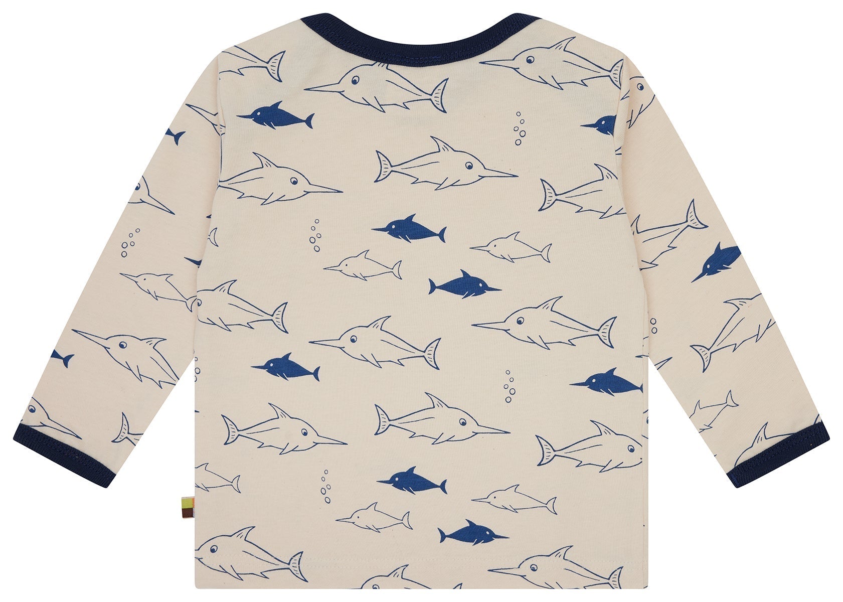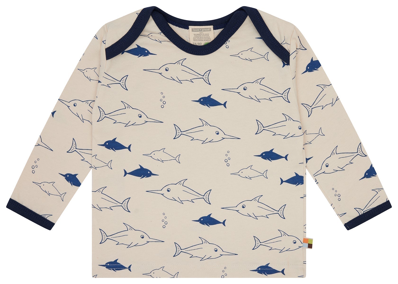 Langarm Shirt aus ungefärbtem weichem Single Jersey mit ganzflächig aufgedrucktem Tiermotiv (Wasserbasierender Druck). Alle Kanten sind mit Feinripp in Kontrastfarbe eingefasst. Bis Größe 86/92 weit zu öffnendes Halsloch, ab Größe 98/104 Rundhals-Ausschnitt. Fähnchen an der Seitennaht. Made in Hungary. Waschbar bei 30°C.