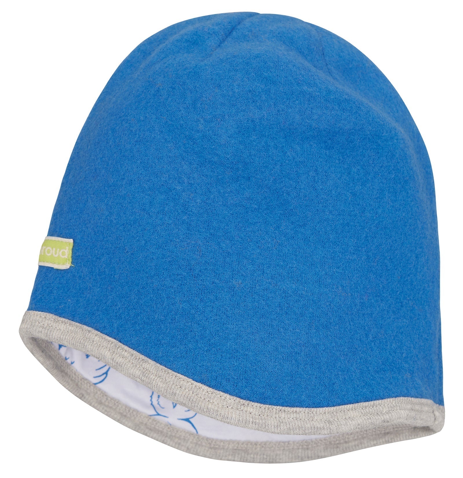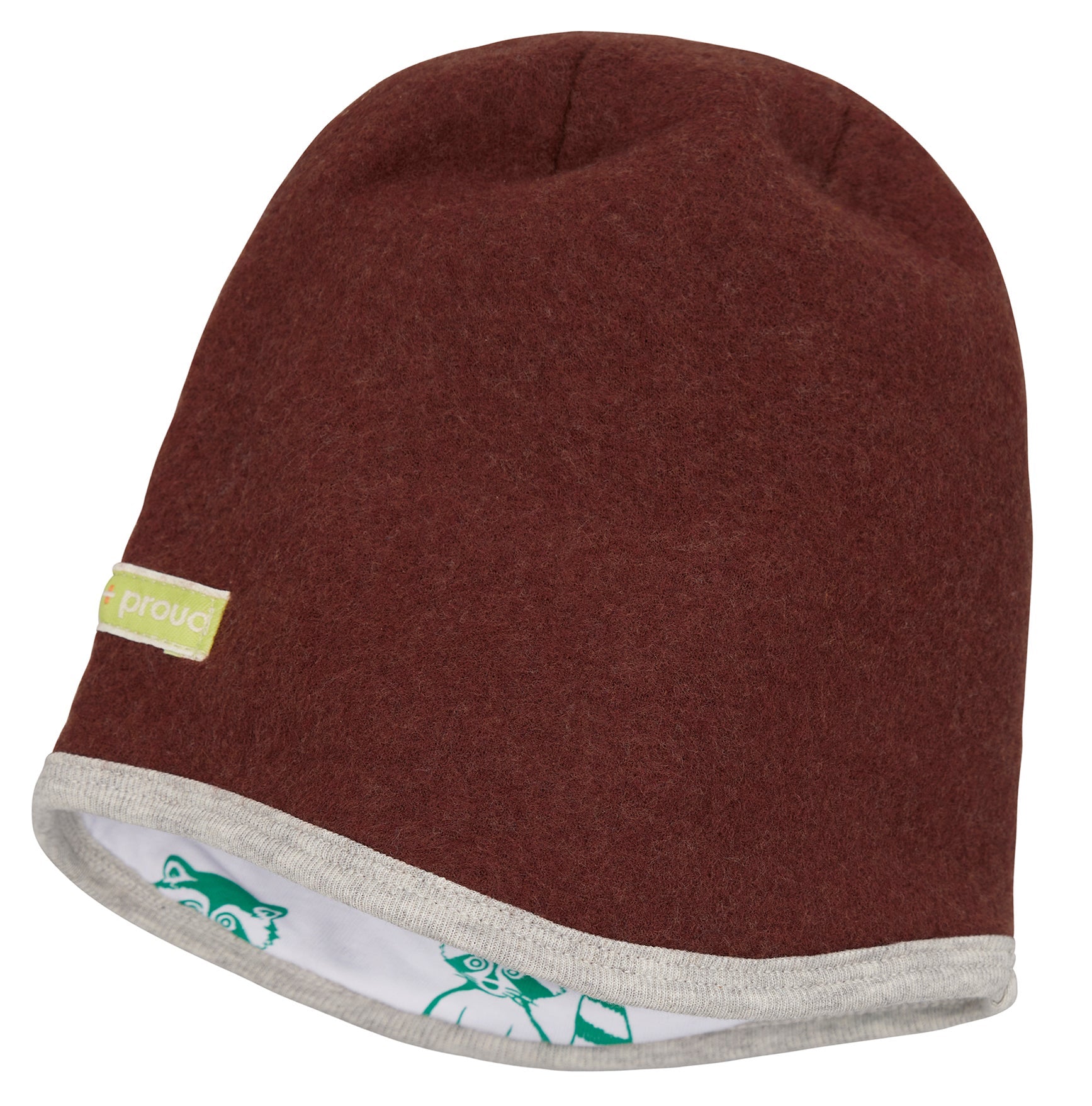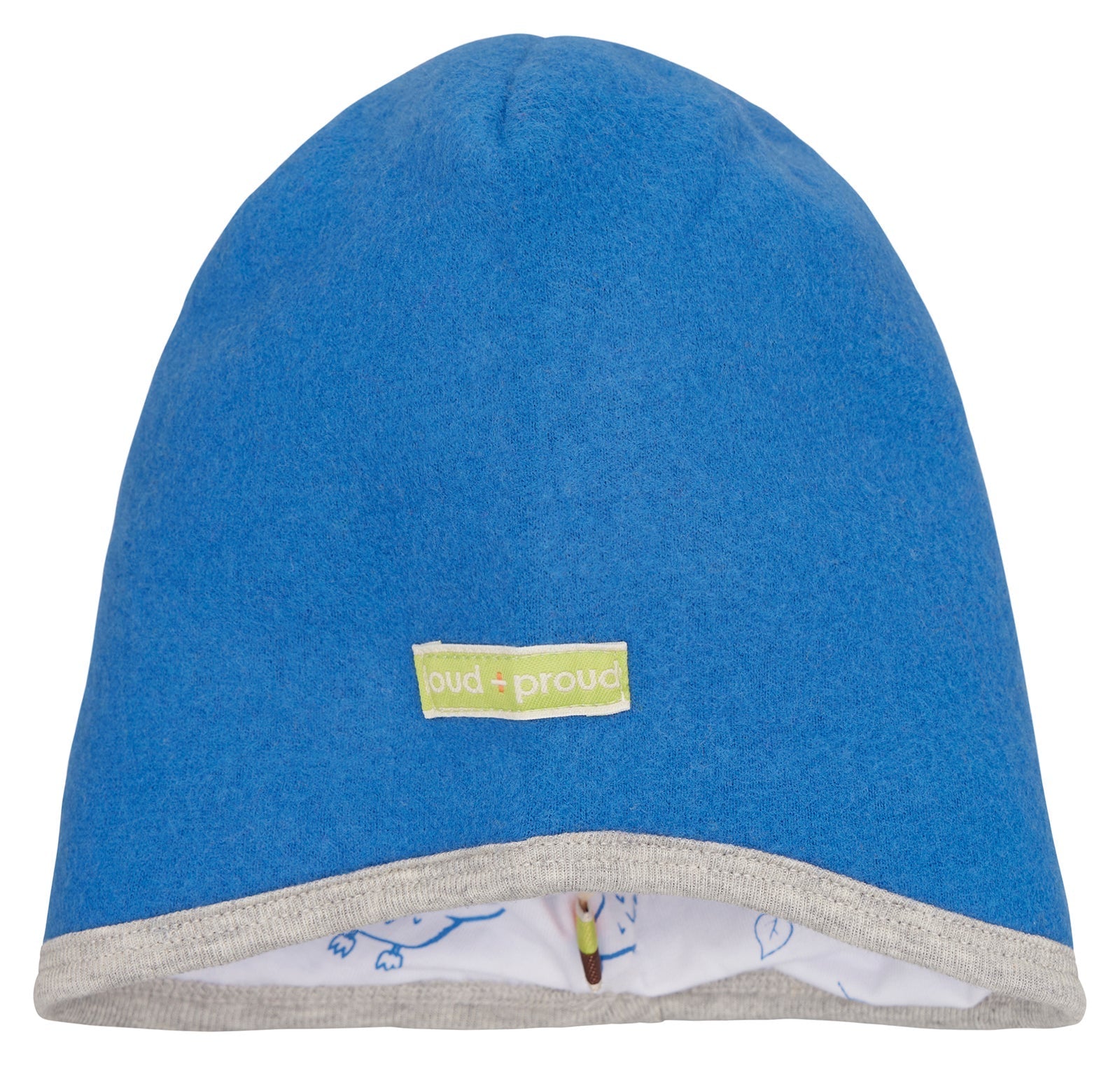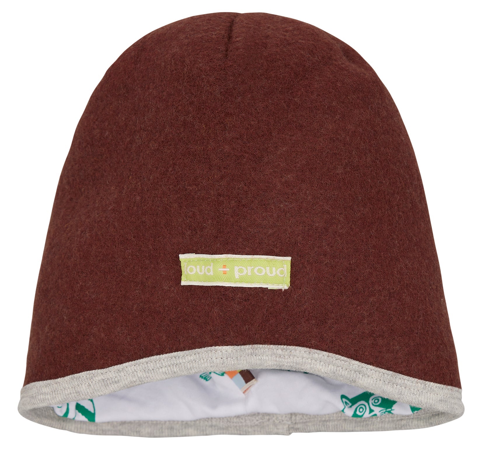 Wendemütze aus dickem, warmen Bio Woll-Fleece. Innen mit bedrucktem Baumwoll-Jersey abgefüttert. Die Kante ist kontrastfarbig eingefasst. Vorne Logo-Etikett, hinten mit Fähnchen. Waschbar bei 30°C im Wollwaschgang. Nicht schleudern und nass in Form ziehen. Made in Hungary.