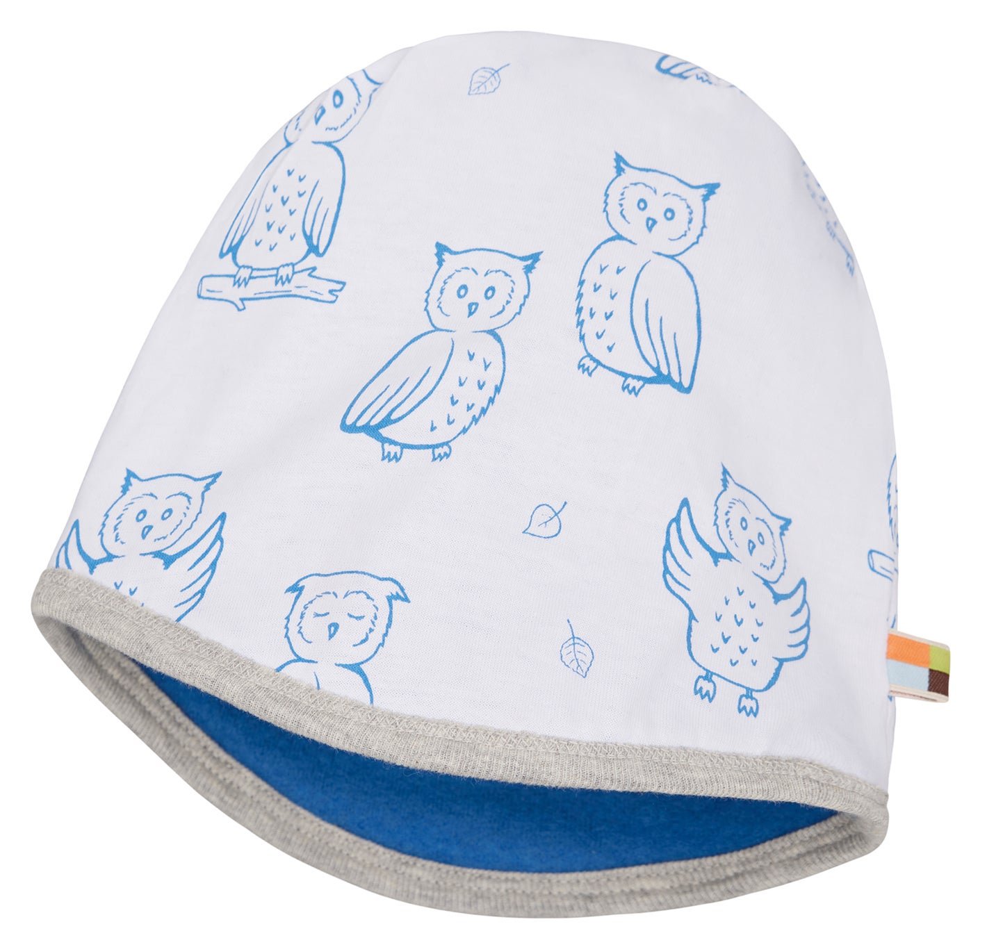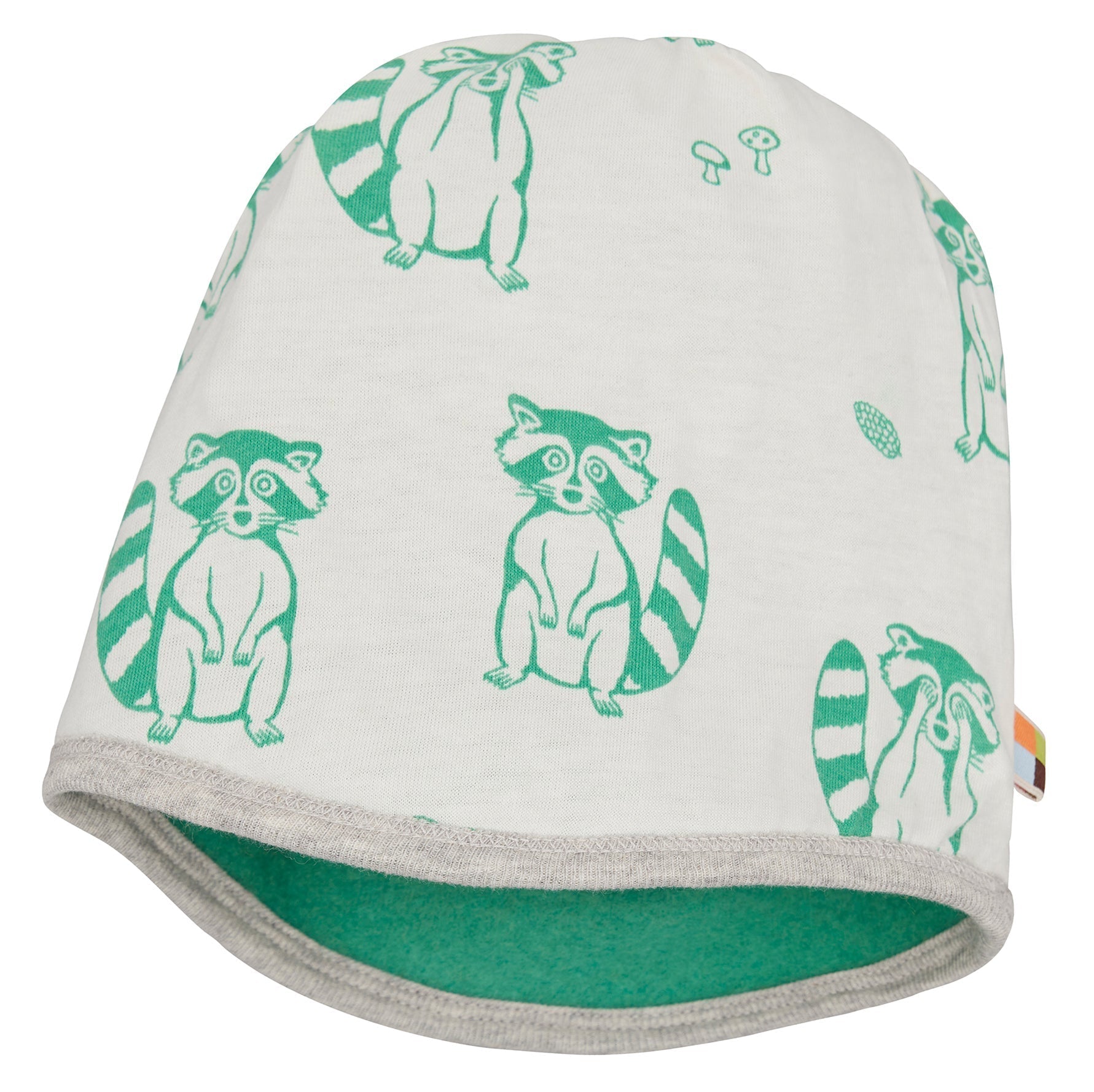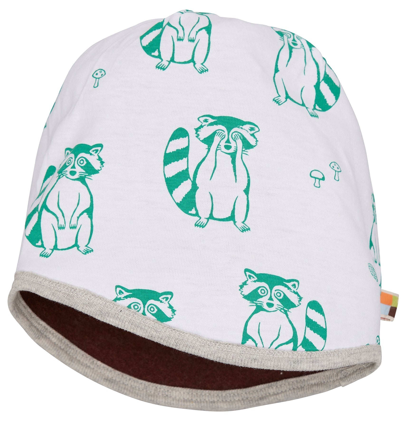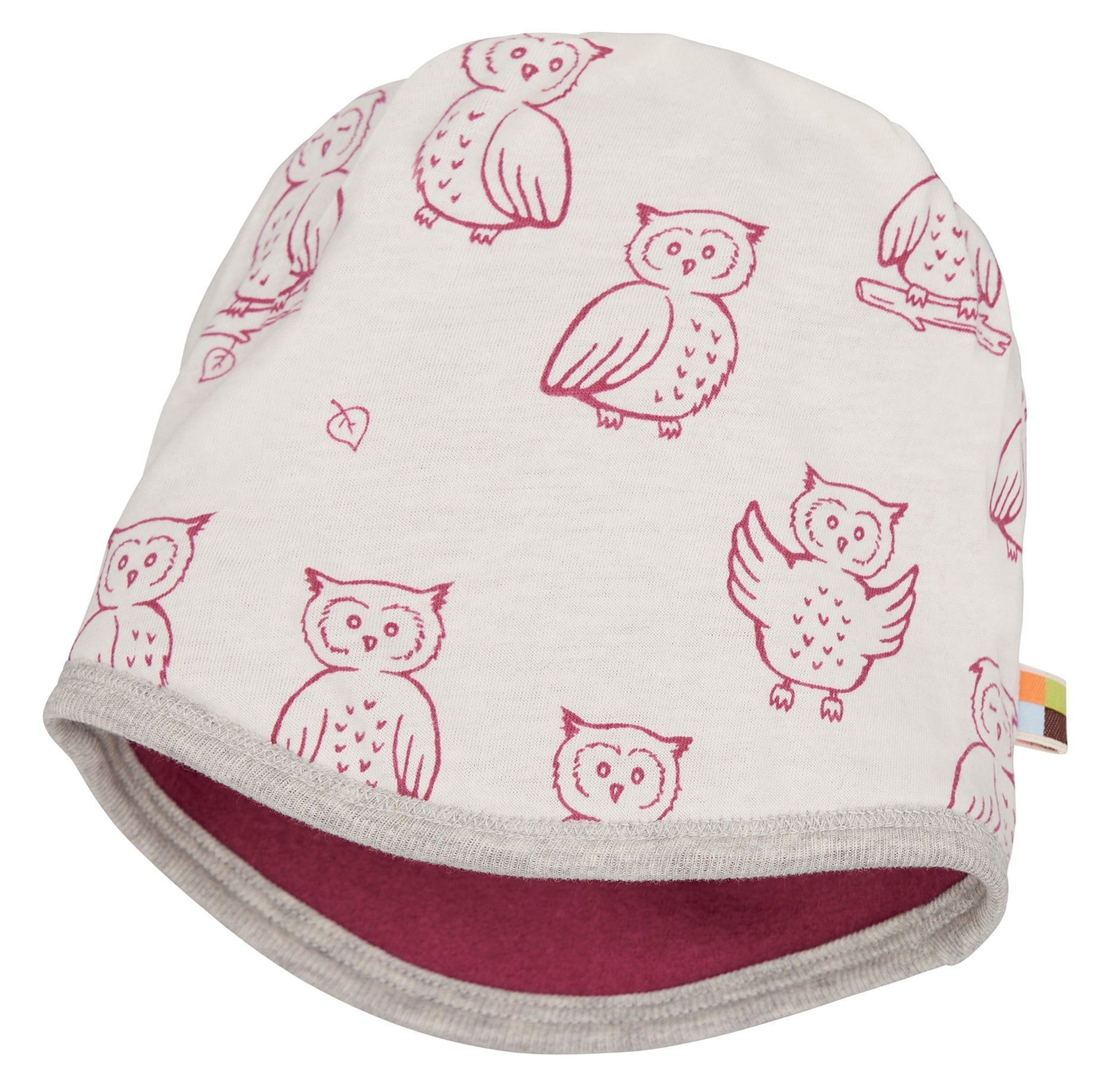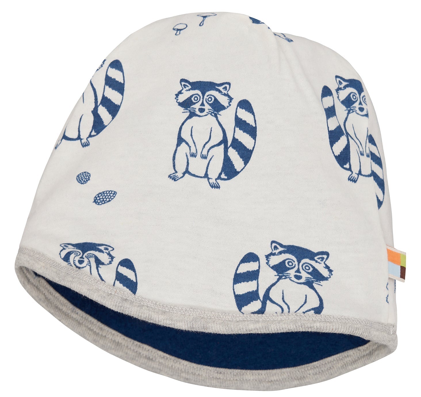 Wendemütze aus dickem, warmen Bio Woll-Fleece. Innen mit bedrucktem Baumwoll-Jersey abgefüttert. Die Kante ist kontrastfarbig eingefasst. Vorne Logo-Etikett, hinten mit Fähnchen. Waschbar bei 30°C im Wollwaschgang. Nicht schleudern und nass in Form ziehen. Made in Hungary.