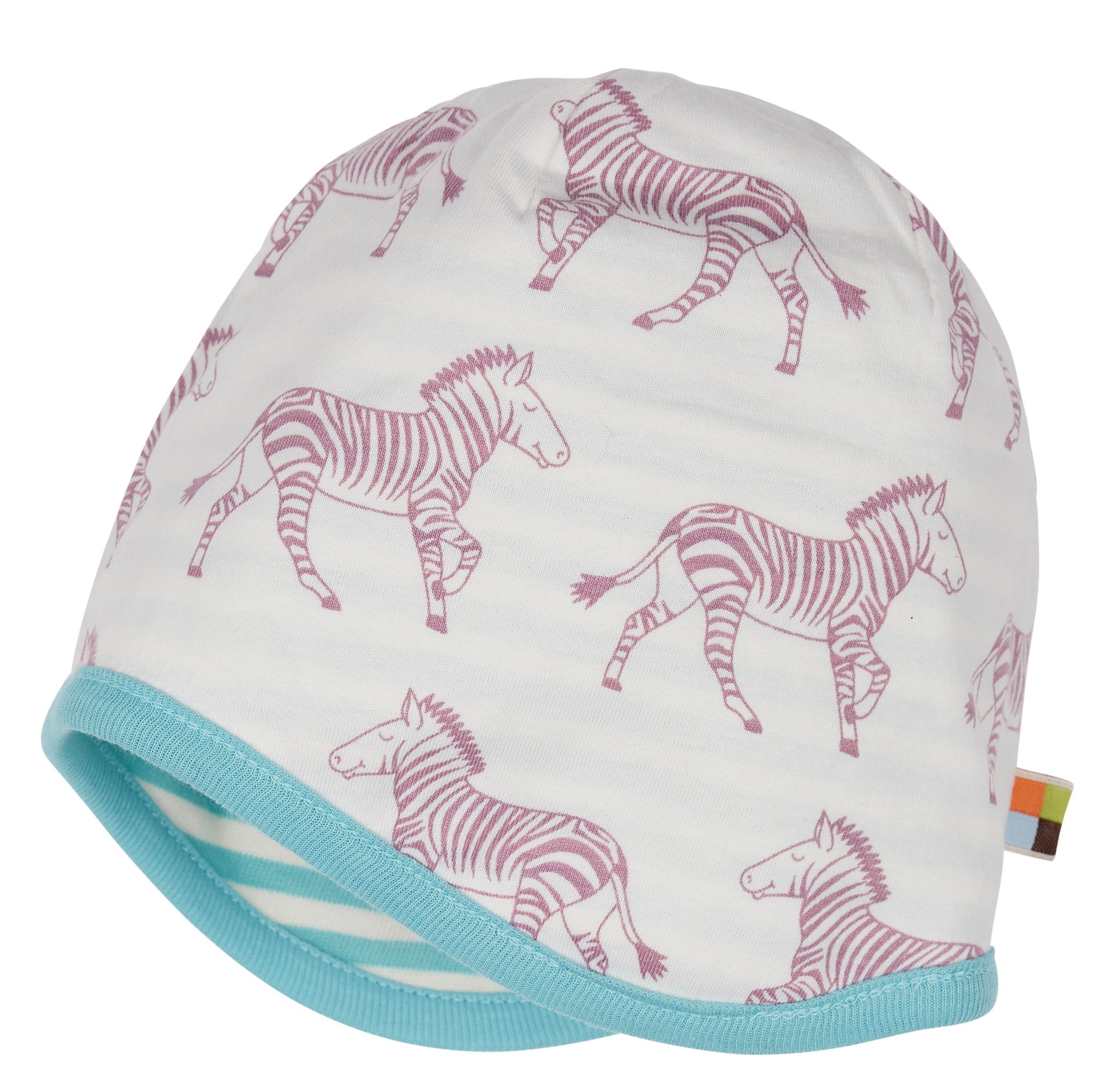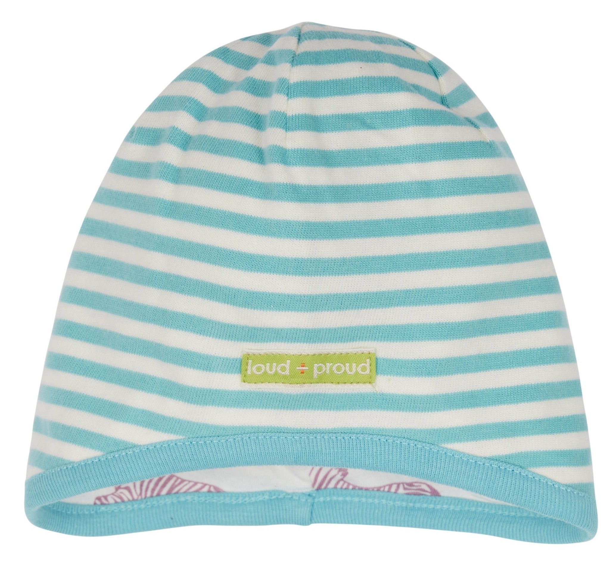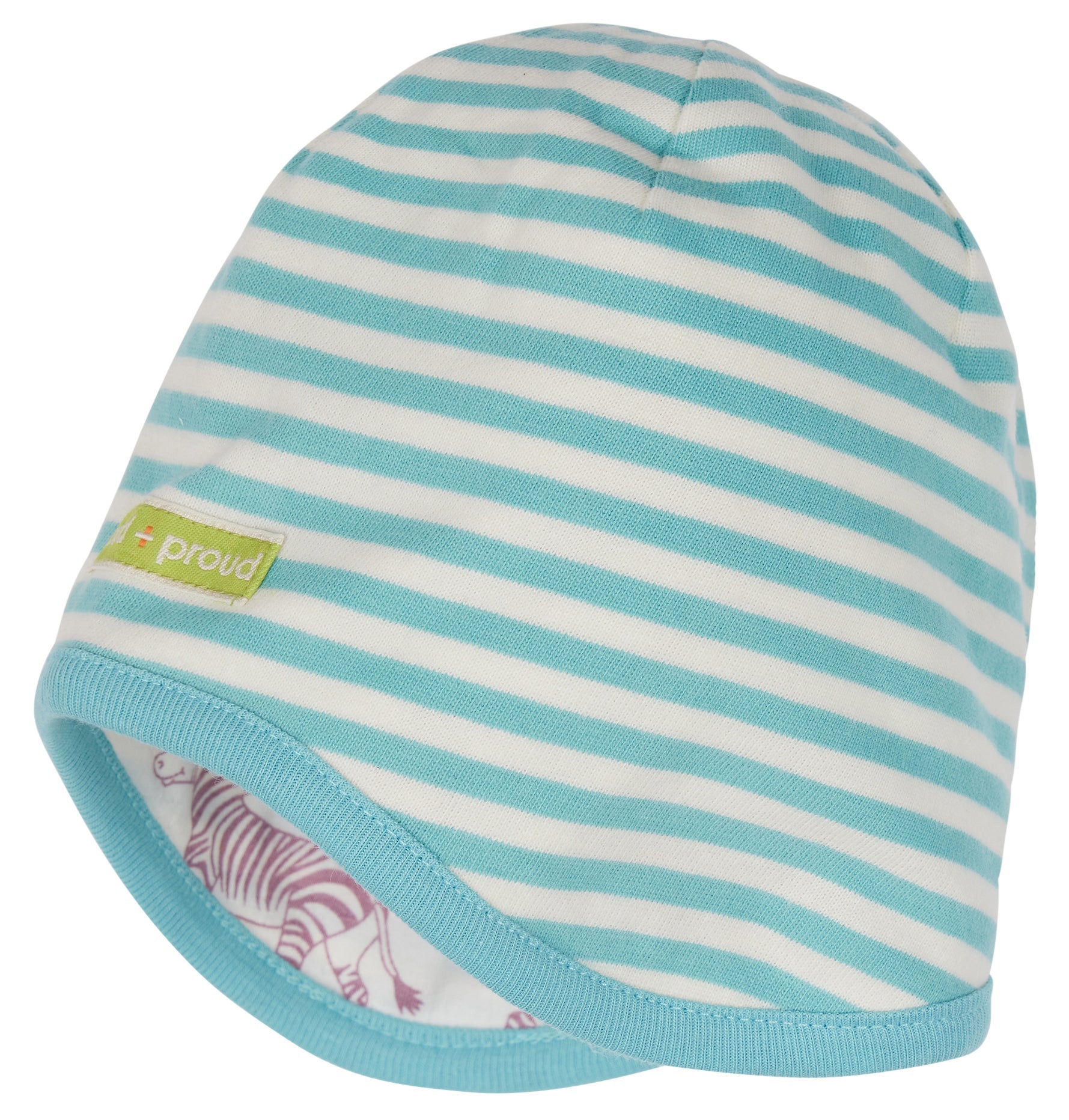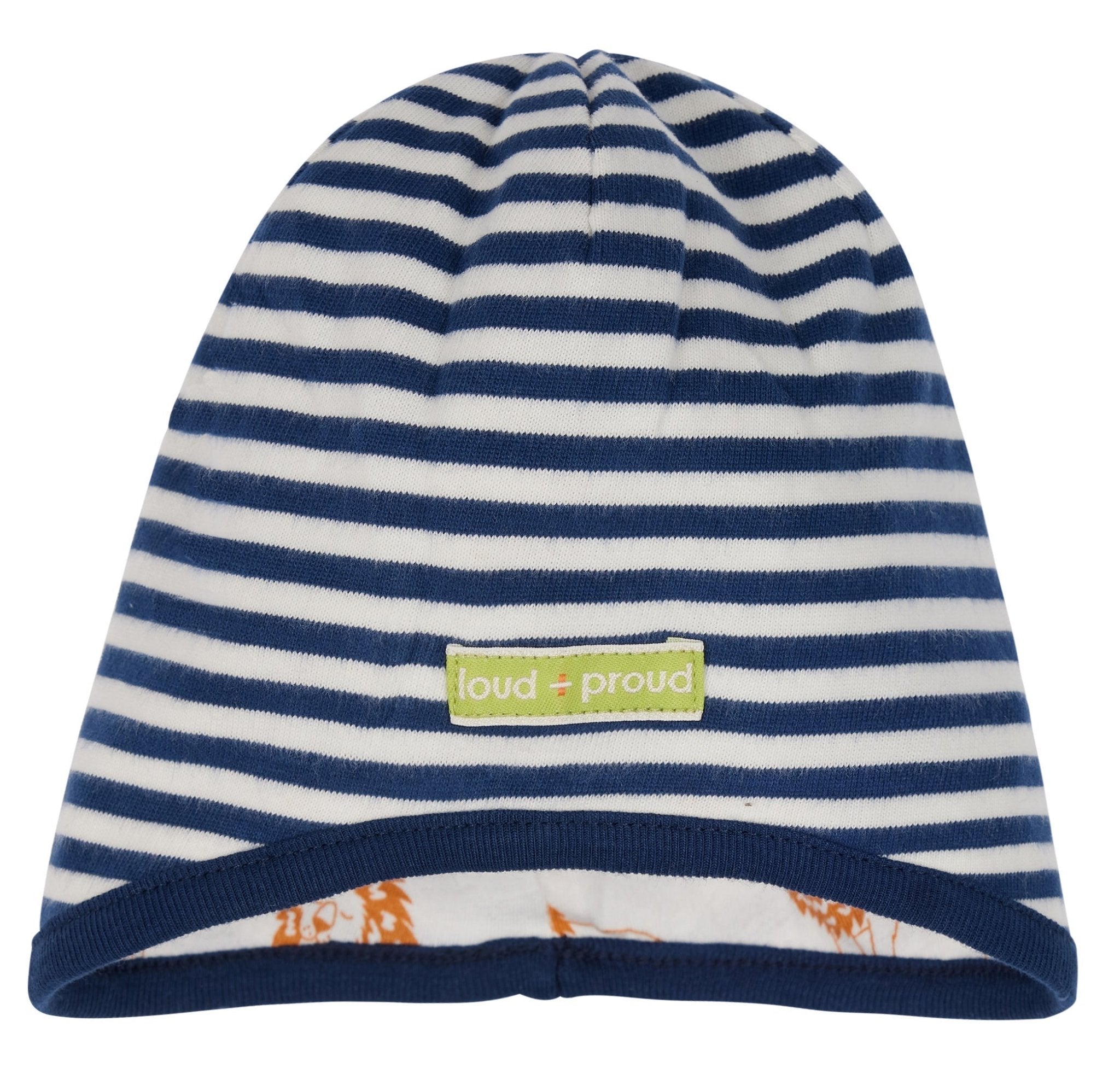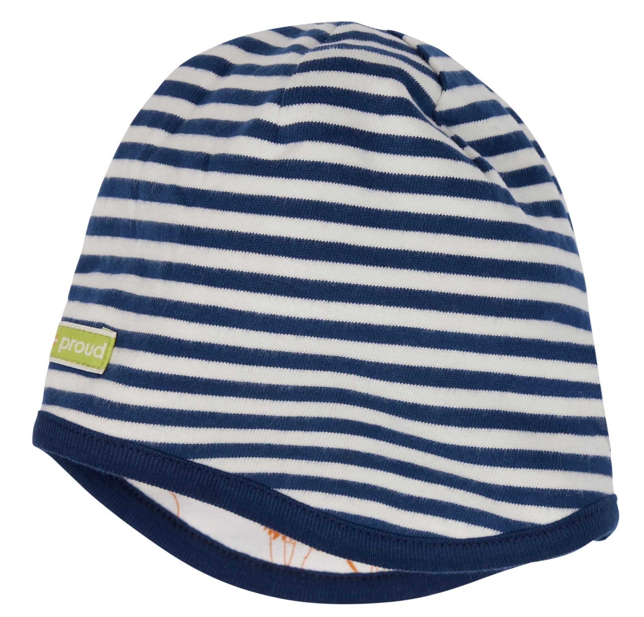 Weiche Wendemütze. Eine Seite ist aus bedrucktem Jersey, die andere Seite aus geringeltem Jersey mit geschmirgelter Oberfläche gefertigt. Die Kante ist kontrastfarbig eingefasst. Vorne Logo-Etikett, hinten mit Fähnchen. Made in Portugal. Waschbar bei 30°C