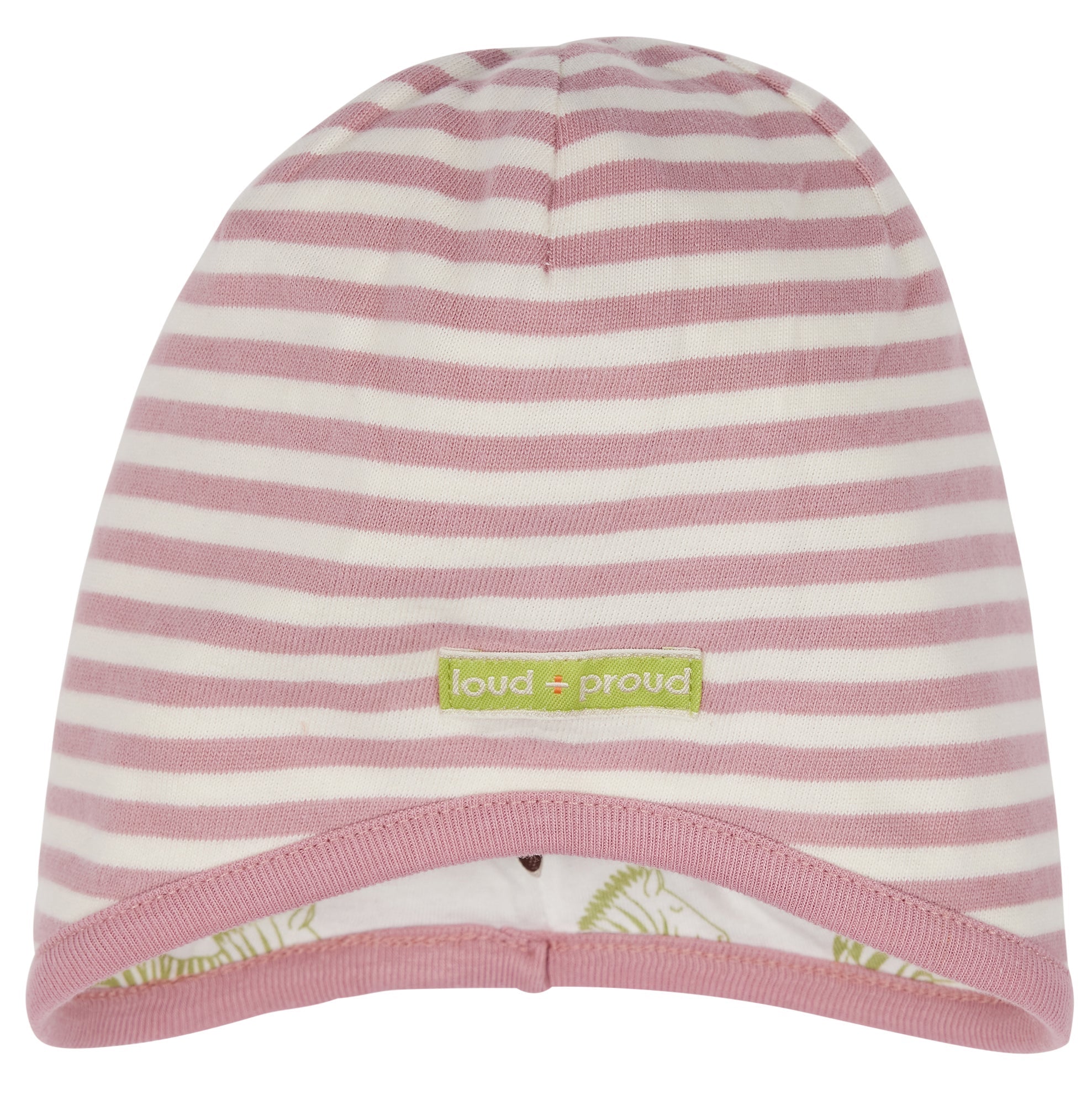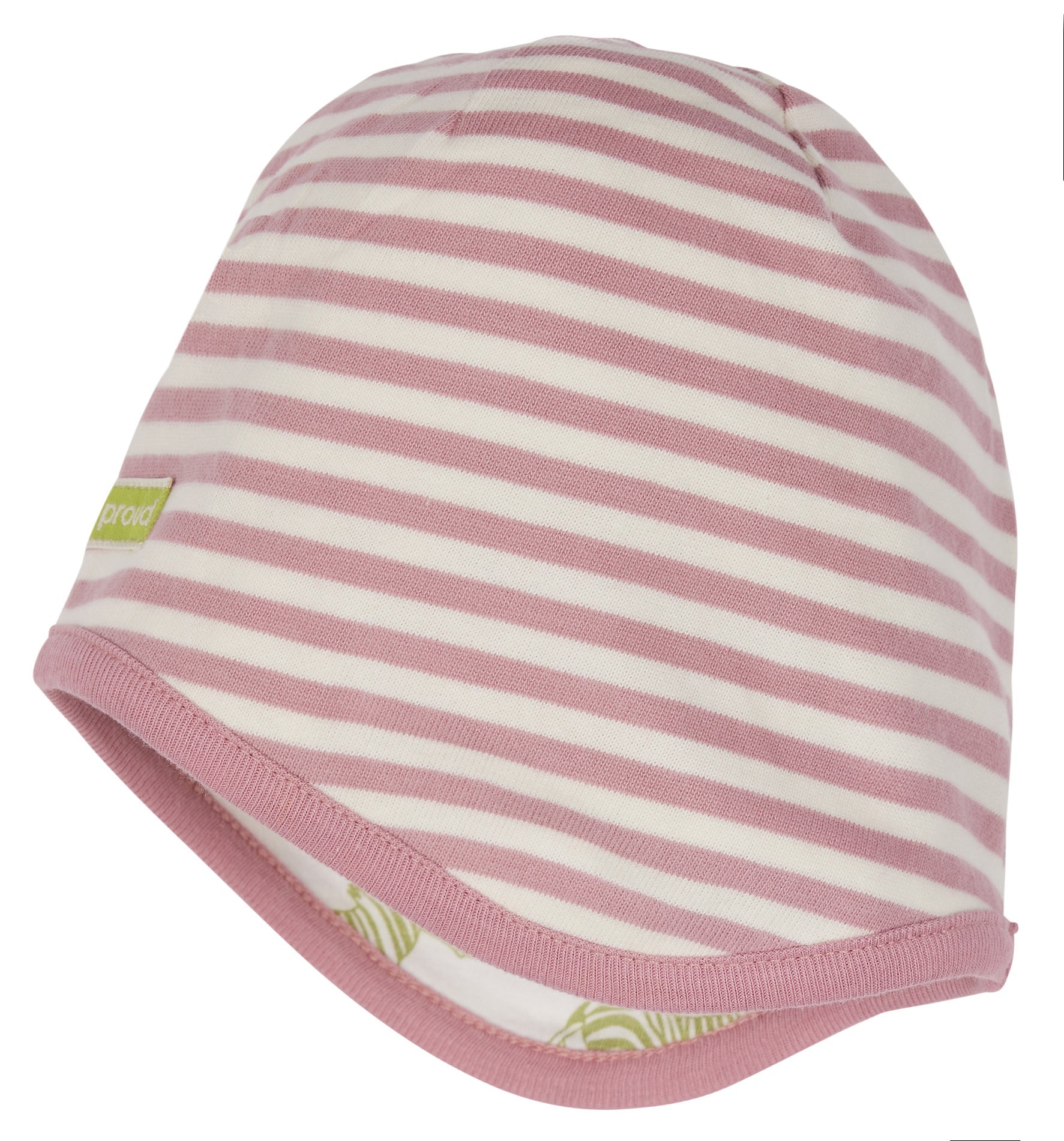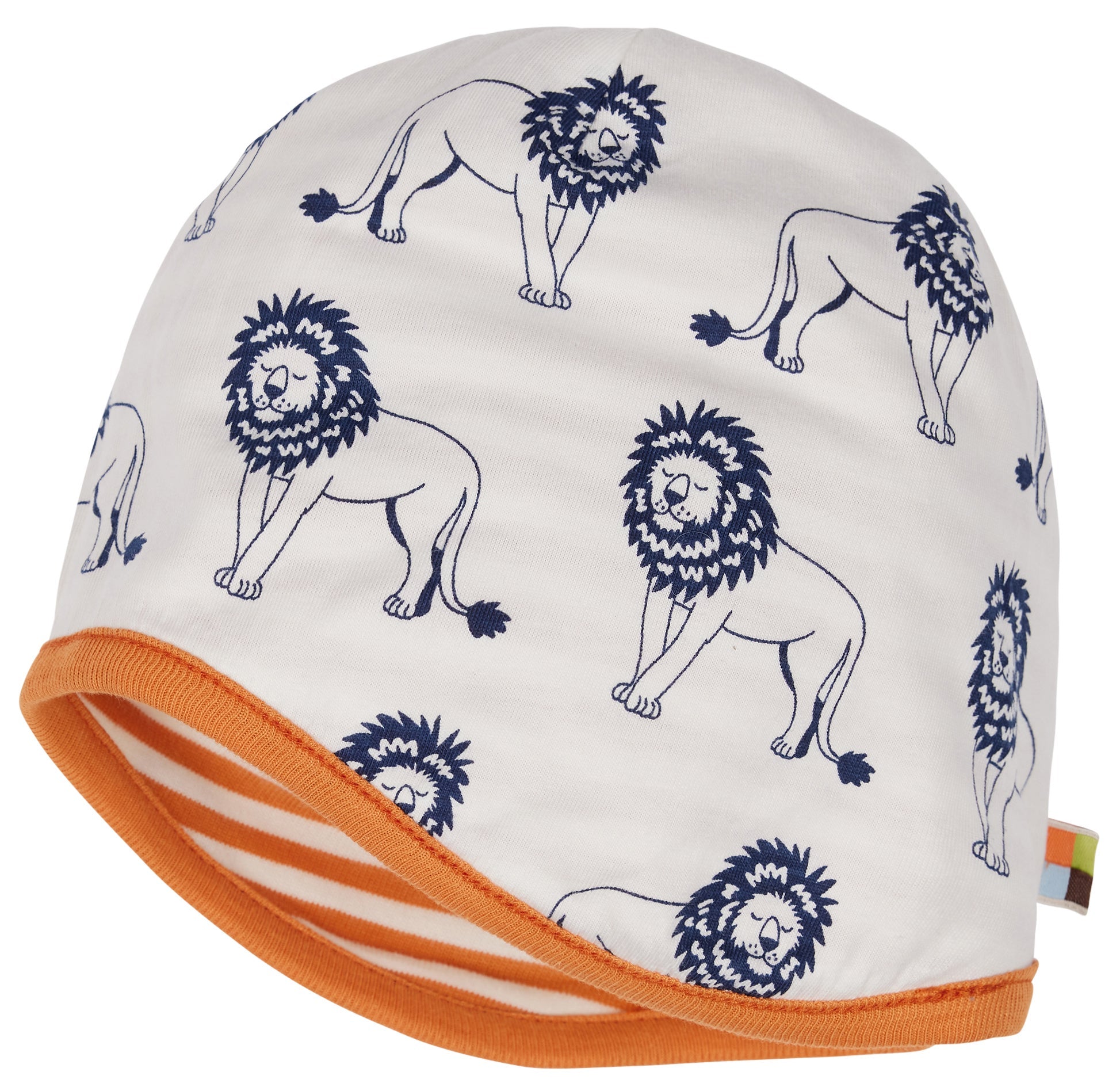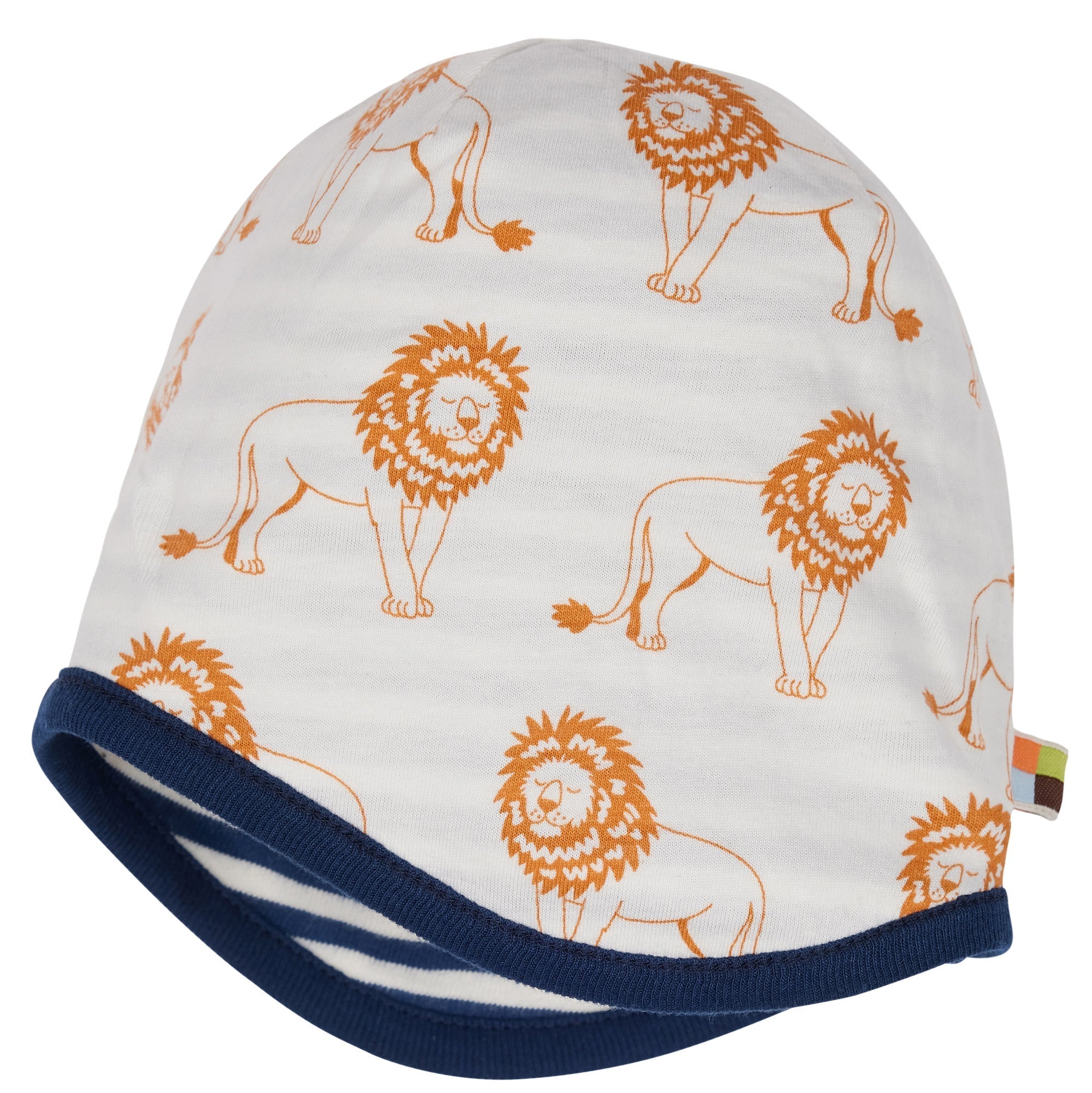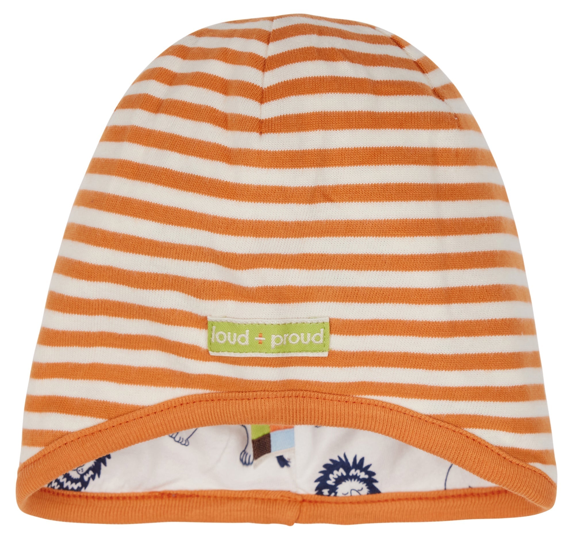 Weiche Wendemütze. Eine Seite ist aus bedrucktem Jersey, die andere Seite aus geringeltem Jersey mit geschmirgelter Oberfläche gefertigt. Die Kante ist kontrastfarbig eingefasst. Vorne Logo-Etikett, hinten mit Fähnchen. Made in Portugal. Waschbar bei 30°C