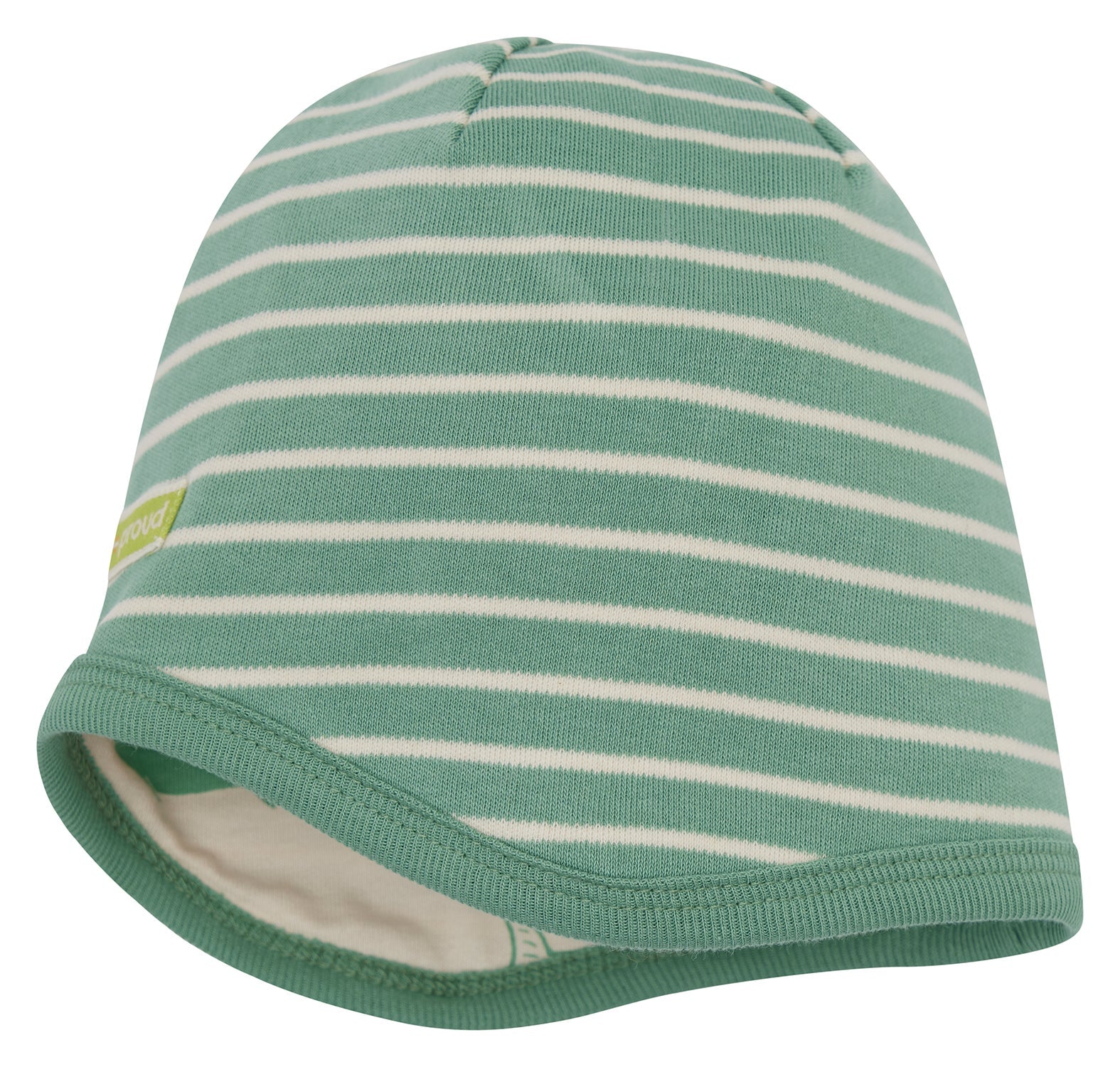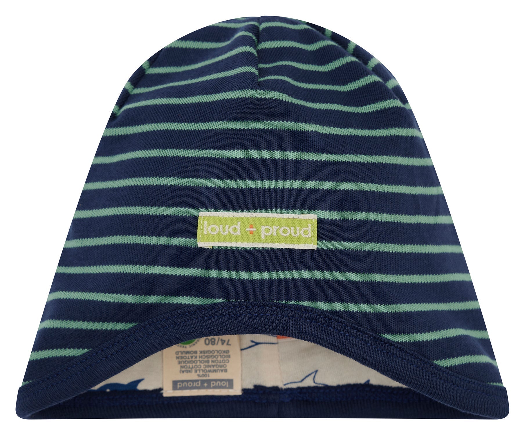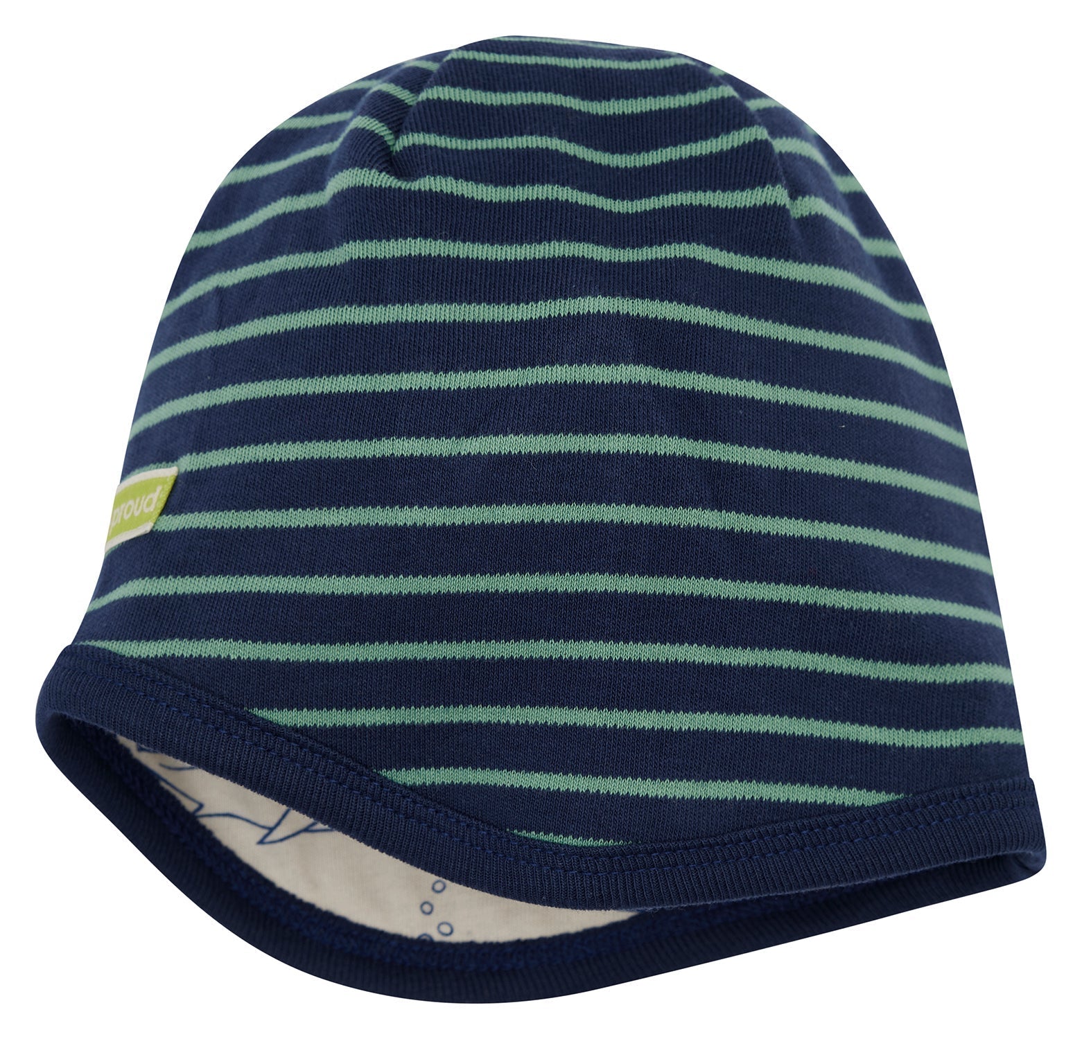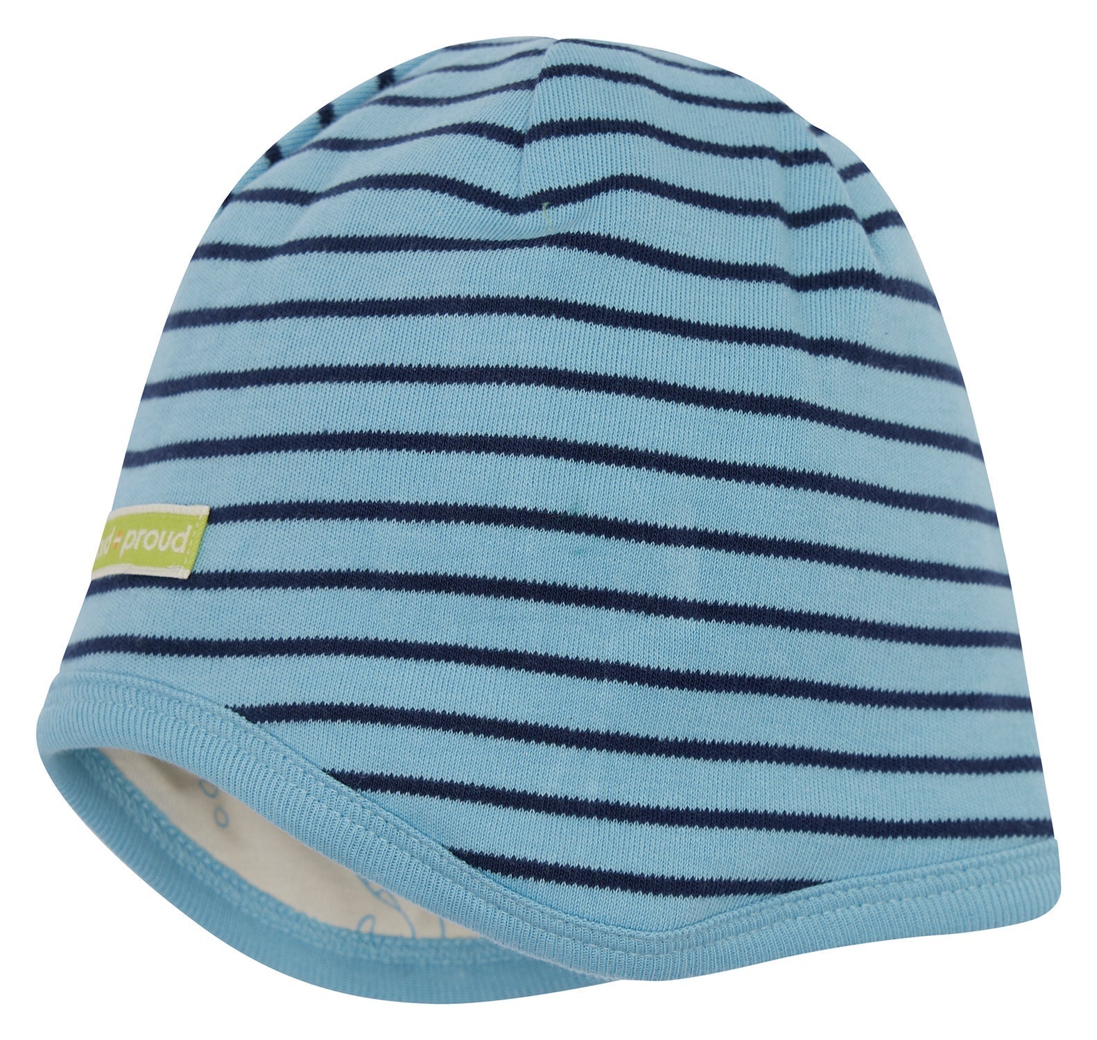 Weiche Wendemütze. Eine Seite ist aus bedrucktem Jersey, die andere Seite aus geringeltem Interlock gefertigt. Die Kante ist kontrastfarbig eingefasst. Vorne Logo-Etikett, hinten mit Fähnchen. Made in Hungary. Waschbar bei 30°C