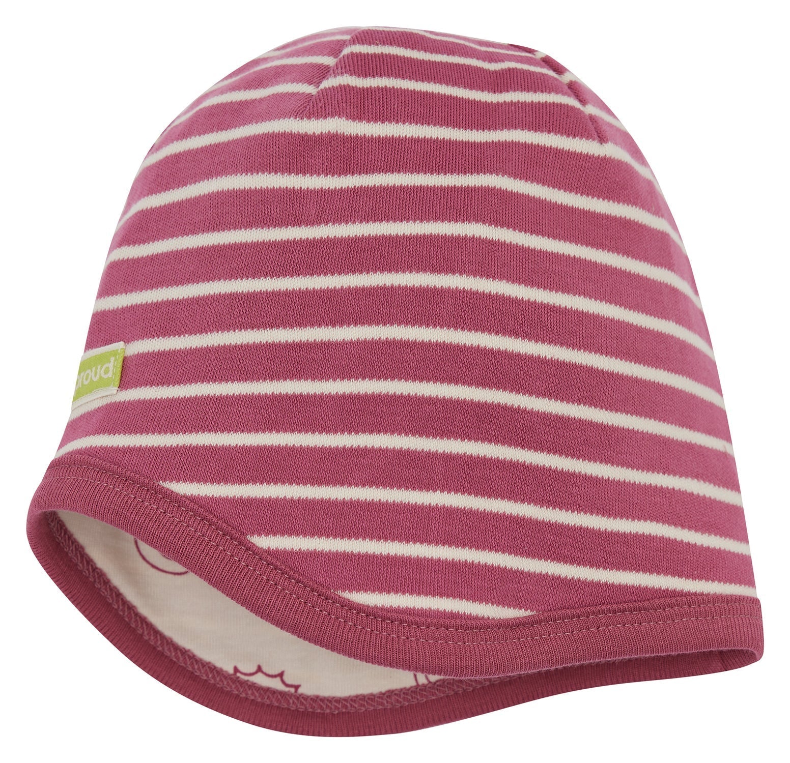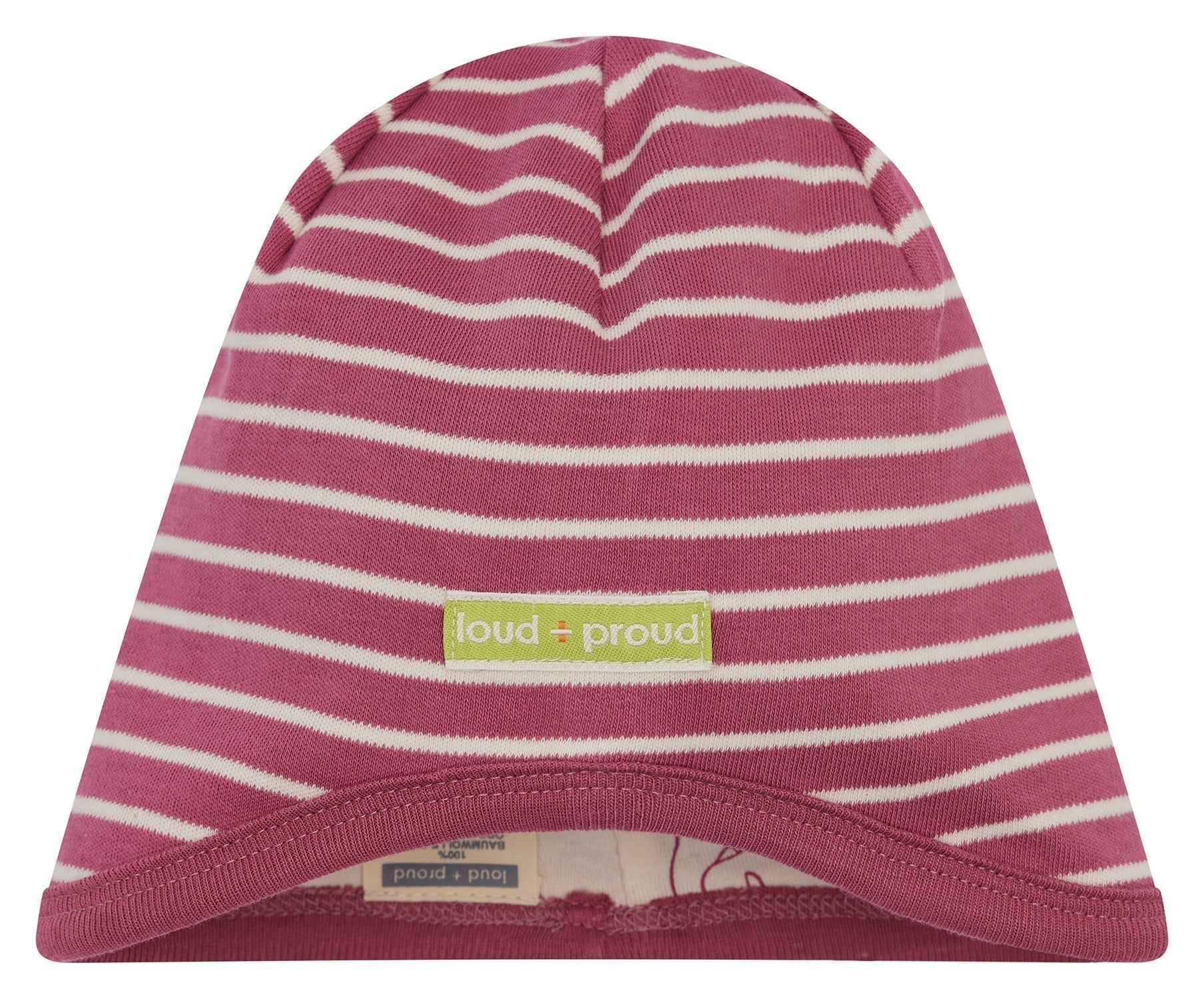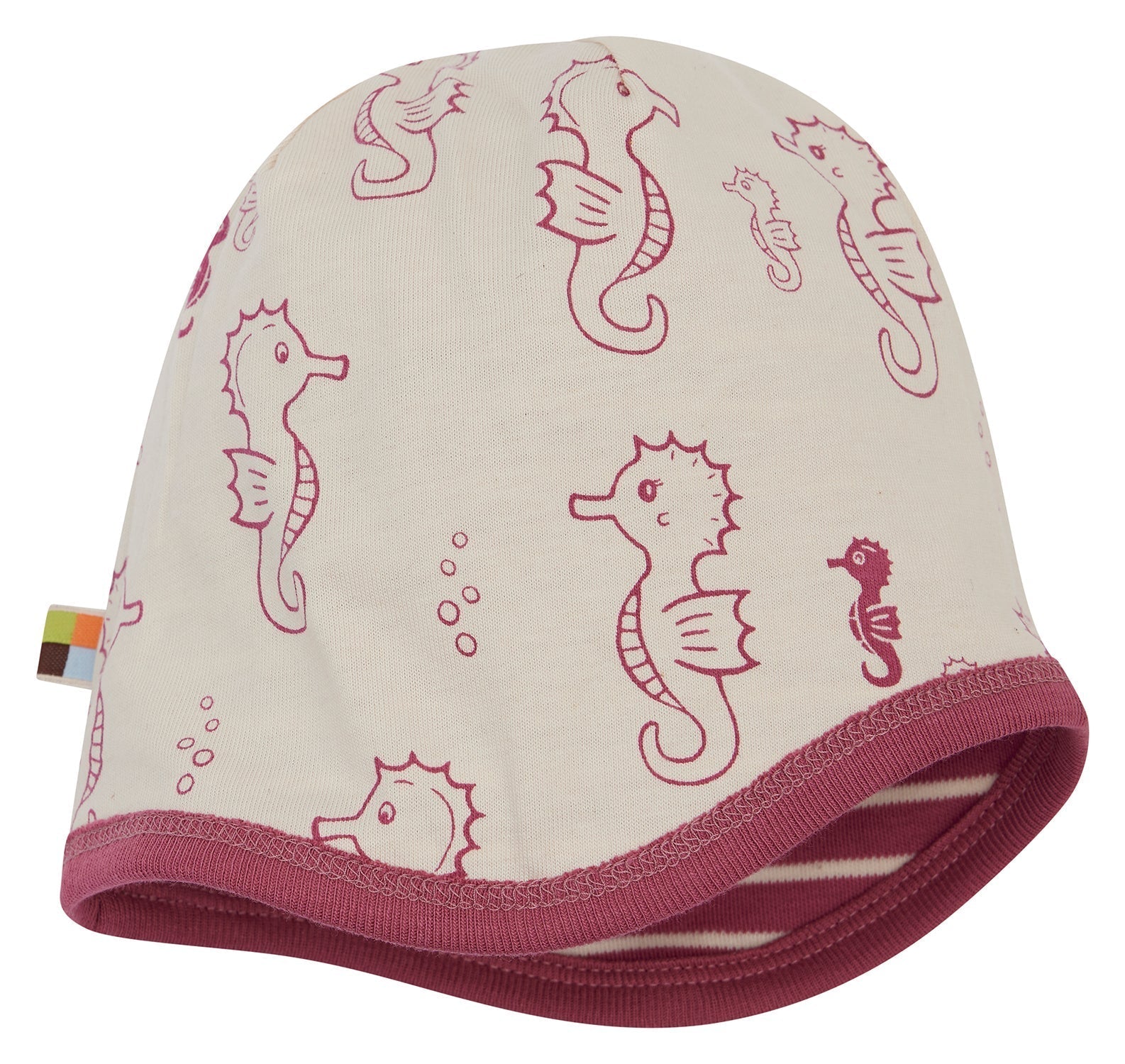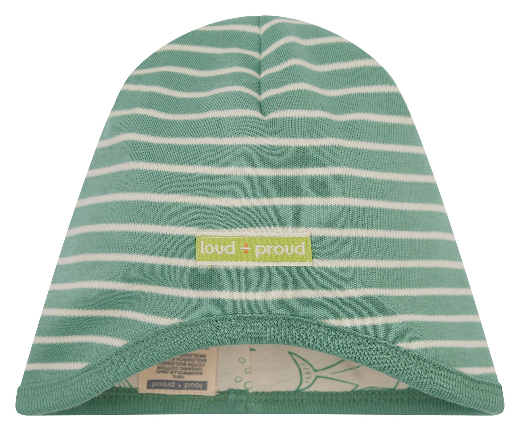 Weiche Wendemütze. Eine Seite ist aus bedrucktem Jersey, die andere Seite aus geringeltem Interlock gefertigt. Die Kante ist kontrastfarbig eingefasst. Vorne Logo-Etikett, hinten mit Fähnchen. Made in Hungary. Waschbar bei 30°C