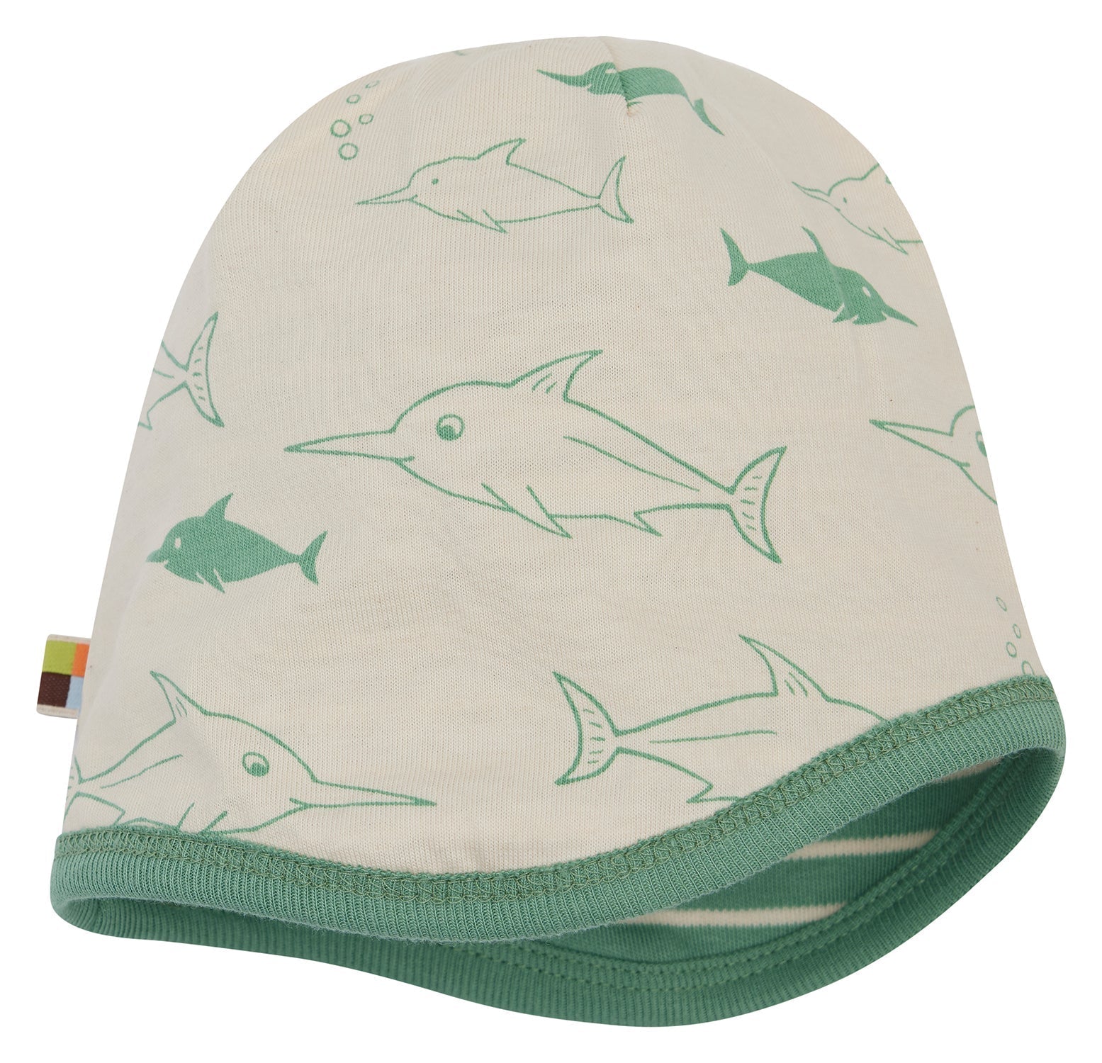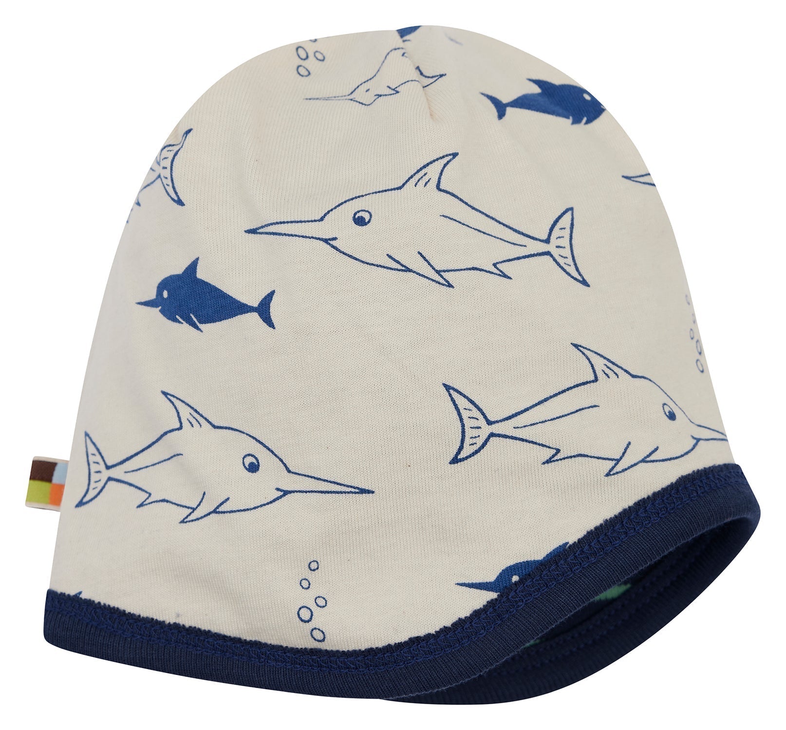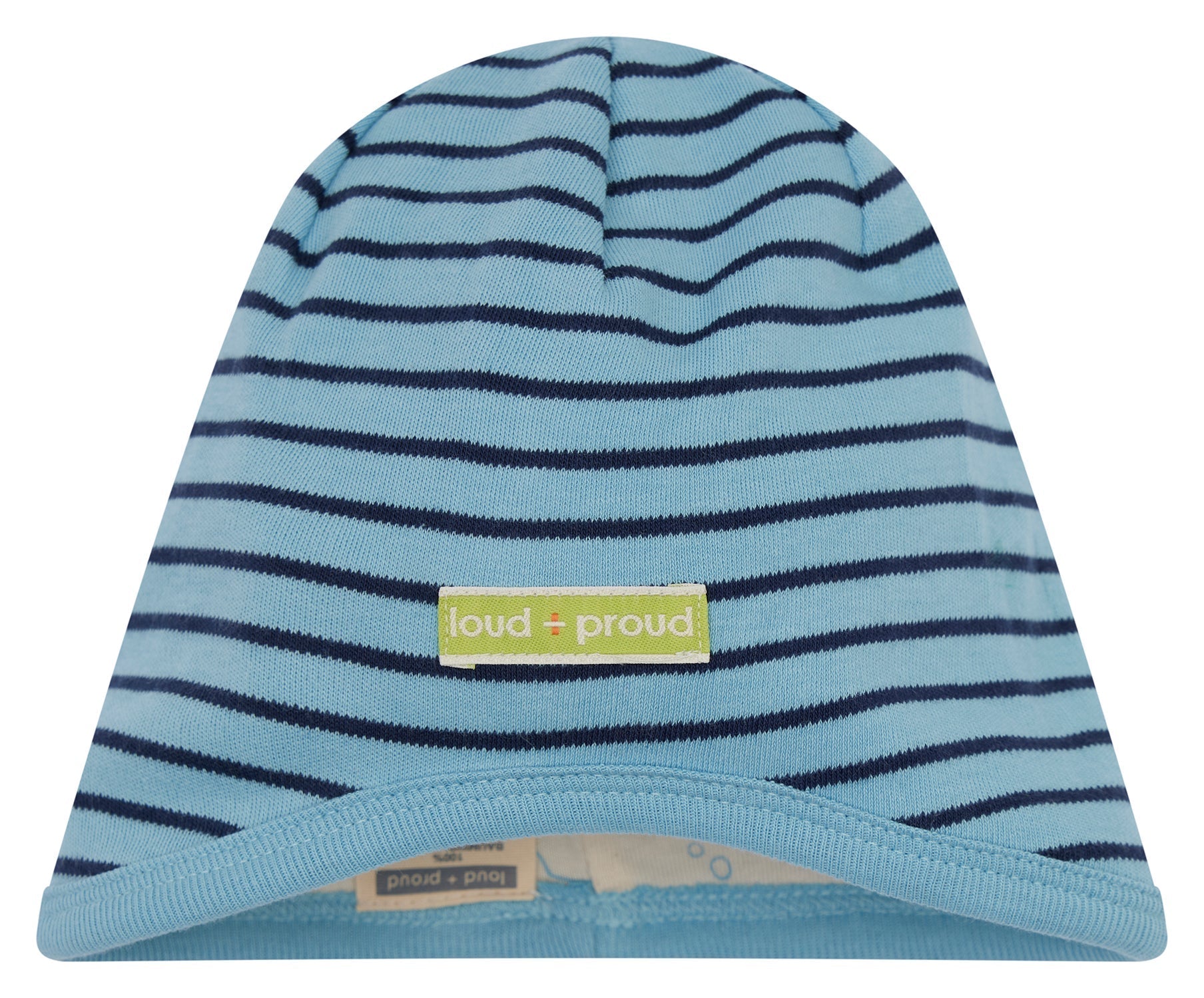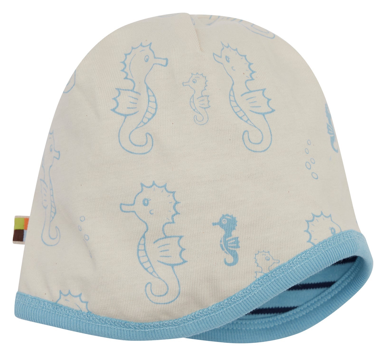 Weiche Wendemütze. Eine Seite ist aus bedrucktem Jersey, die andere Seite aus geringeltem Interlock gefertigt. Die Kante ist kontrastfarbig eingefasst. Vorne Logo-Etikett, hinten mit Fähnchen. Made in Hungary. Waschbar bei 30°C