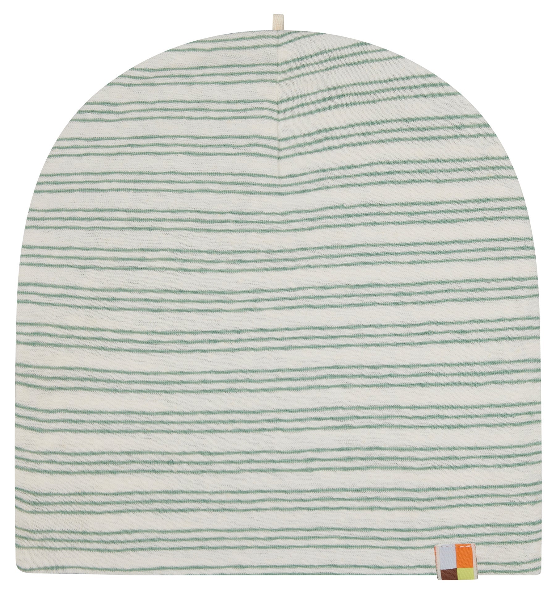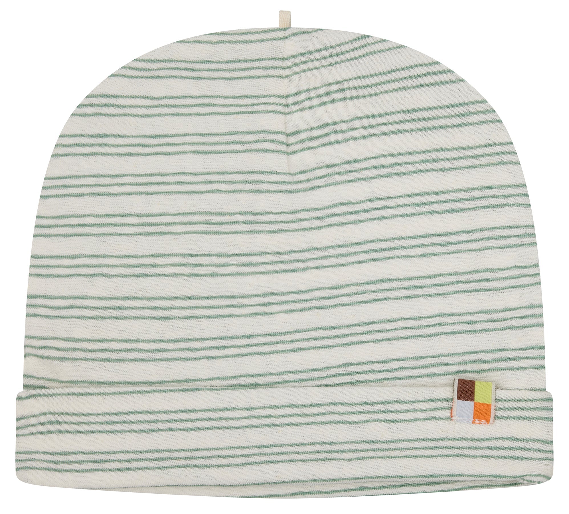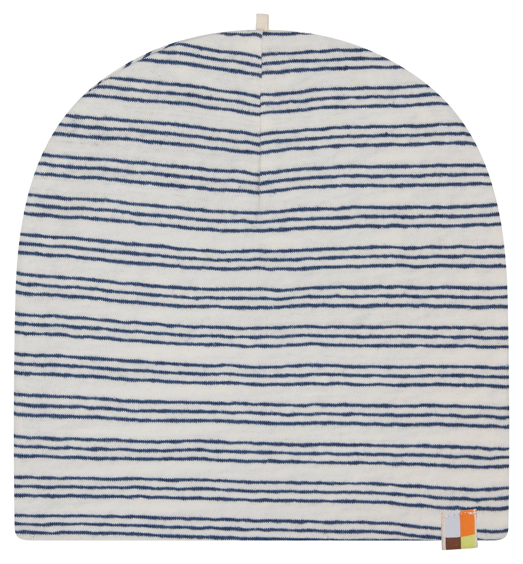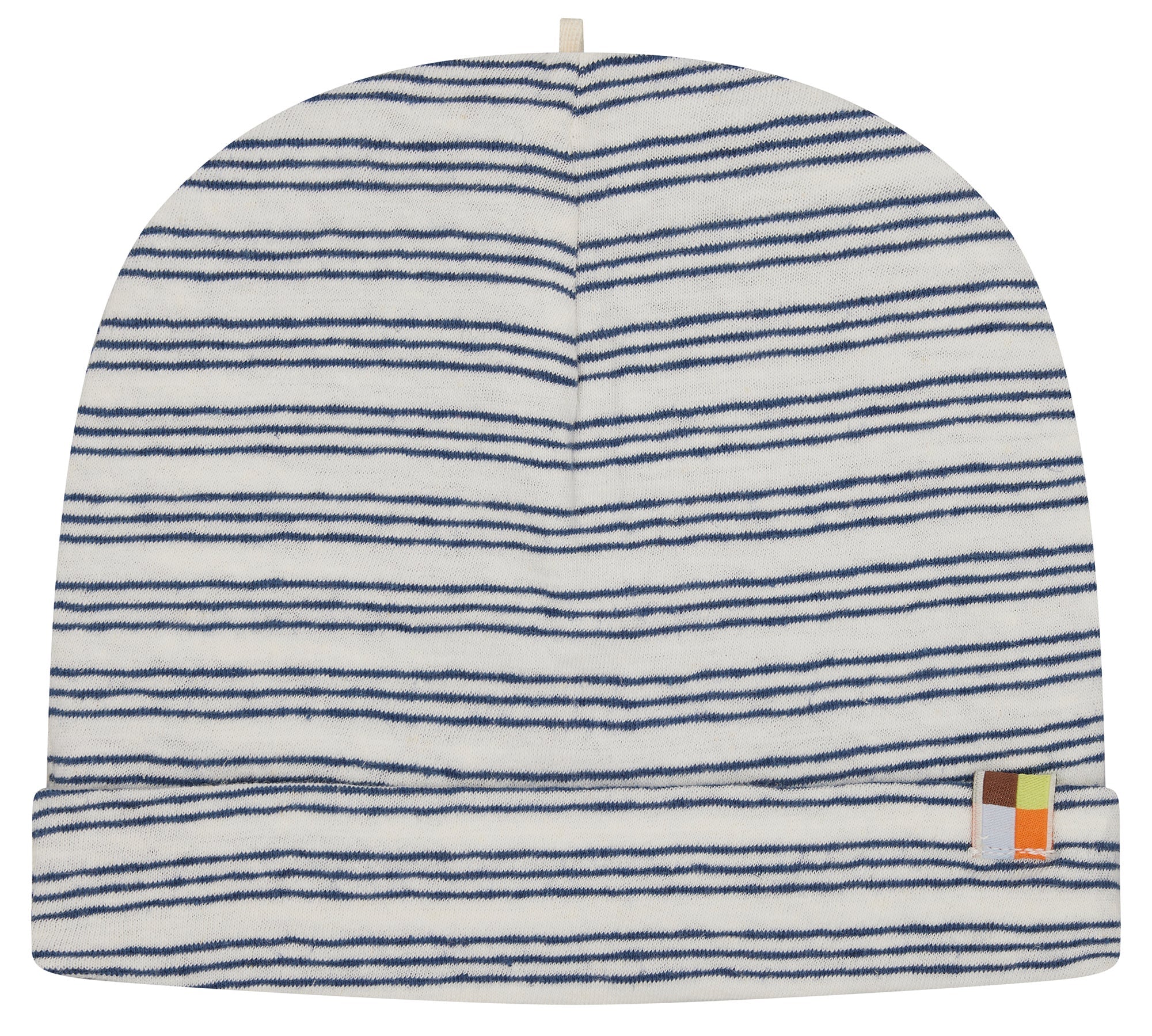 Gestreifte Mütze mit kühlendem Leinen. Mit umgeklappter Kante. Fähnchen an der Kante. Waschbar bei 30°C.