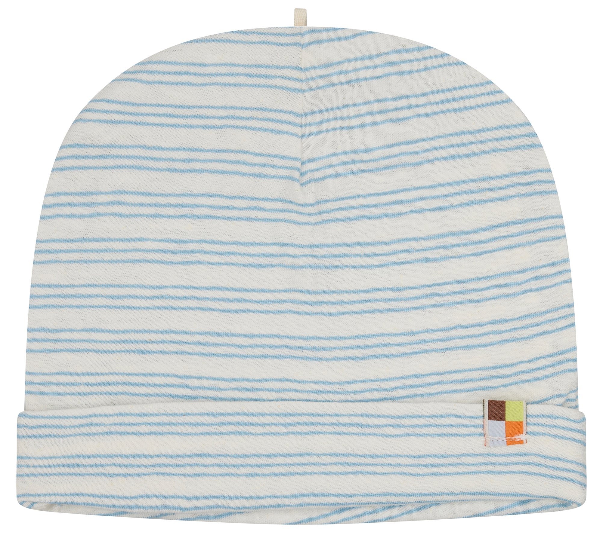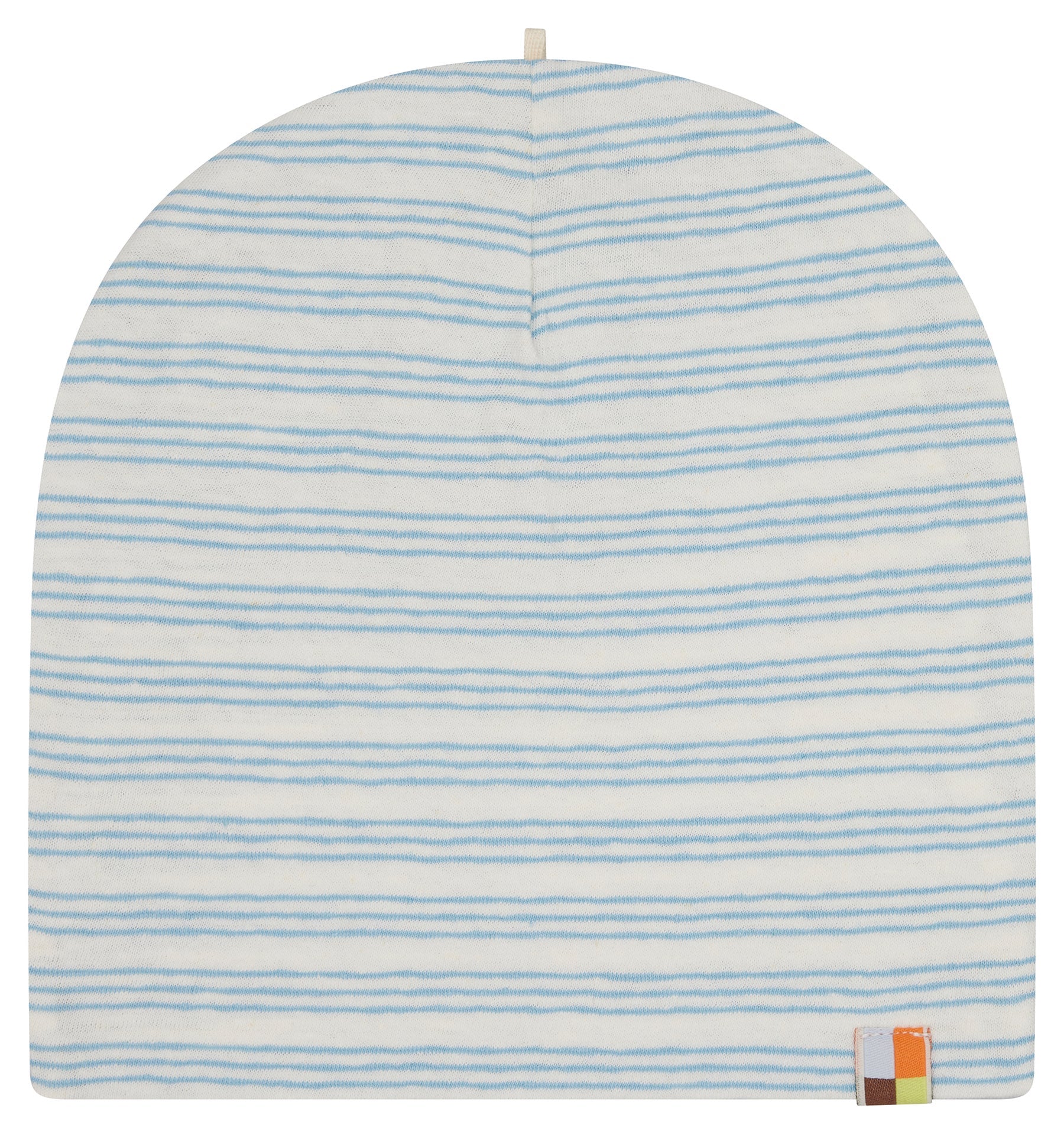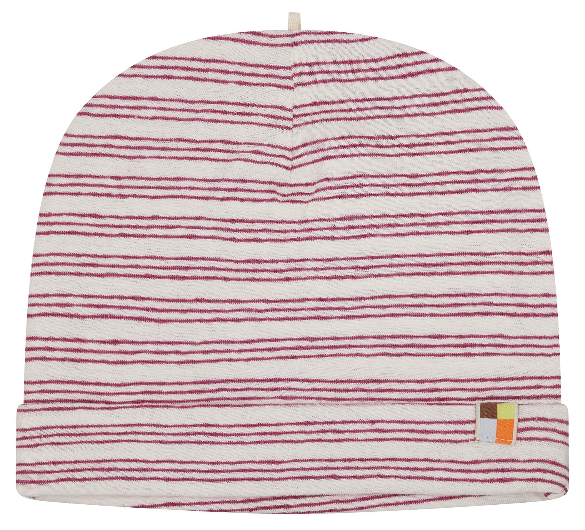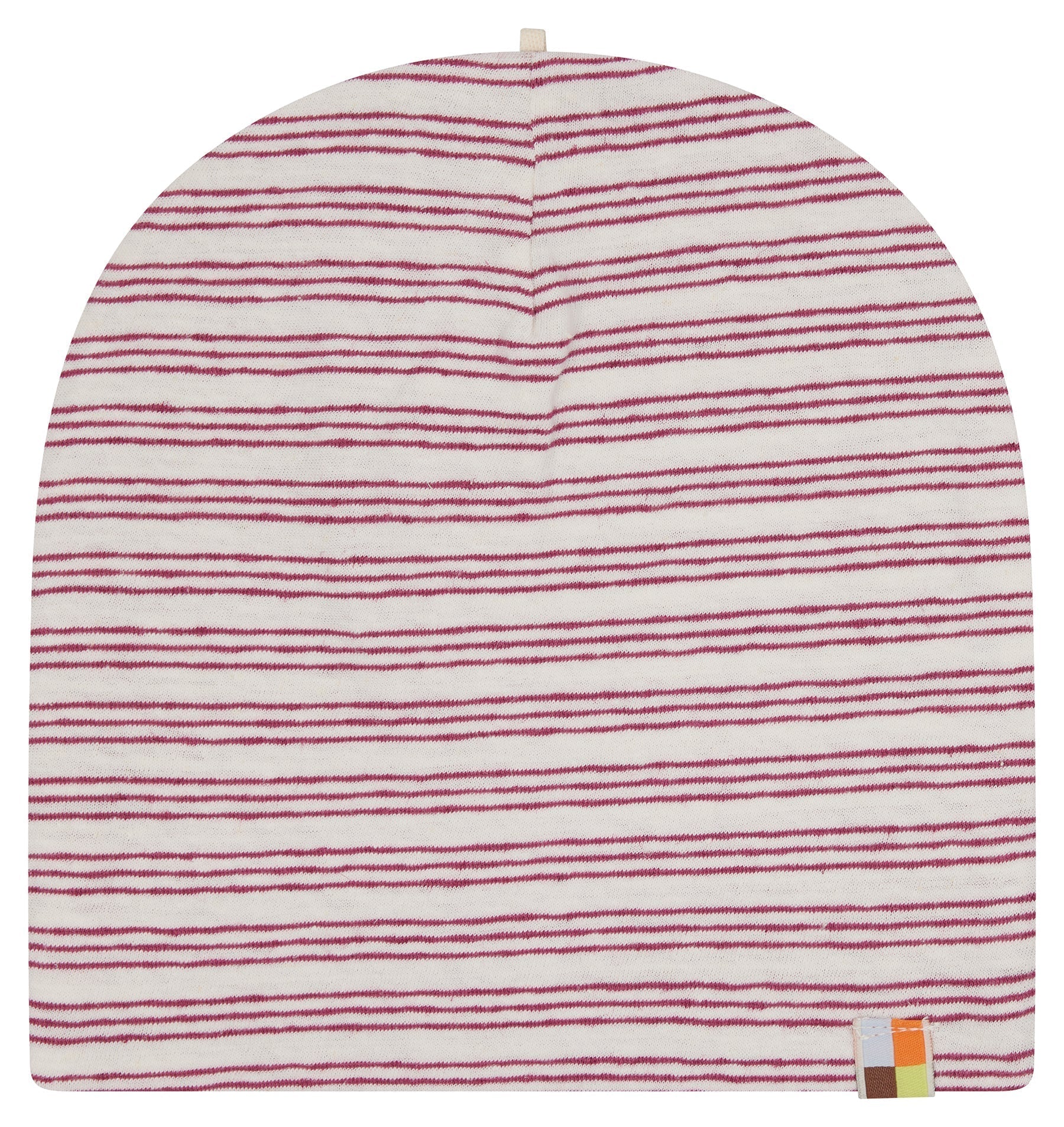 Gestreifte Mütze mit kühlendem Leinen. Mit umgeklappter Kante. Fähnchen an der Kante. Waschbar bei 30°C.
