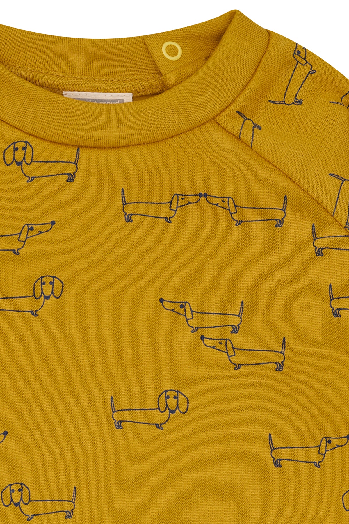Dieses kuschelweiche Sweatshirt mit flauschiger, angerauter Innenseite ist der perfekte Begleiter für kühlere Tage. Der liebevolle Alloverprint mit kleinen Dackeln sorgt für gute Laune bei Groß und Klein. Elastische Rippbündchen an Ärmeln und Saum halten alles bequem an Ort und Stelle. Für leichtes Umziehen ist das Sweatshirt bis Größe 86/92 mit praktischen Knöpfen an der Schulter ausgestattet. Ein kleines Fähnchen an der Seitennaht setzt einen liebevollen Akzent. Aus weicher Bio-Baumwolle, nachhaltig in Europa gefertigt und bei 30°C waschbar – perfekt für kleine Tierfreunde.