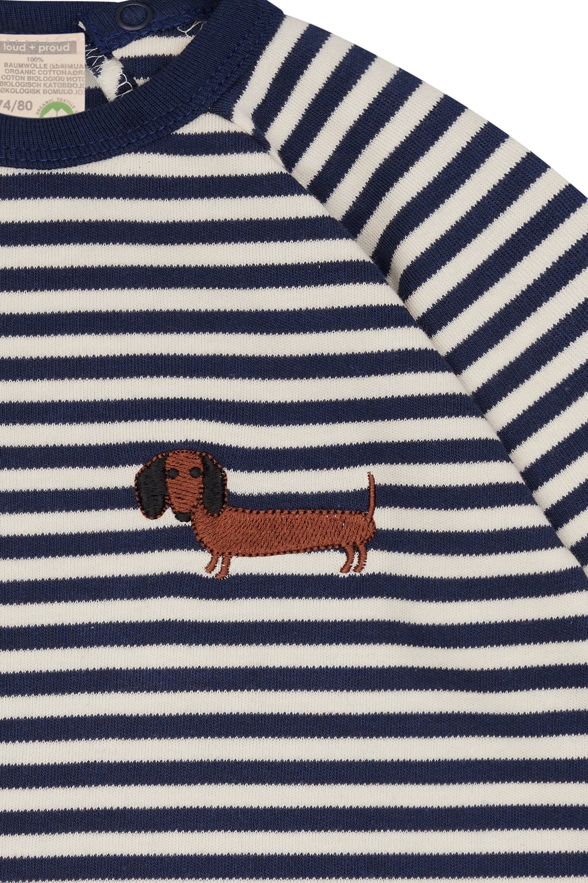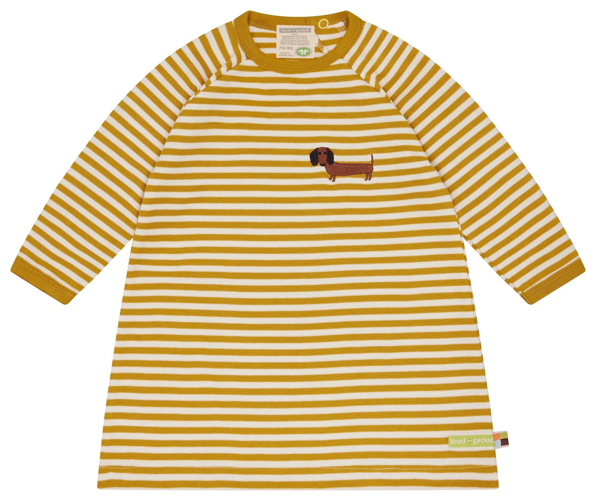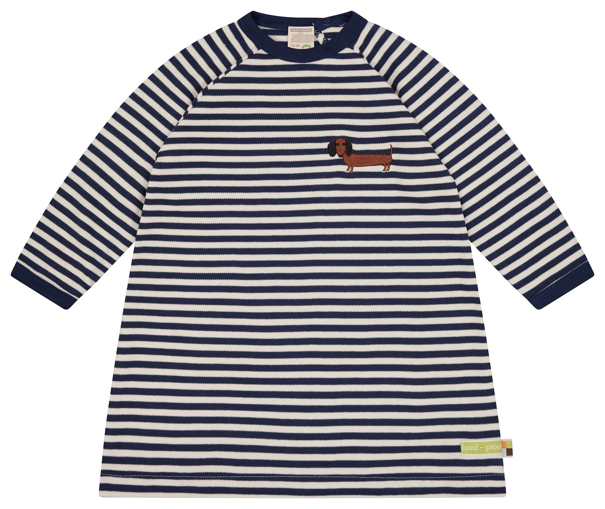 Dieses gestreifte Kleid aus weichem Interlock aus Bio-Baumwolle ist ein wunderschönes Alltagsstück für kleine Mädchen. Der glatte, anschmiegsame Stoff liegt angenehm auf der Haut und bietet viel Bewegungsfreiheit. Eine kleine Dackel-Stickerei auf der Vorderseite setzt einen verspielten Akzent. Für leichtes An- und Ausziehen sorgt bei den kleineren Größen (bis 86/92) ein verdeckter Druckknopfverschluss an der Schulter. Ein Fähnchen an der Seitennaht rundet das Design ab. Nachhaltig gefertigt in Europa und maschinenwaschbar bei 30°C – ideal für Kita, Alltag und Familienfeste.