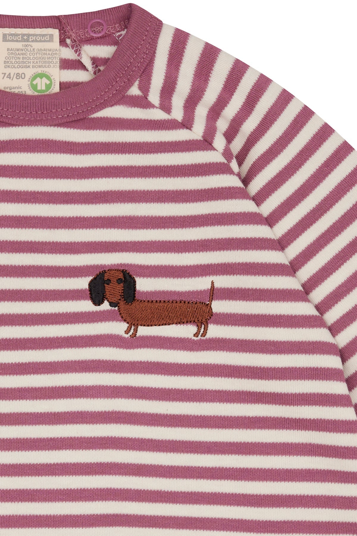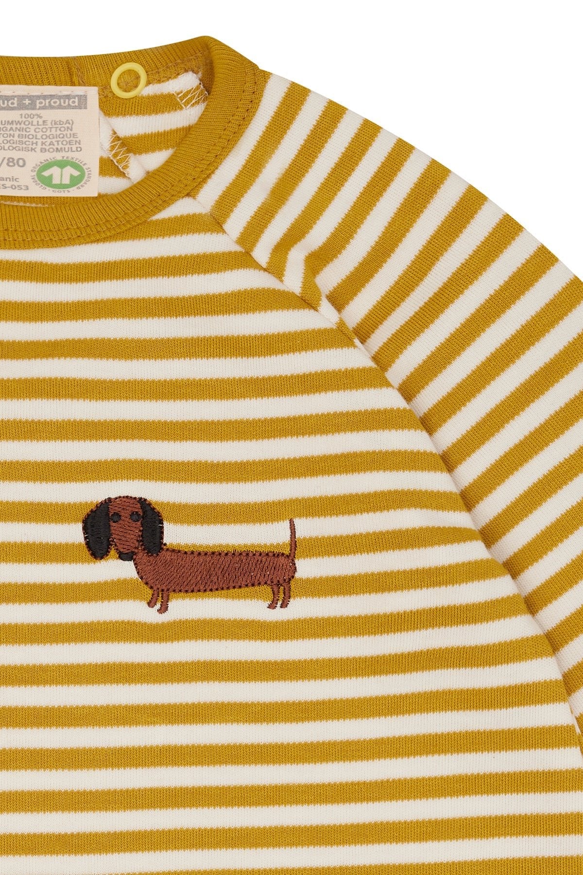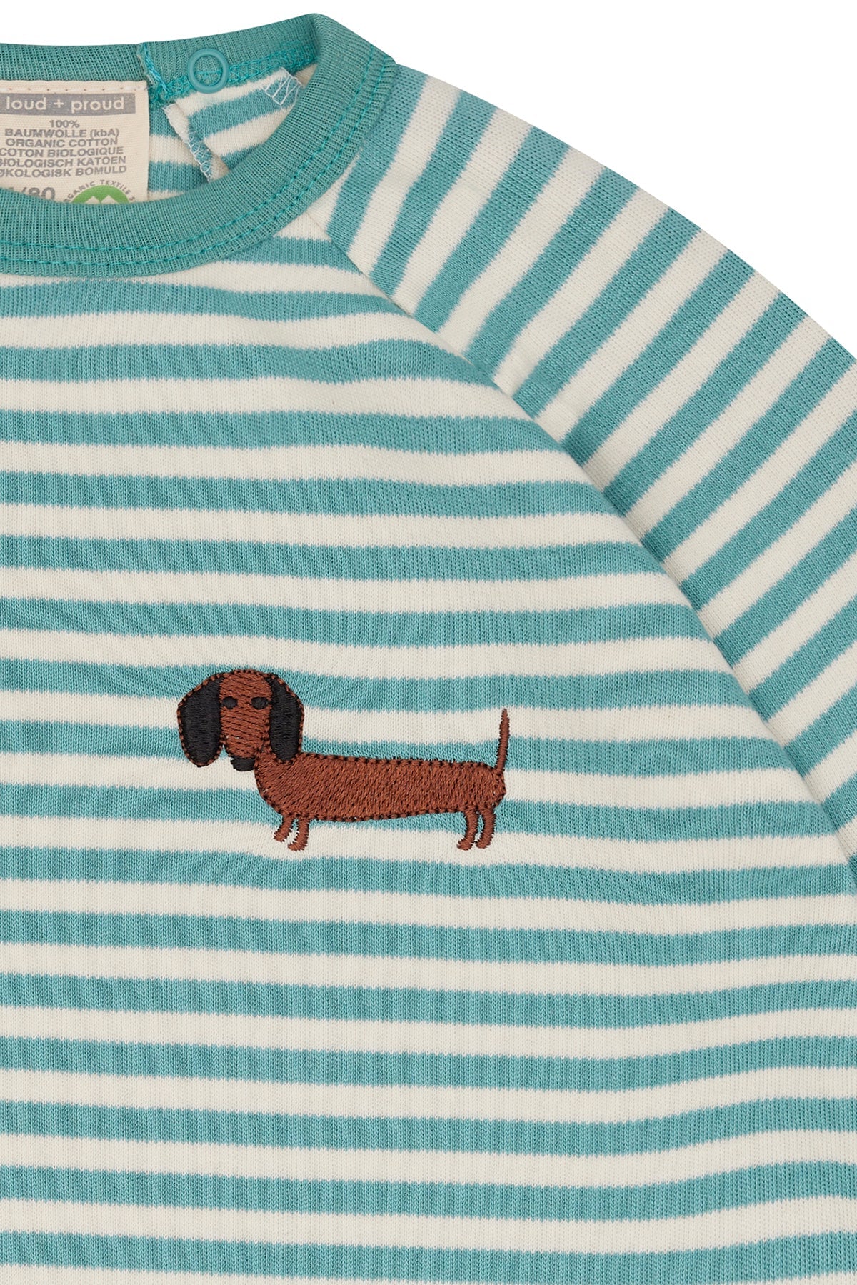 Dieses gestreifte Kleid aus weichem Interlock aus Bio-Baumwolle ist ein wunderschönes Alltagsstück für kleine Mädchen. Der glatte, anschmiegsame Stoff liegt angenehm auf der Haut und bietet viel Bewegungsfreiheit. Eine kleine Dackel-Stickerei auf der Vorderseite setzt einen verspielten Akzent. Für leichtes An- und Ausziehen sorgt bei den kleineren Größen (bis 86/92) ein verdeckter Druckknopfverschluss an der Schulter. Ein Fähnchen an der Seitennaht rundet das Design ab. Nachhaltig gefertigt in Europa und maschinenwaschbar bei 30°C – ideal für Kita, Alltag und Familienfeste.