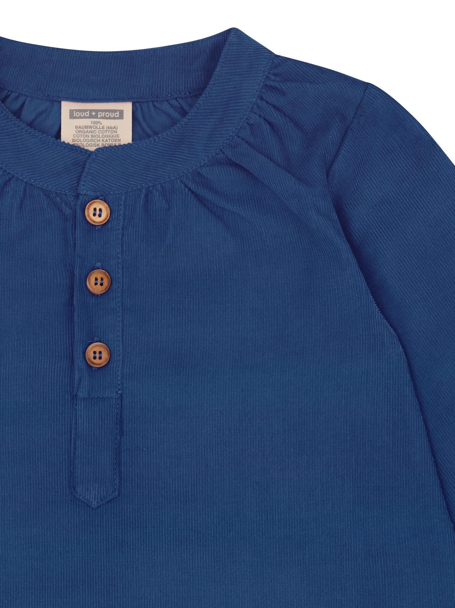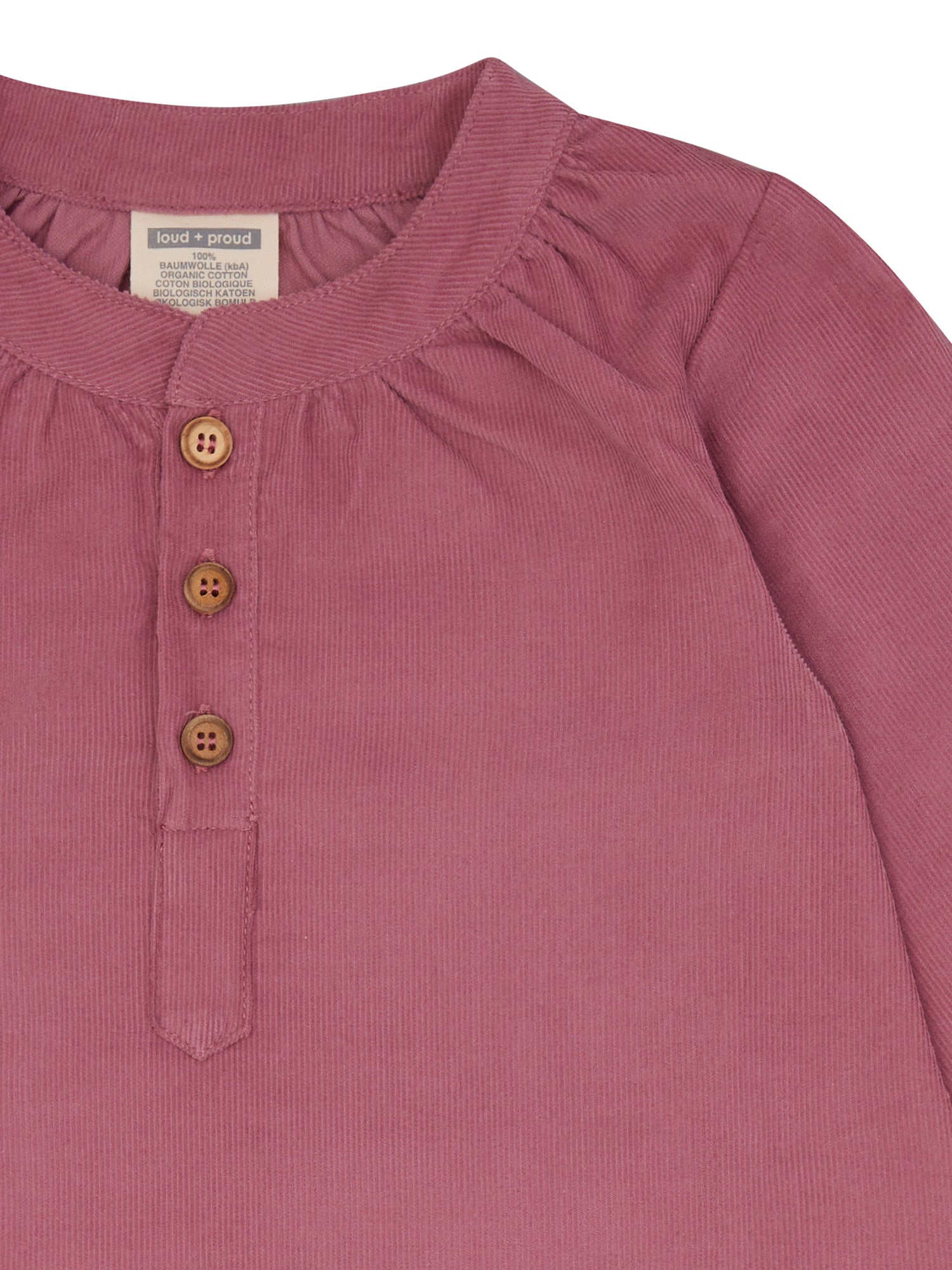 Dieses Kleid aus weichem Babycord aus Bio-Baumwolle vereint klassische Optik mit liebevollen Details. Die durchgehende Knopfleiste mit edlen Holzknöpfen auf der Vorderseite macht das Anziehen ganz einfach und verleiht dem Kleid eine natürliche, zeitlose Note. Am Halsloch sorgt eine feine Rüsche für einen verspielten Akzent, während schmale Gummibündchen an den Ärmeln für einen bequemen Sitz sorgen. Ein kleines Fähnchen an der Seitennaht rundet das Design stilvoll ab. Nachhaltig gefertigt in Portugal, waschbar bei 30°C – ein besonderes Lieblingsstück für Alltag und besondere Anlässe.