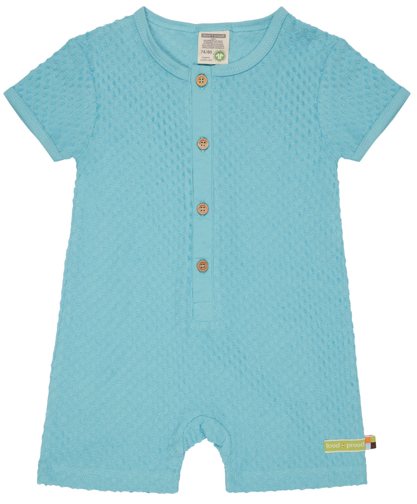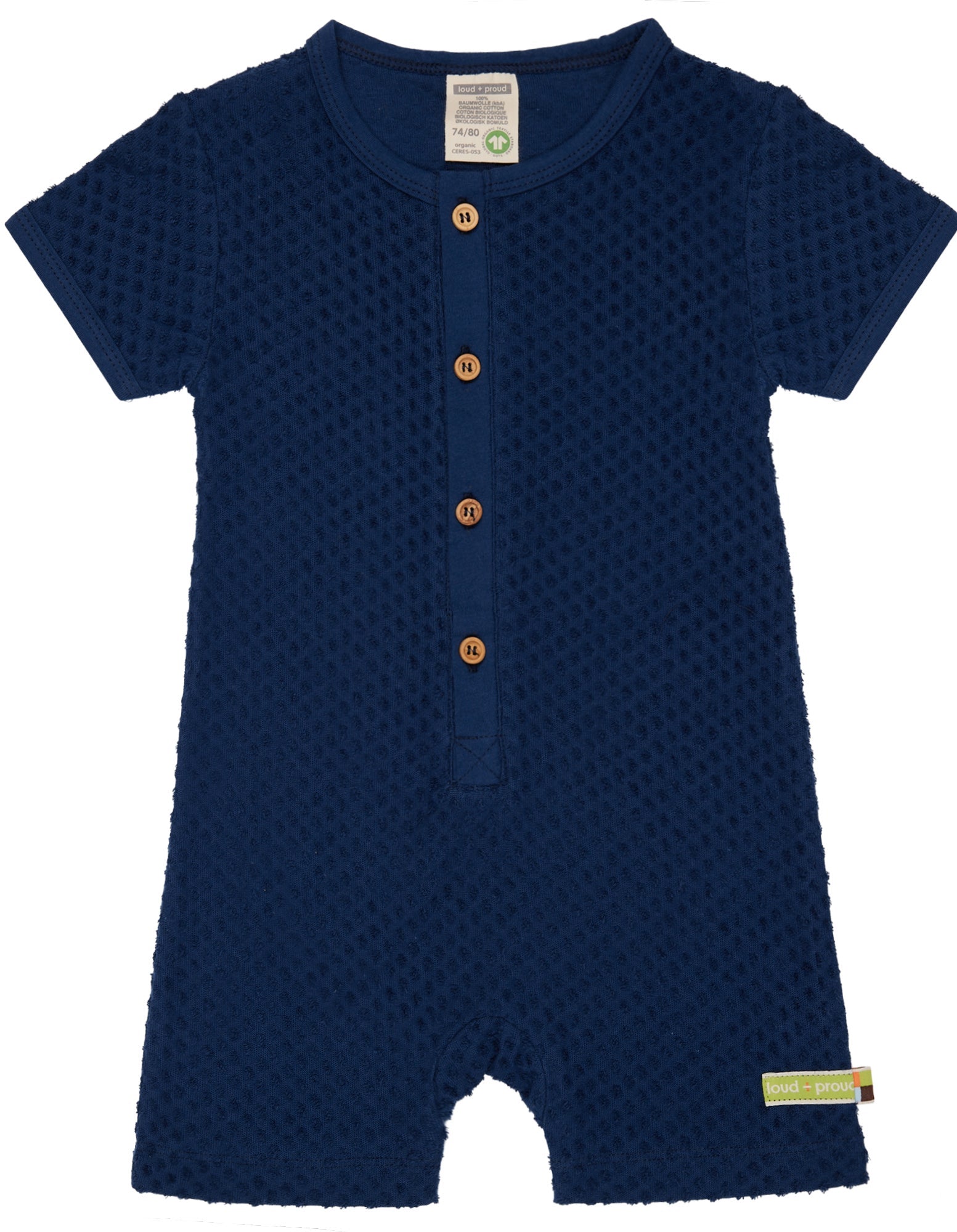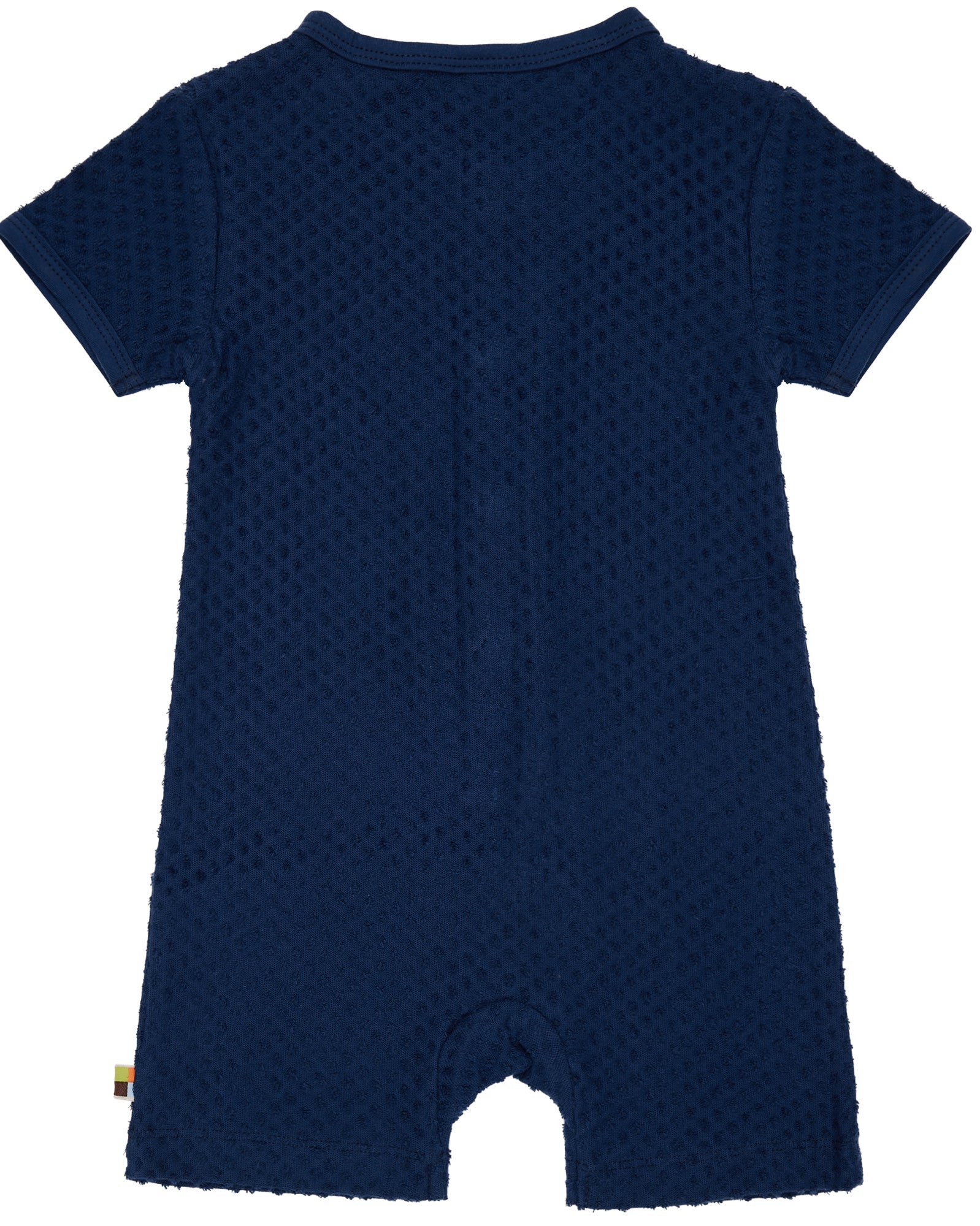 Spieler aus Frottee mit Punkte-Muster (Jacquard). Vorne mit Knopfleiste und Knöpfen aus Holz. Alle Kanten sind mit Single Jersey eingefasst. Fähnchen und Logo-Etikett an der Seitennaht. Made in Portugal. Waschbar bei 30°C