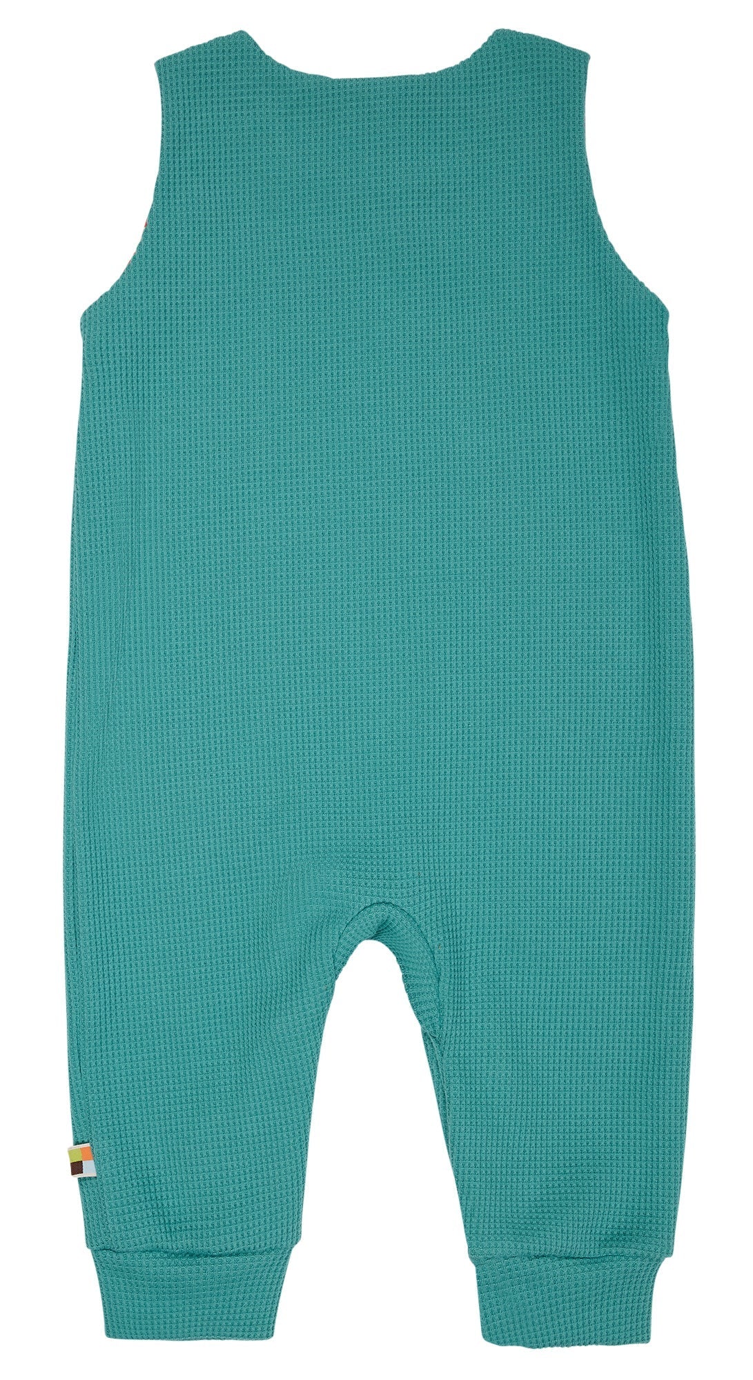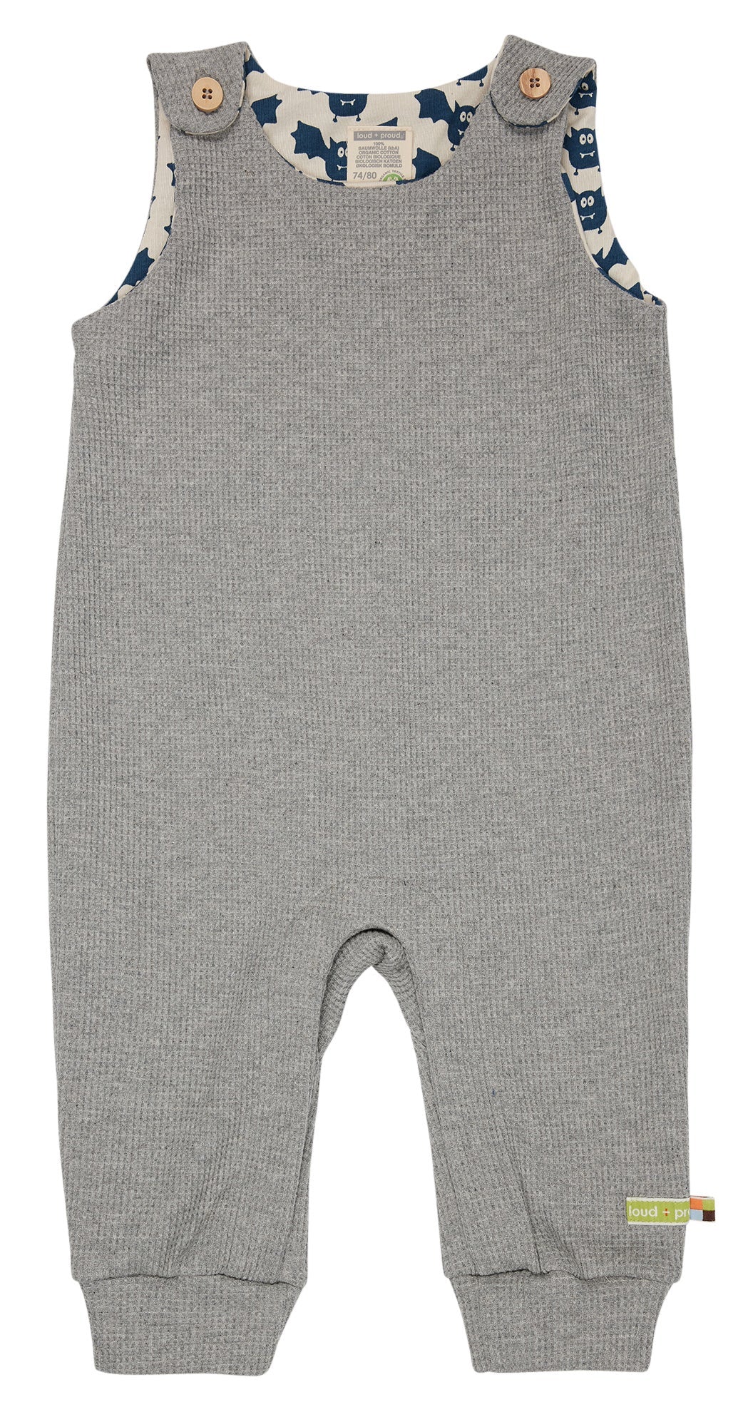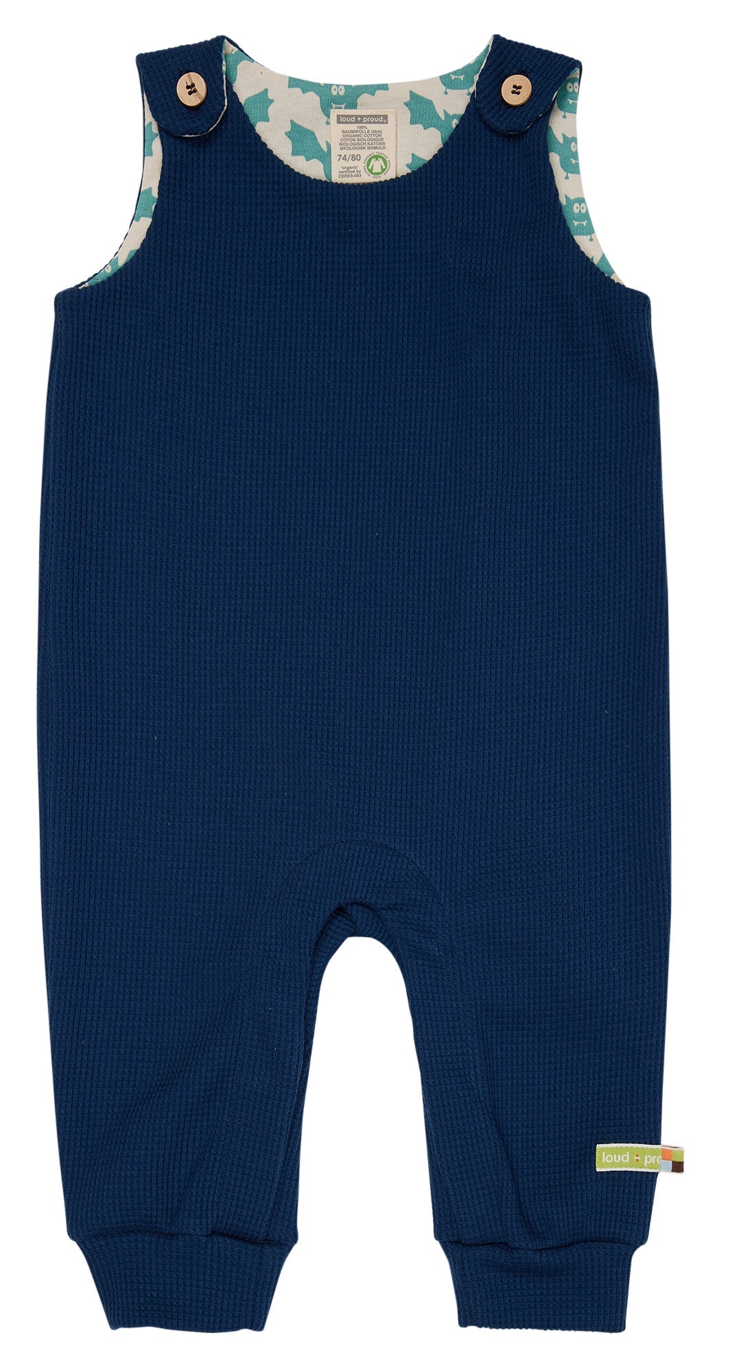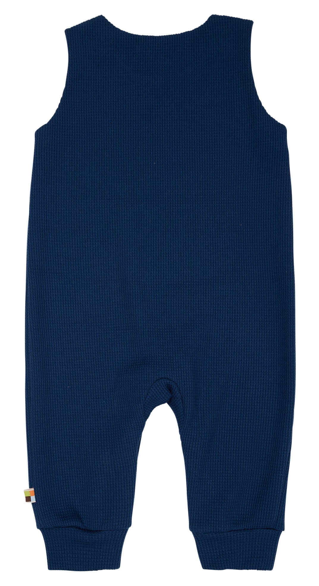 Strampler in weicher Waffel-Struktur. An den Schultern Knöpfe zum An- und Ausziehen. Der Brustbereich ist innen mit bedrucktem Jersey abgefüttert. Zum bequemen Wickeln kann die Schrittnaht mit Druckknöpfen geöffnet und verschlossen werden. Logo-Etikett mit Fähnchen an der Seitennaht. Made in Germany. Waschbar bei 30°C.
