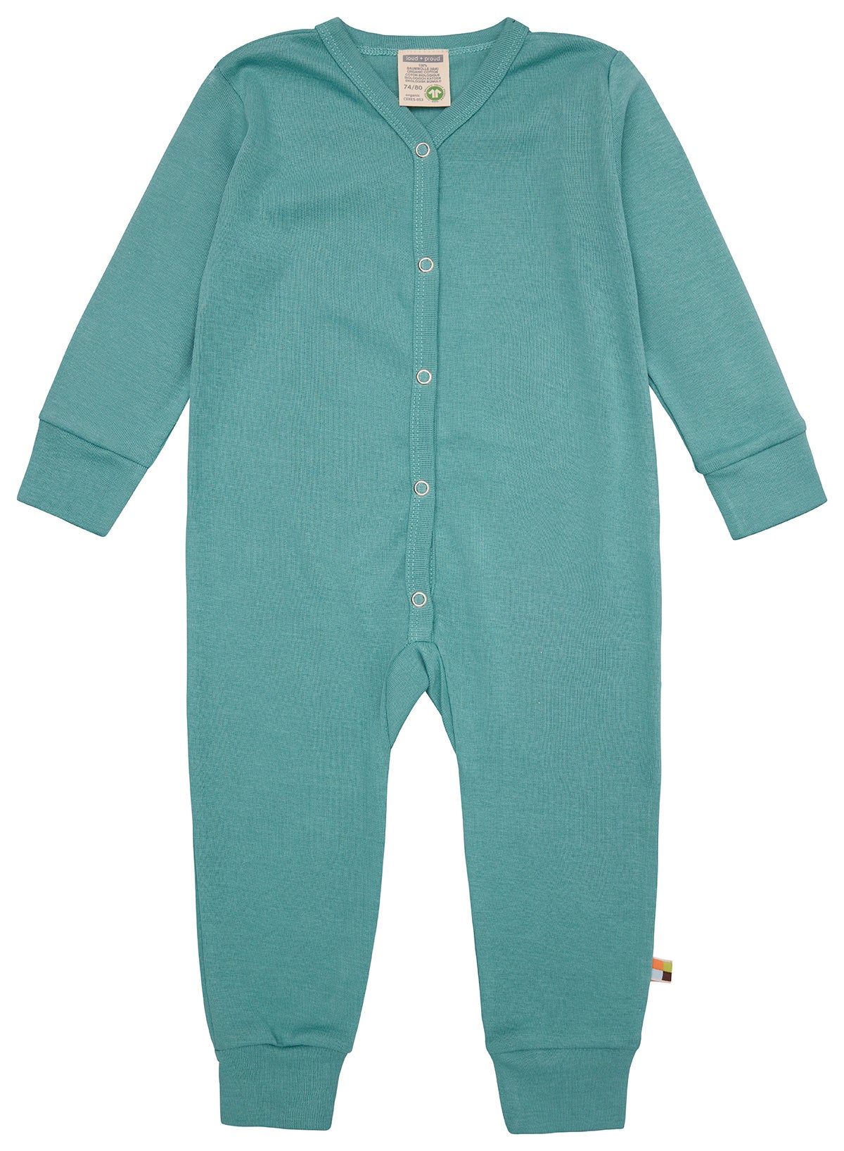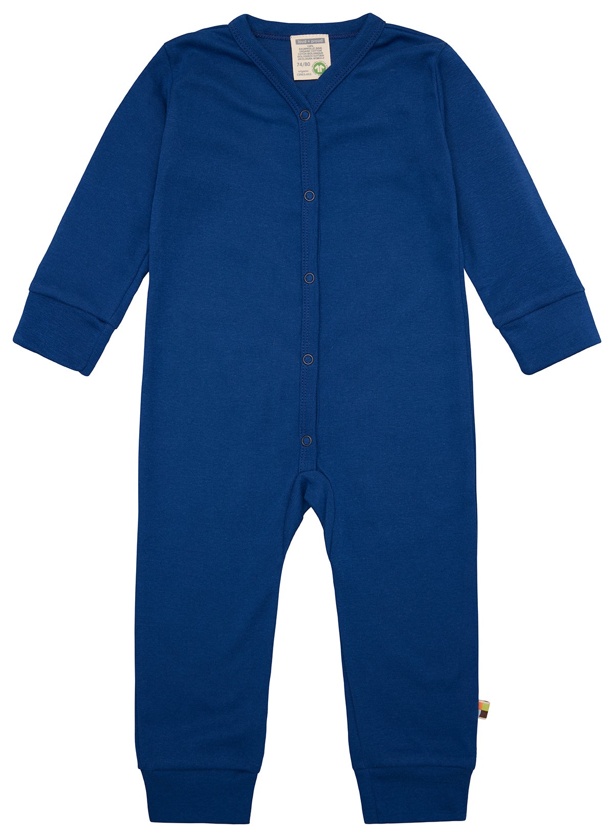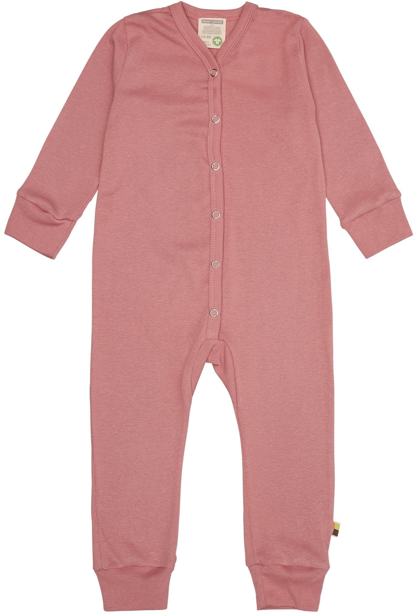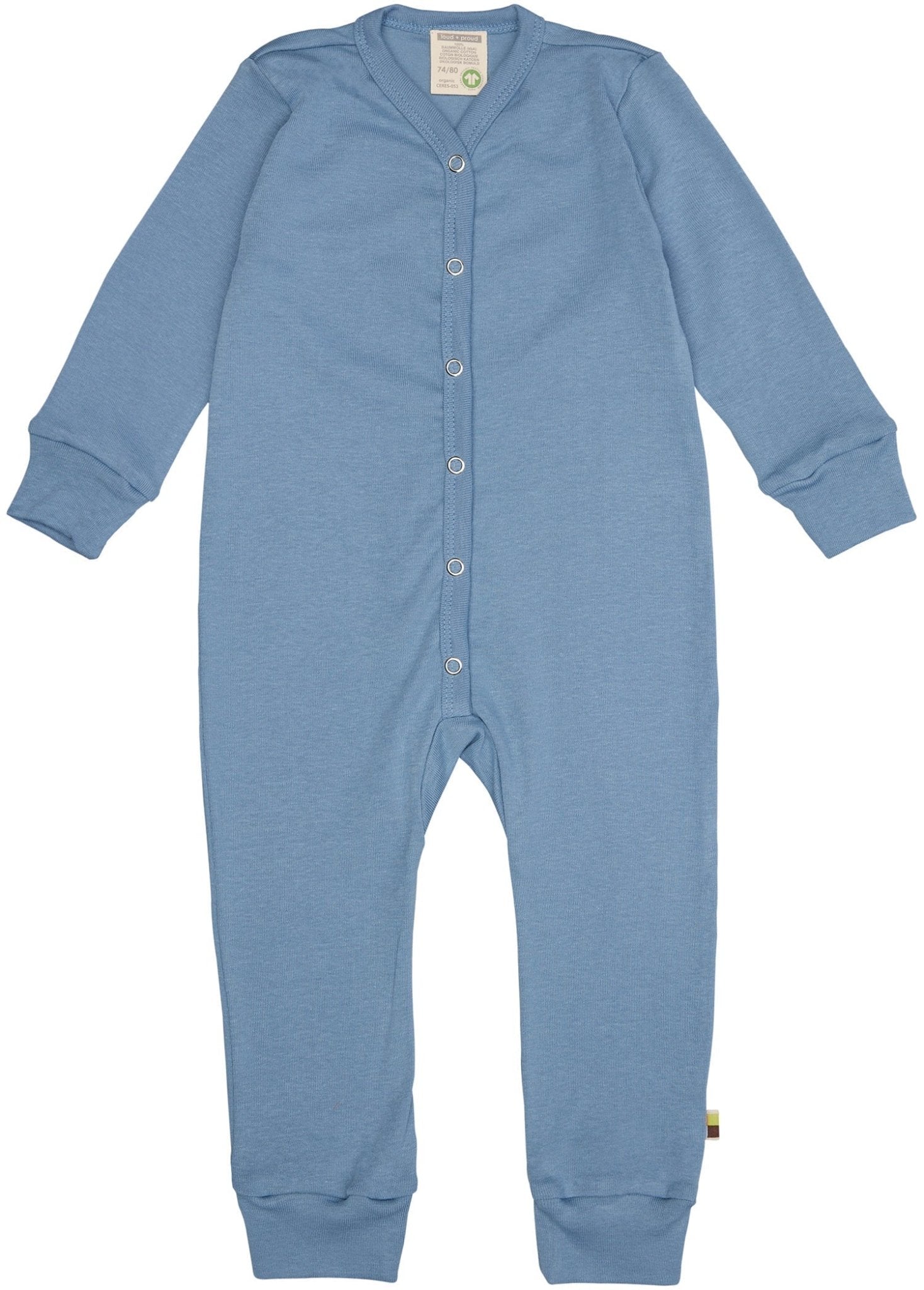 Schlafoverall aus weichem Feinripp. Lange Ärmel und lange Beine mit Bündchen. Druckknöpfe vorne, im Schritt mit Zwickel. Fähnchen an der Seitennaht. Made in Hungary. Waschbar bei 30°C.