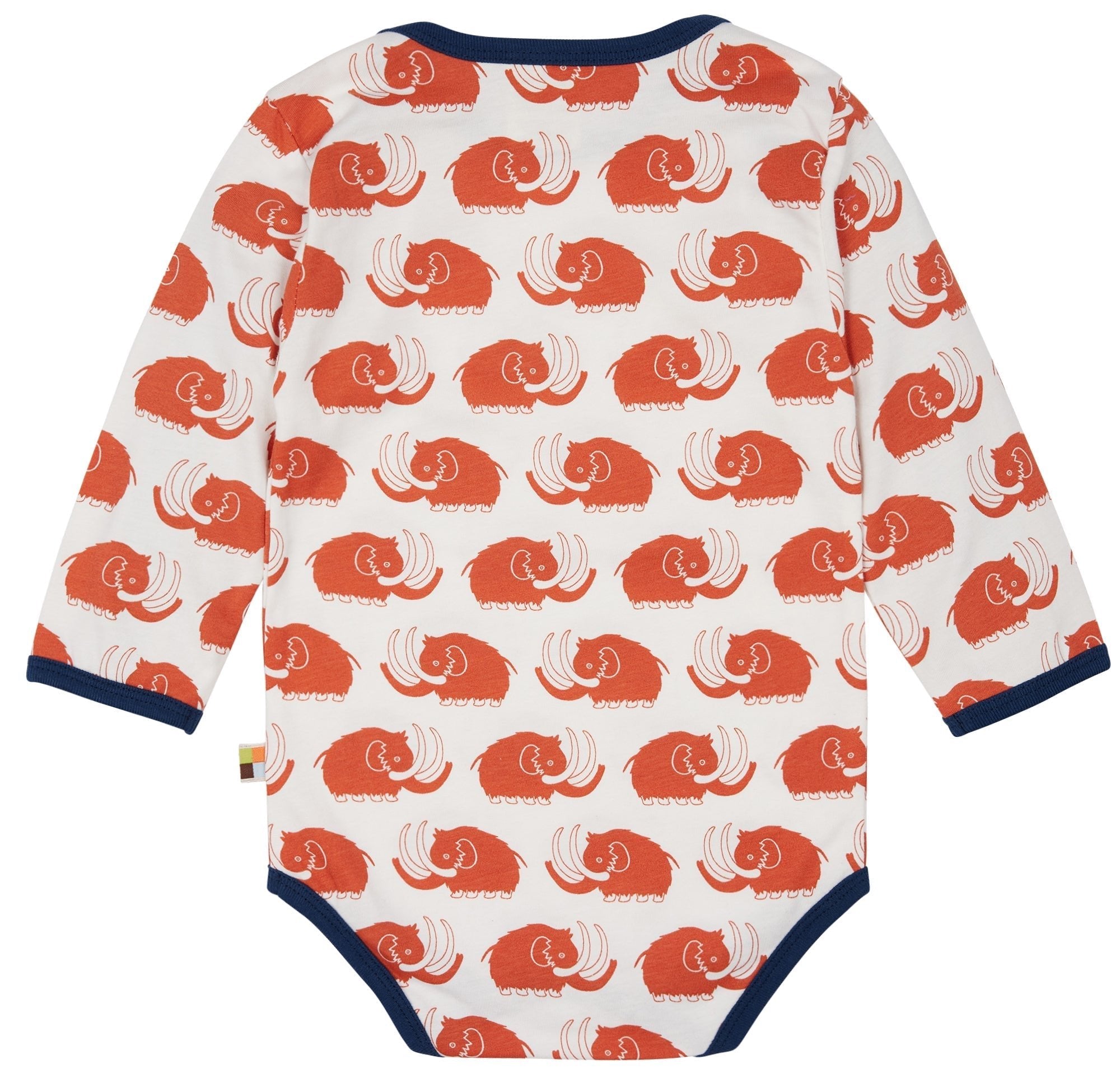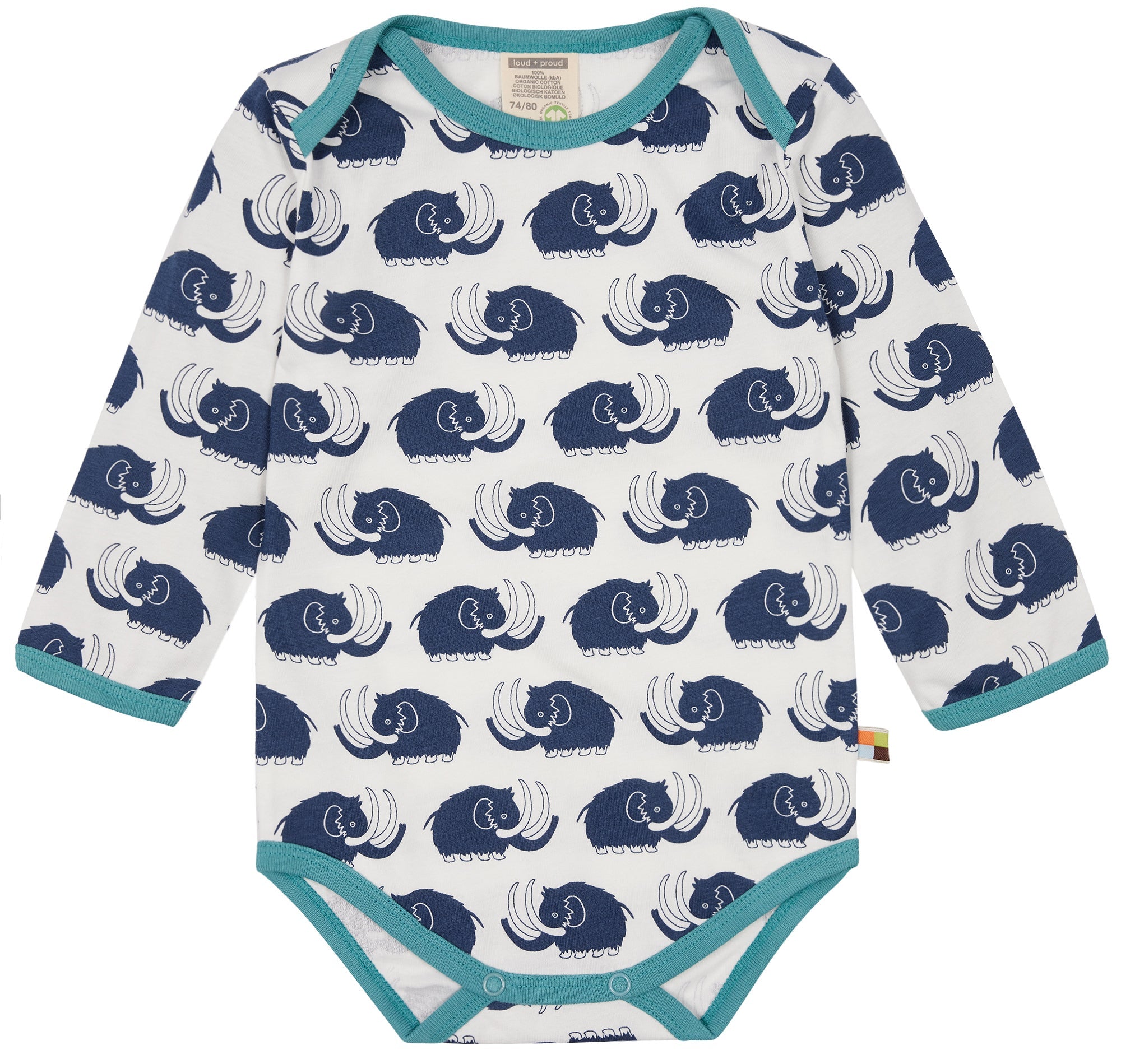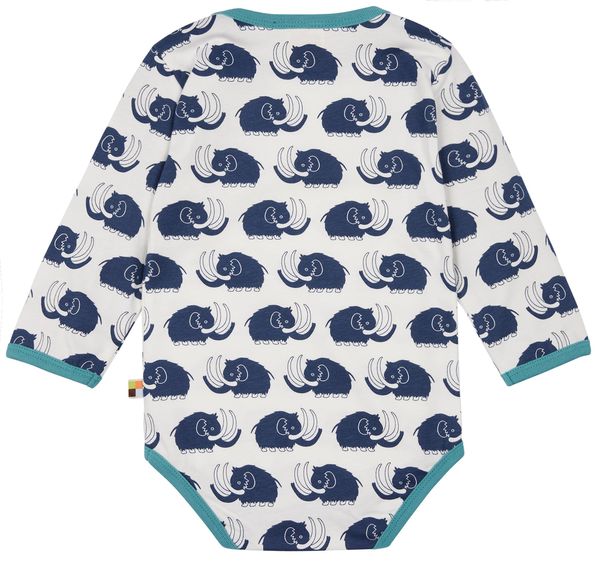 Long-sleeved bodysuit made of undyed, soft single jersey with all-over animal print (water-based print). All edges are trimmed with fine rib in a contrasting color. Crotch closure with two snap fasteners. Flag on the side seam. Made in Portugal. Washable at 30°C.