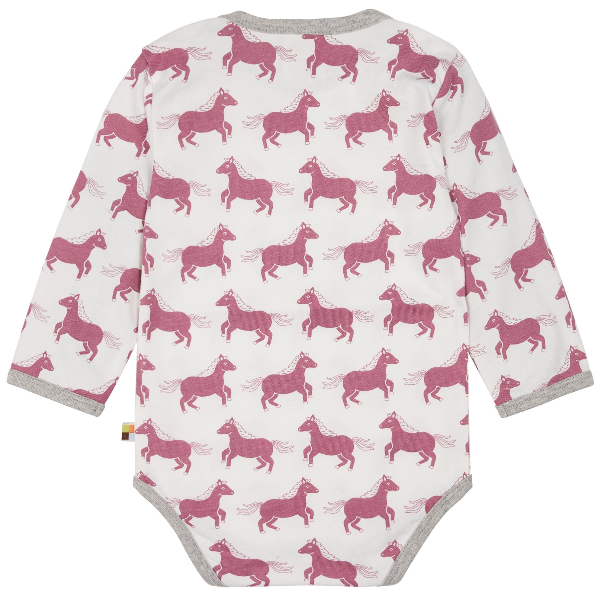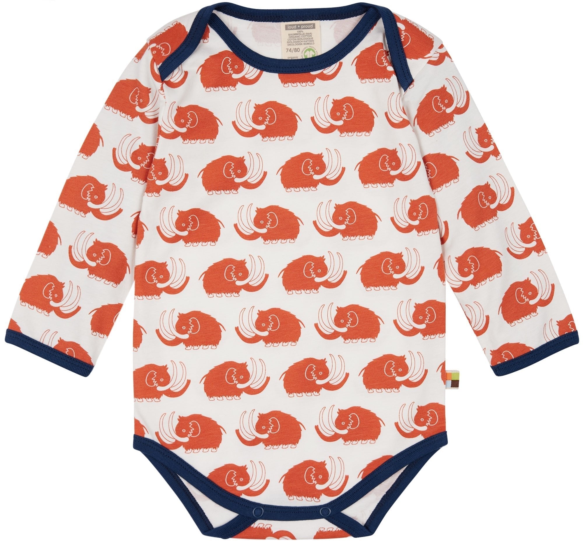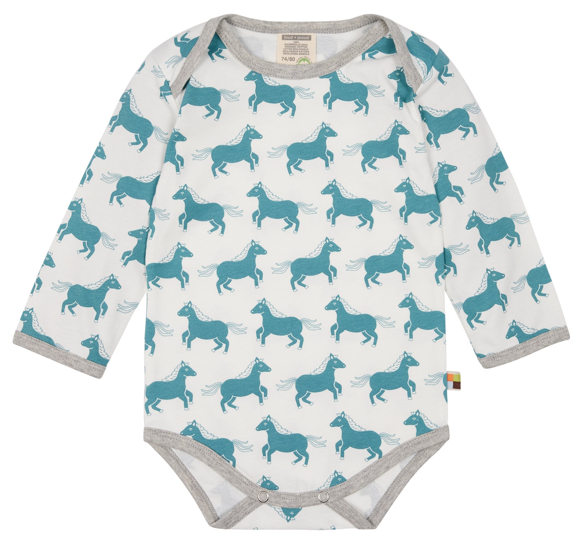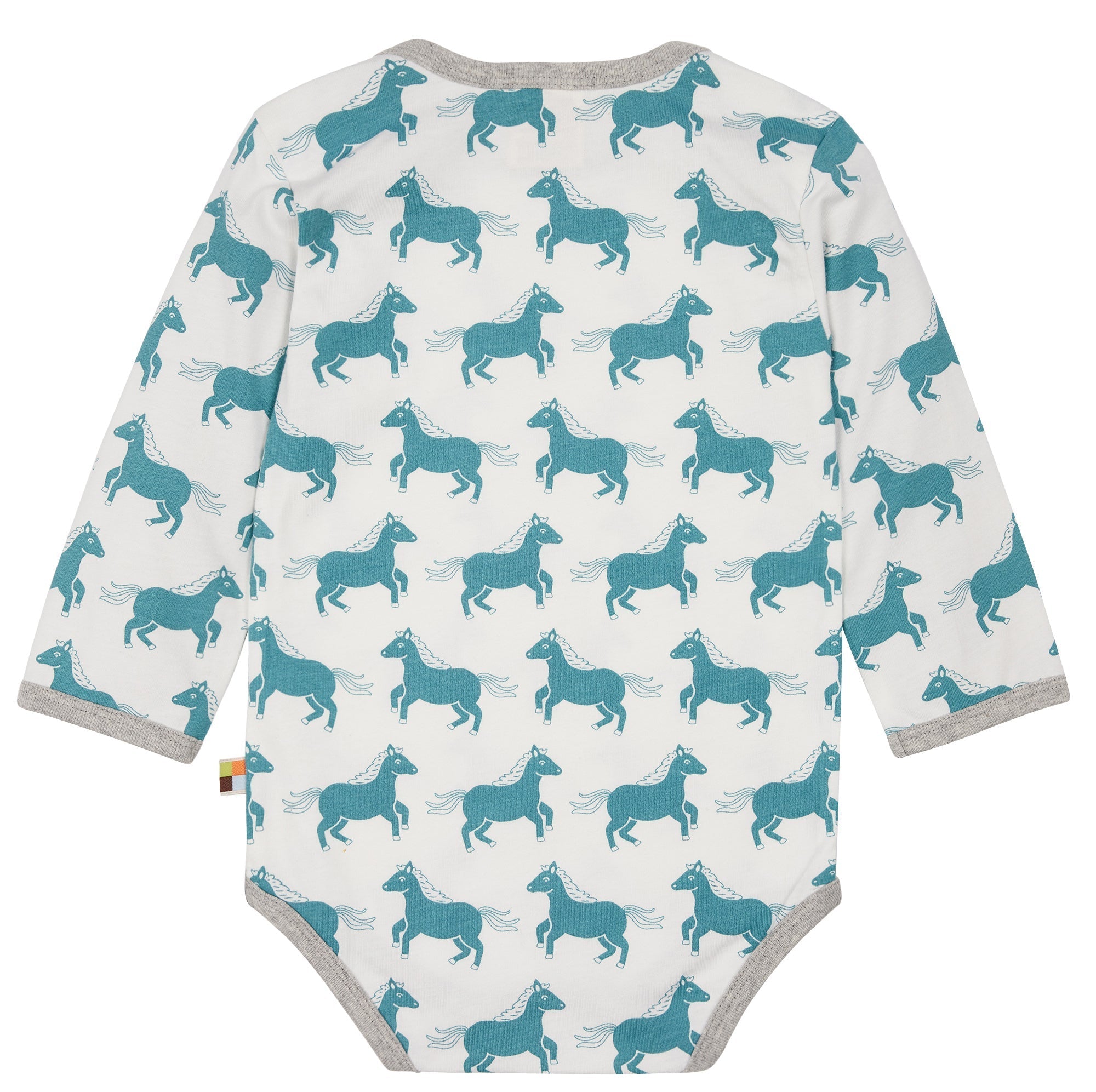 Long-sleeved bodysuit made of undyed, soft single jersey with all-over animal print (water-based print). All edges are trimmed with fine rib in a contrasting color. Crotch closure with two snap fasteners. Flag on the side seam. Made in Portugal. Washable at 30°C.