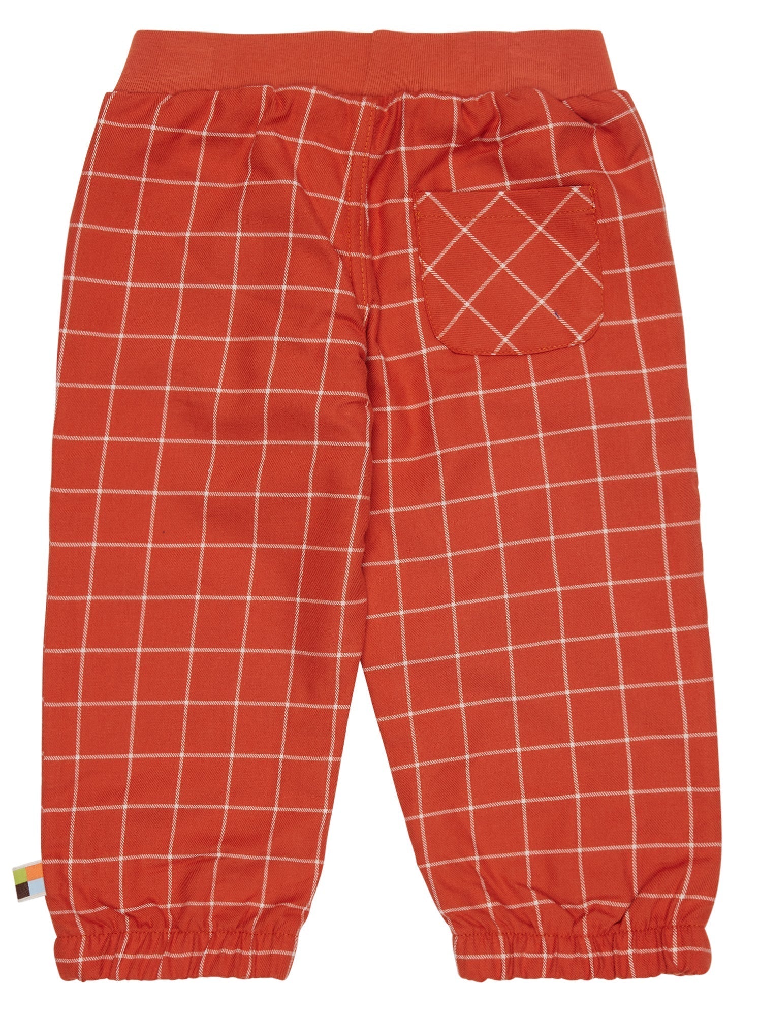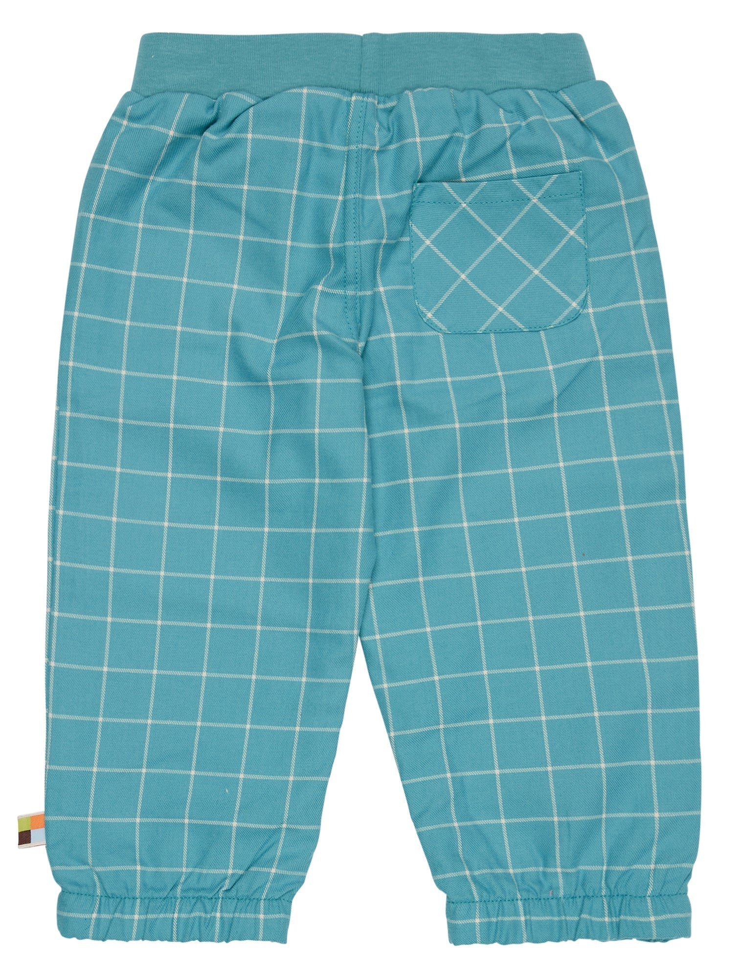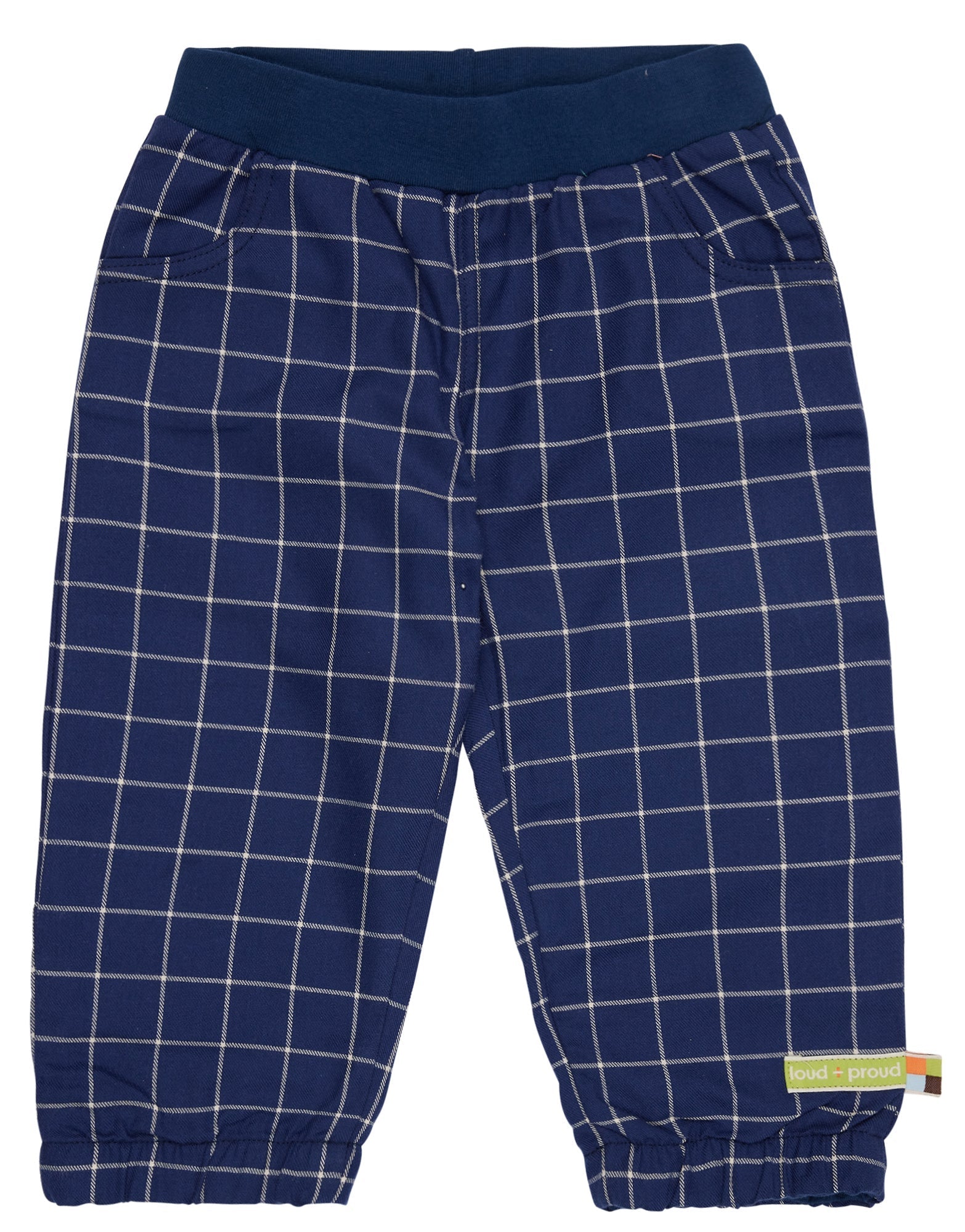 Checked poplin pants with a warm jersey lining. Soft elastic waistband. Front pockets. Back pocket on the right back. Logo label with flag on the left side seam. Made in Portugal. Washable at 30°C.