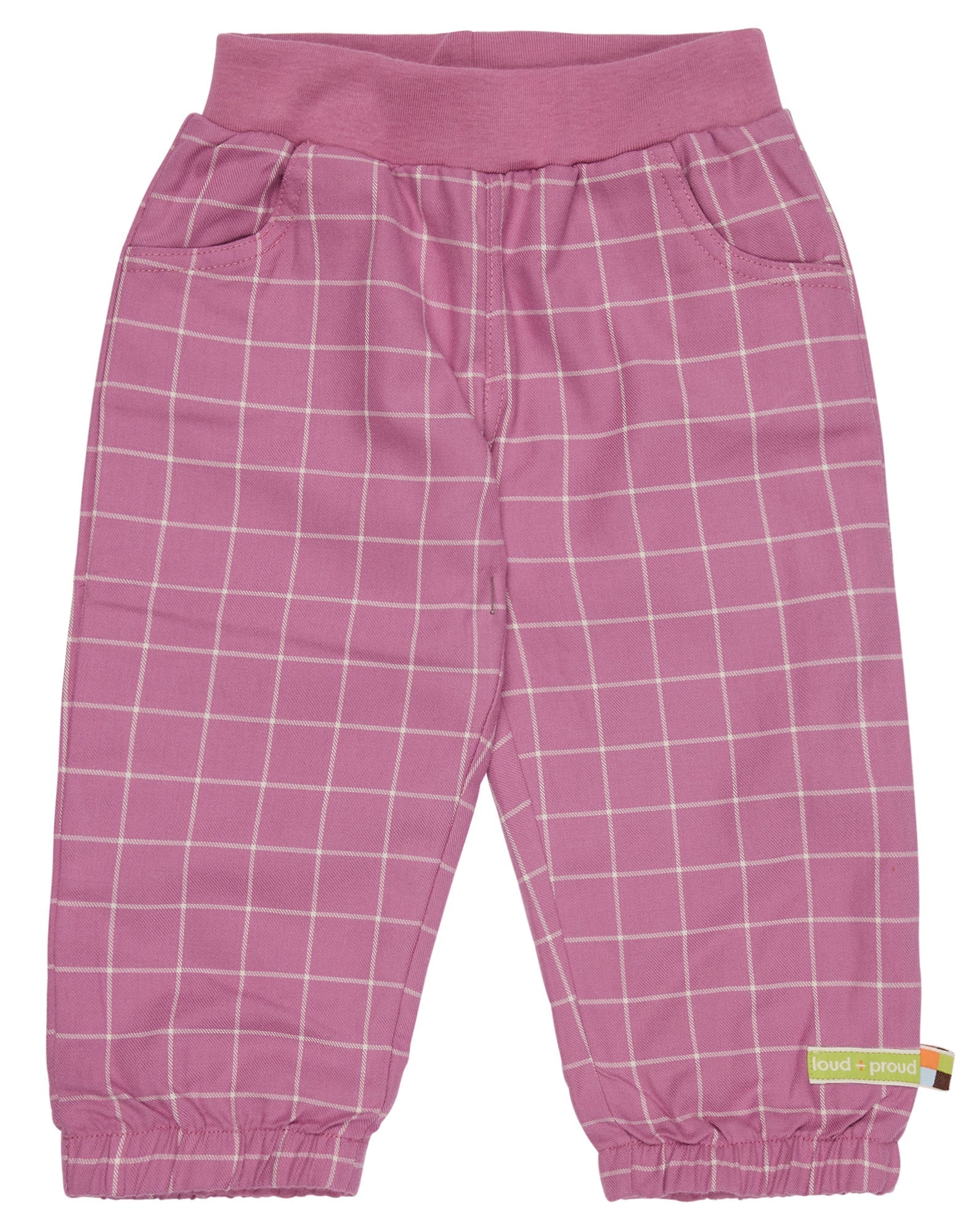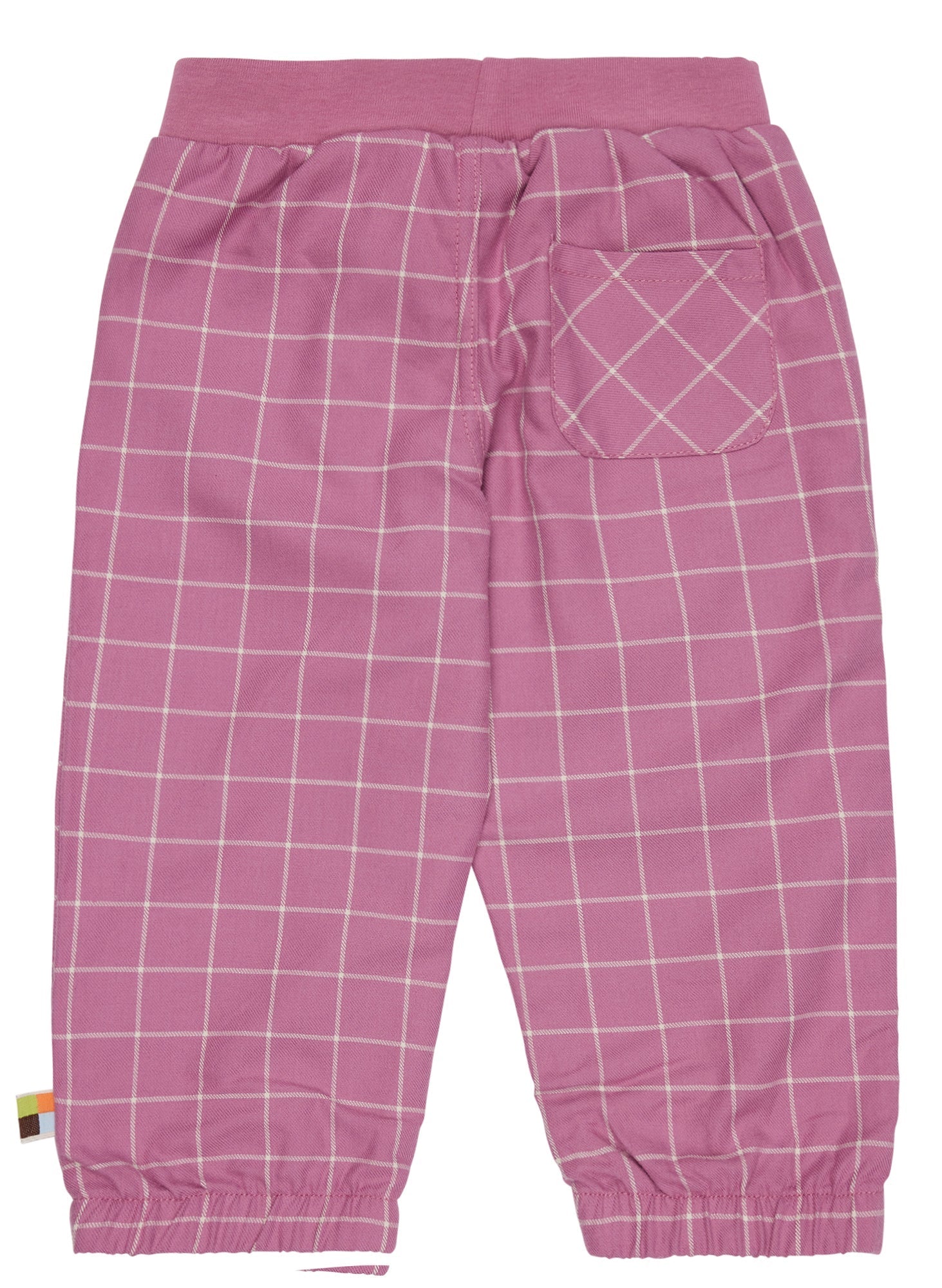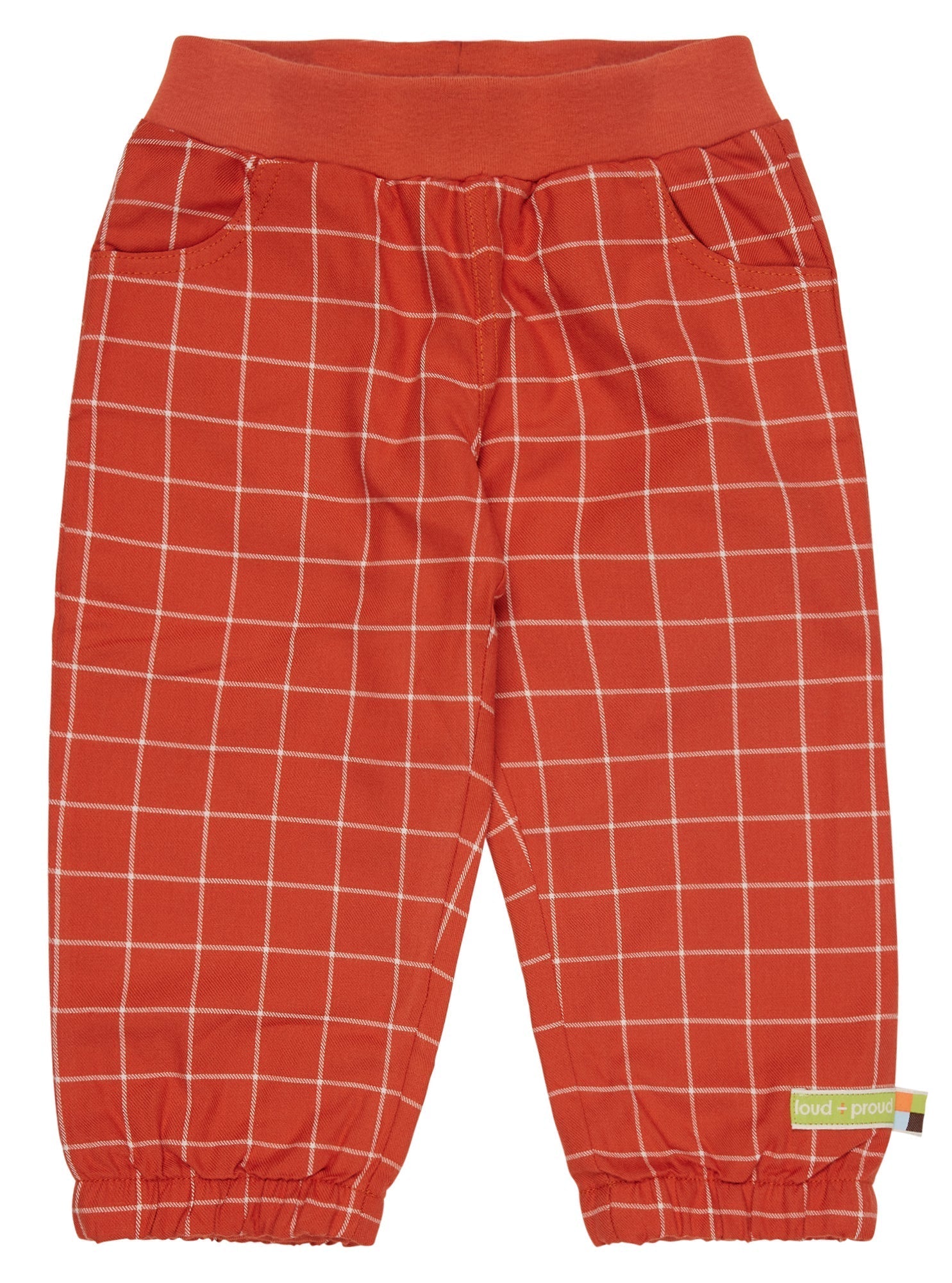 Checked poplin pants with a warm jersey lining. Soft elastic waistband. Front pockets. Back pocket on the right back. Logo label with flag on the left side seam. Made in Portugal. Washable at 30°C.