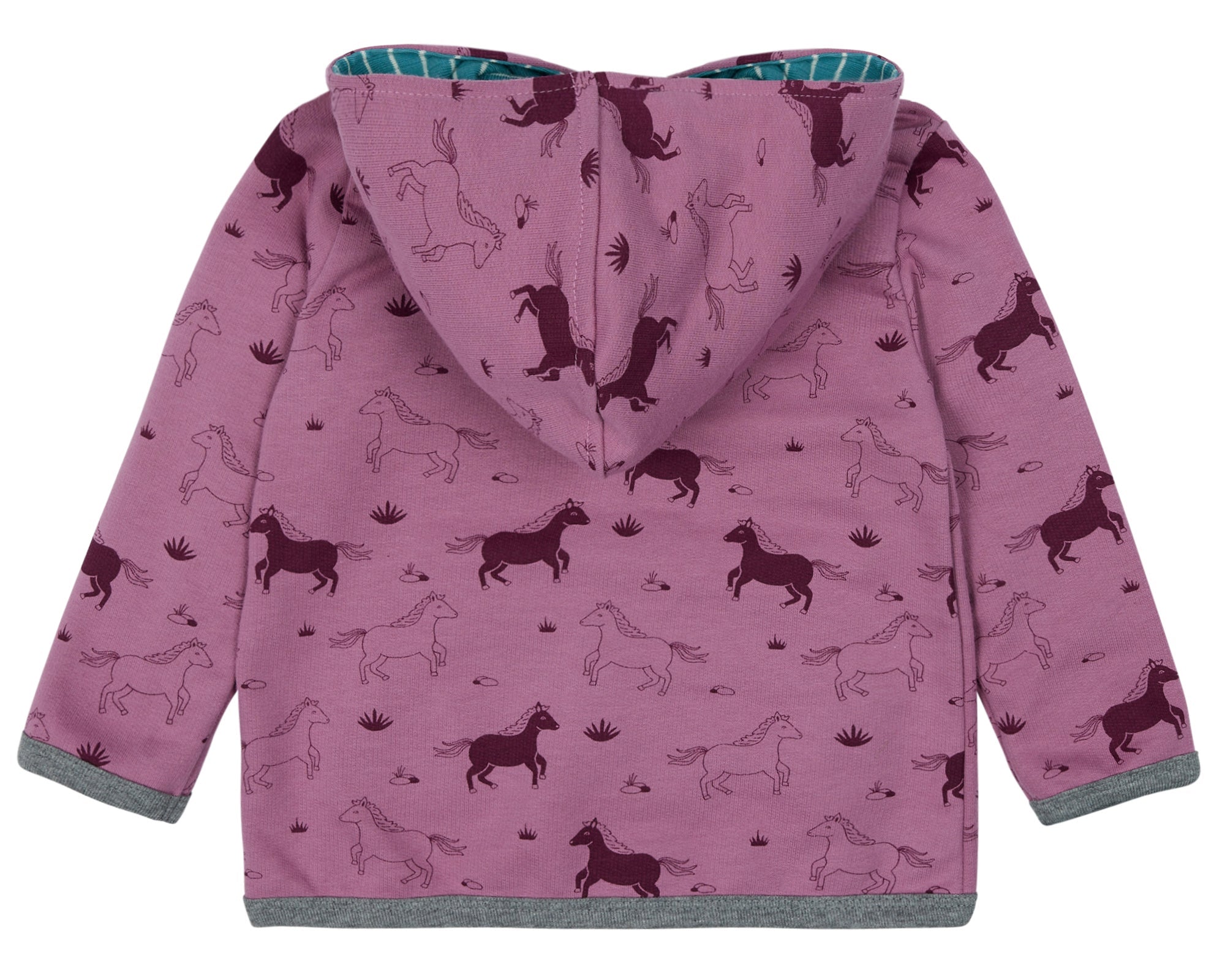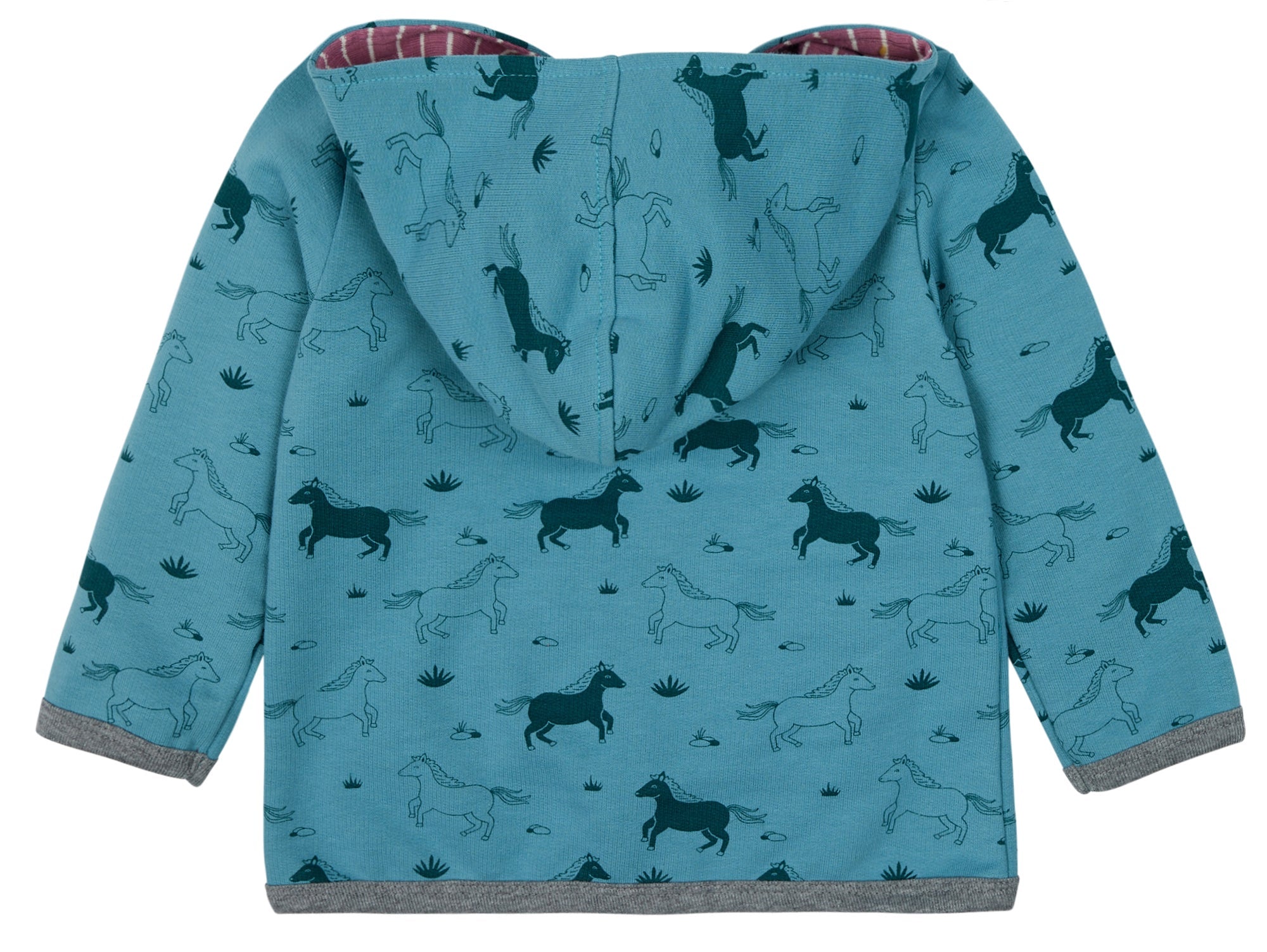 Sweat jacket with an all-over print and brushed interior. The hood is lined with striped jersey. Front zipper in a contrasting color. Kangaroo patch pocket with contrasting piping at the opening. Logo label with flag on the pocket. Made in Hungary. Washable at 30°C.