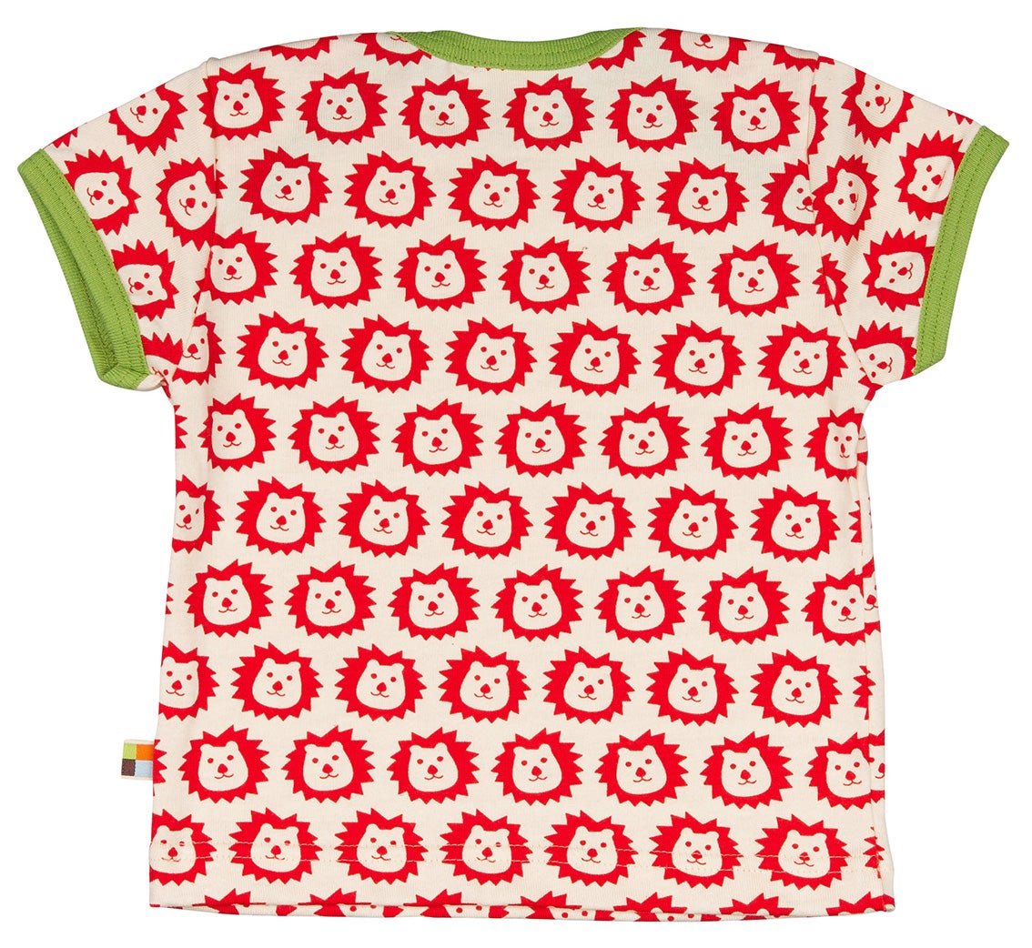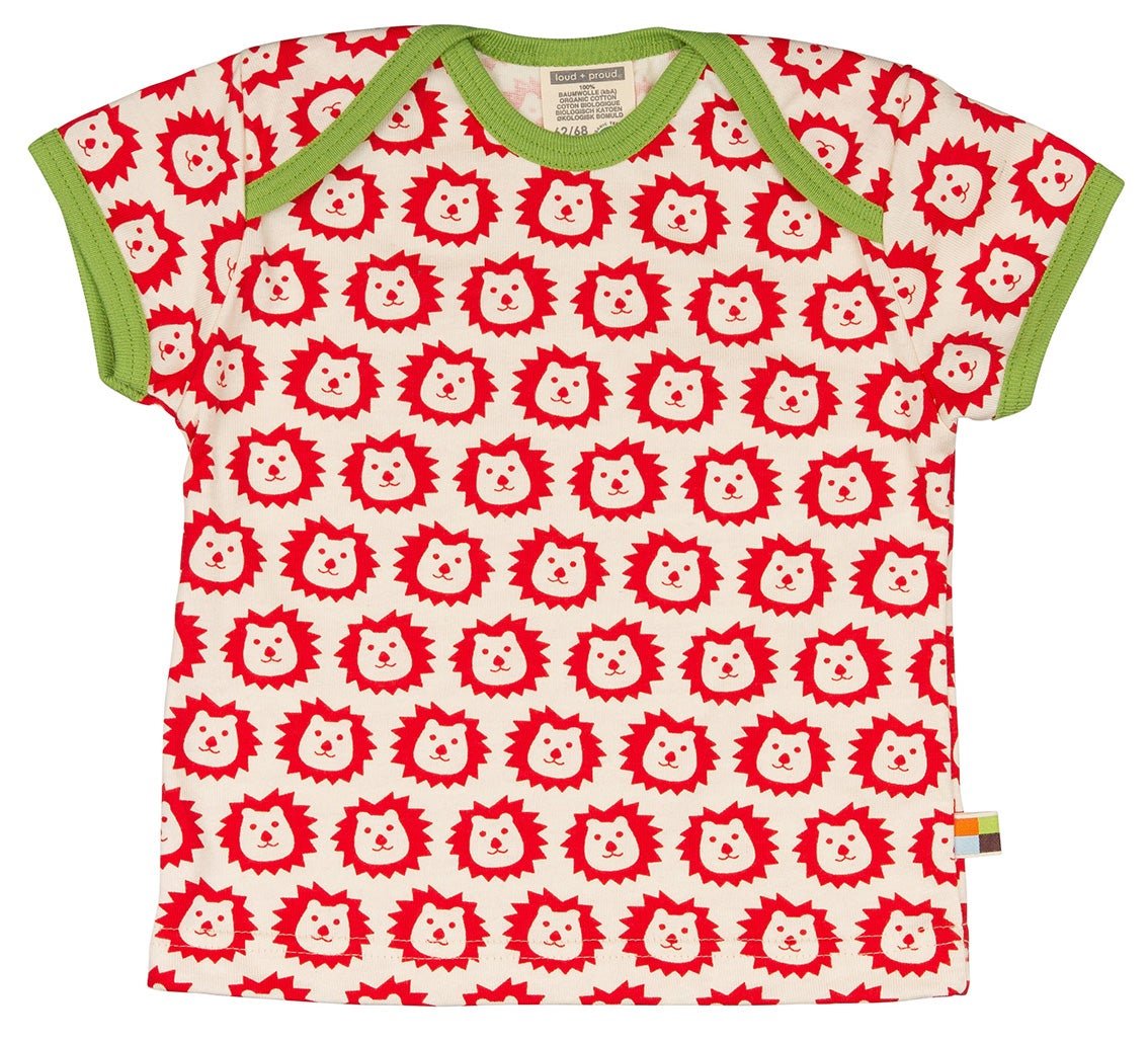 T-shirt made of undyed, soft single jersey with an all-over print (water-based print). All edges are trimmed with fine rib in a contrasting color. Up to size 86/92, the neckline opens wide; from size 98/104, it features a round neck. Flag on the side seam. Made in Germany. Washable at 30°C.