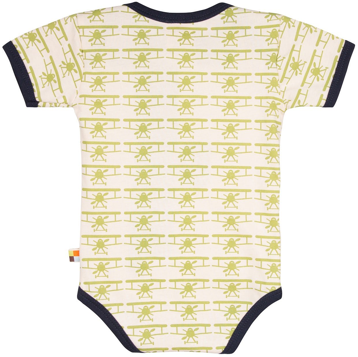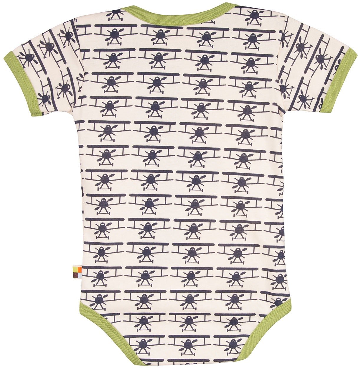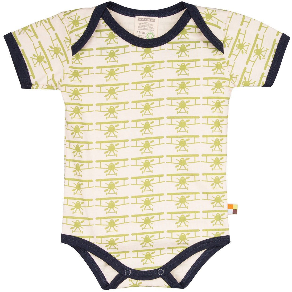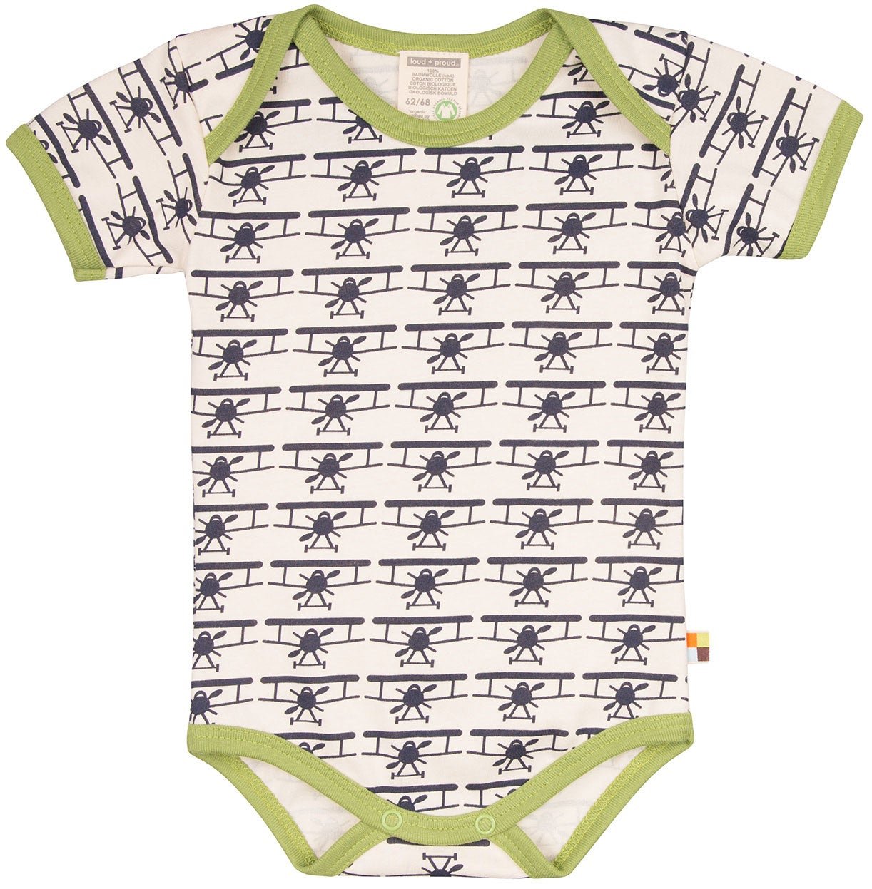 Short-sleeved bodysuit made of undyed, soft single jersey with an all-over water-based print. All edges are trimmed with fine rib in a contrasting color. Crotch closure with two snap fasteners. Flag on the side seam. Made in Hungary. Washable at 30°C.