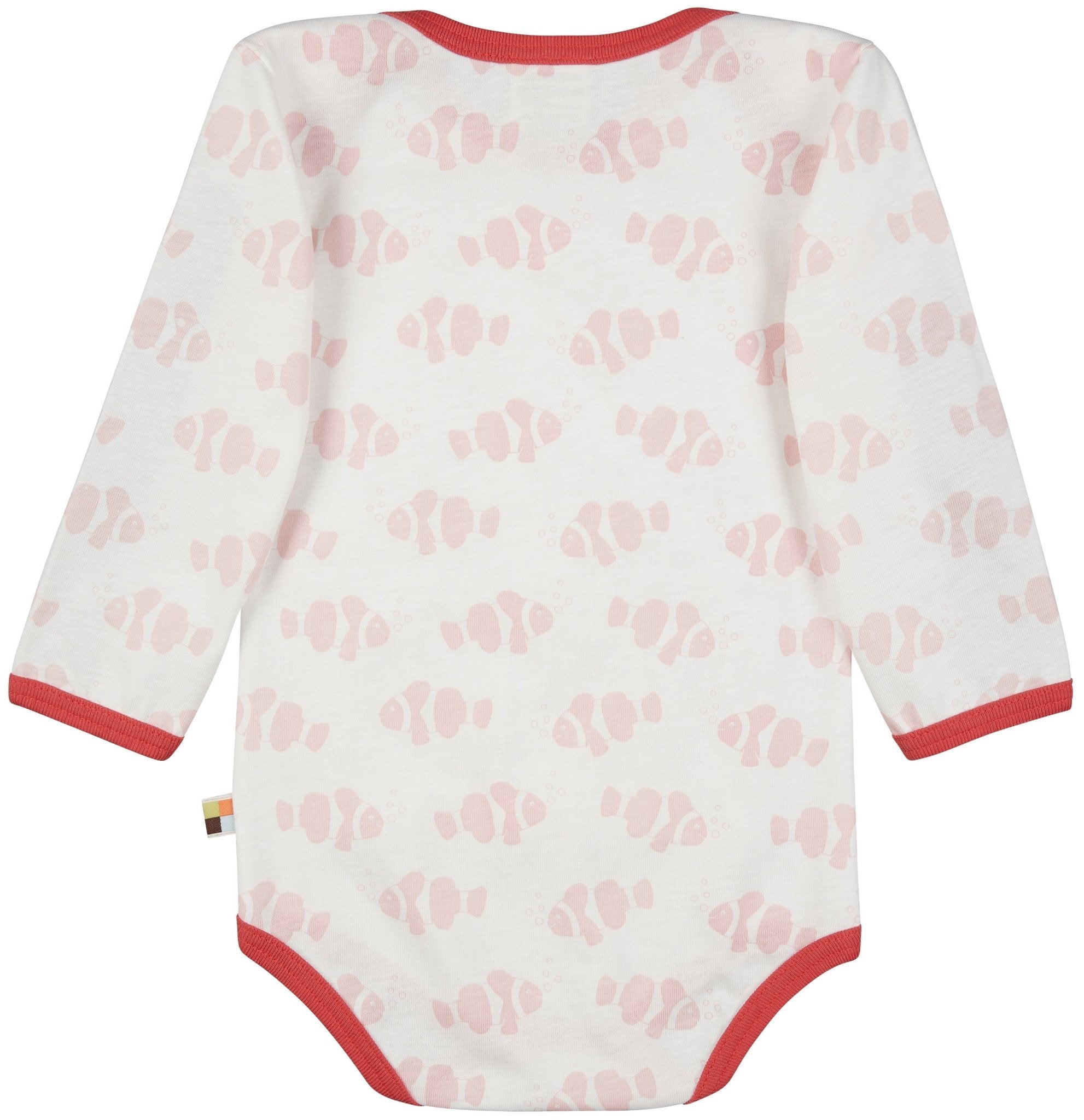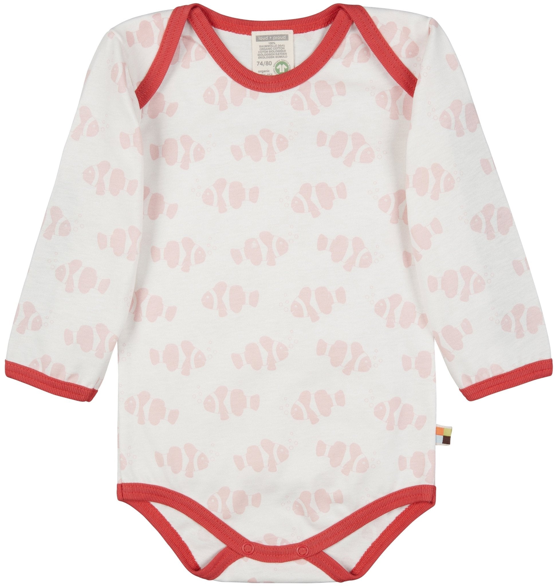Long-sleeved bodysuit made of undyed, soft single jersey with an all-over animal motif (water-based print). All edges are trimmed with fine rib in a contrasting color. Crotch closure with two snap fasteners. Flag on the side seam. Made in Hungary. Washable at 30°C.