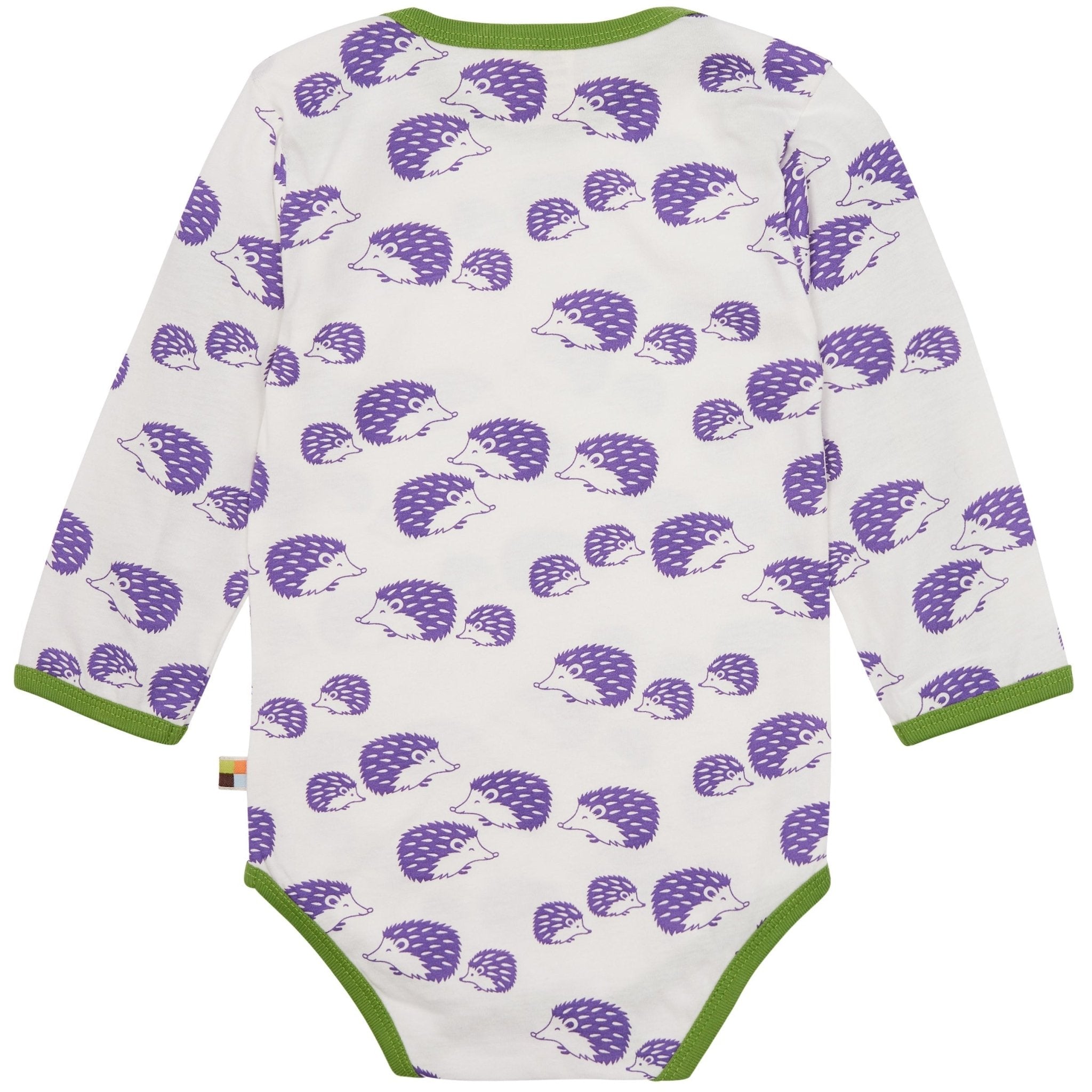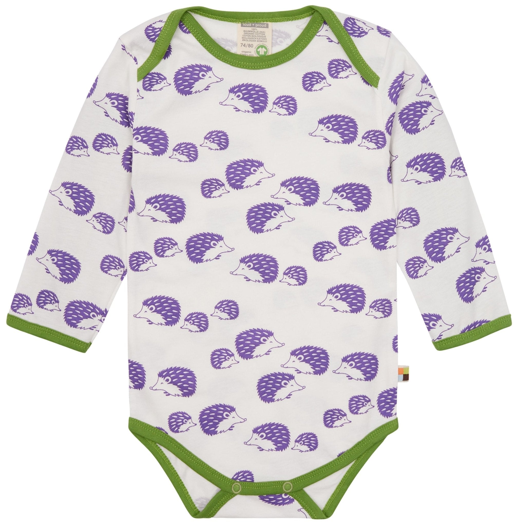 Long-sleeved bodysuit made of undyed, soft organic cotton with an all-over hedgehog or fox print (water-based print). All edges are trimmed with fine rib in a contrasting color. A slip-on neckline for easy changing and a crotch closure with two snaps. A flag on the side seam. Made in Portugal. Washable at 30°C.