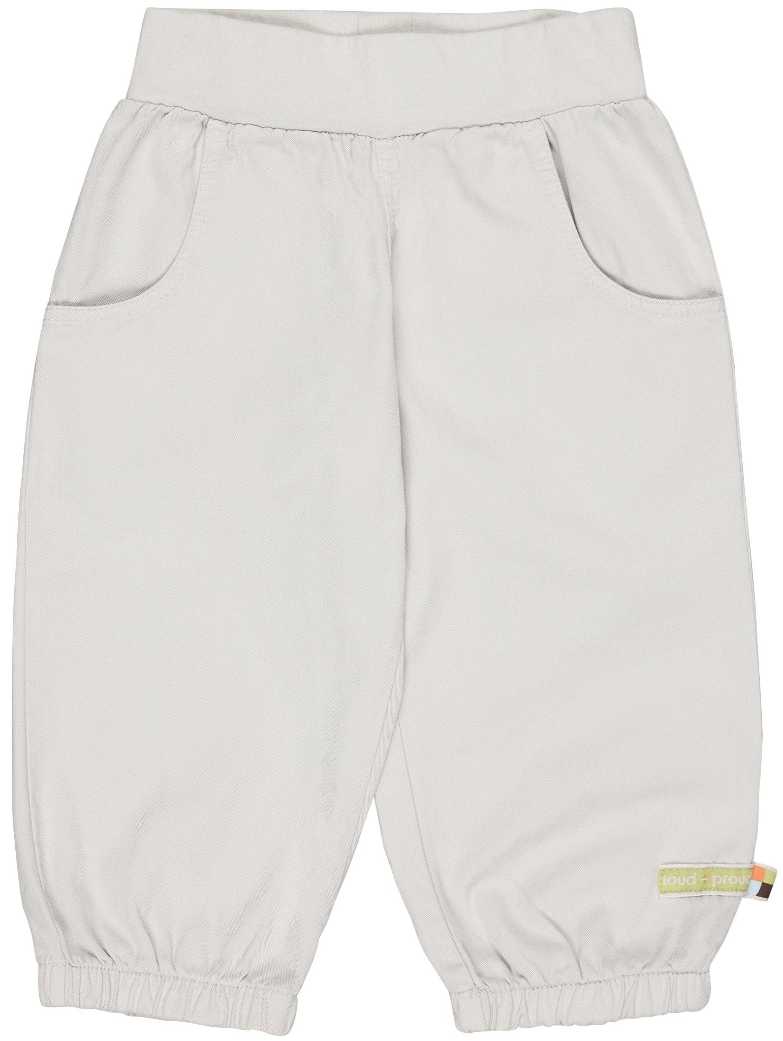 Woven pants made of soft twill with a jersey lining. Elastic waistband with contrasting drawstring. Front pockets. Elastic hem. Logo label and flag on the side seam. Made in Portugal. Washable at 30°C.
