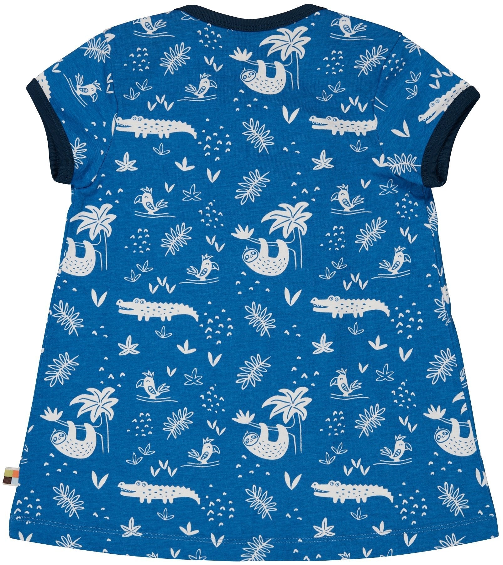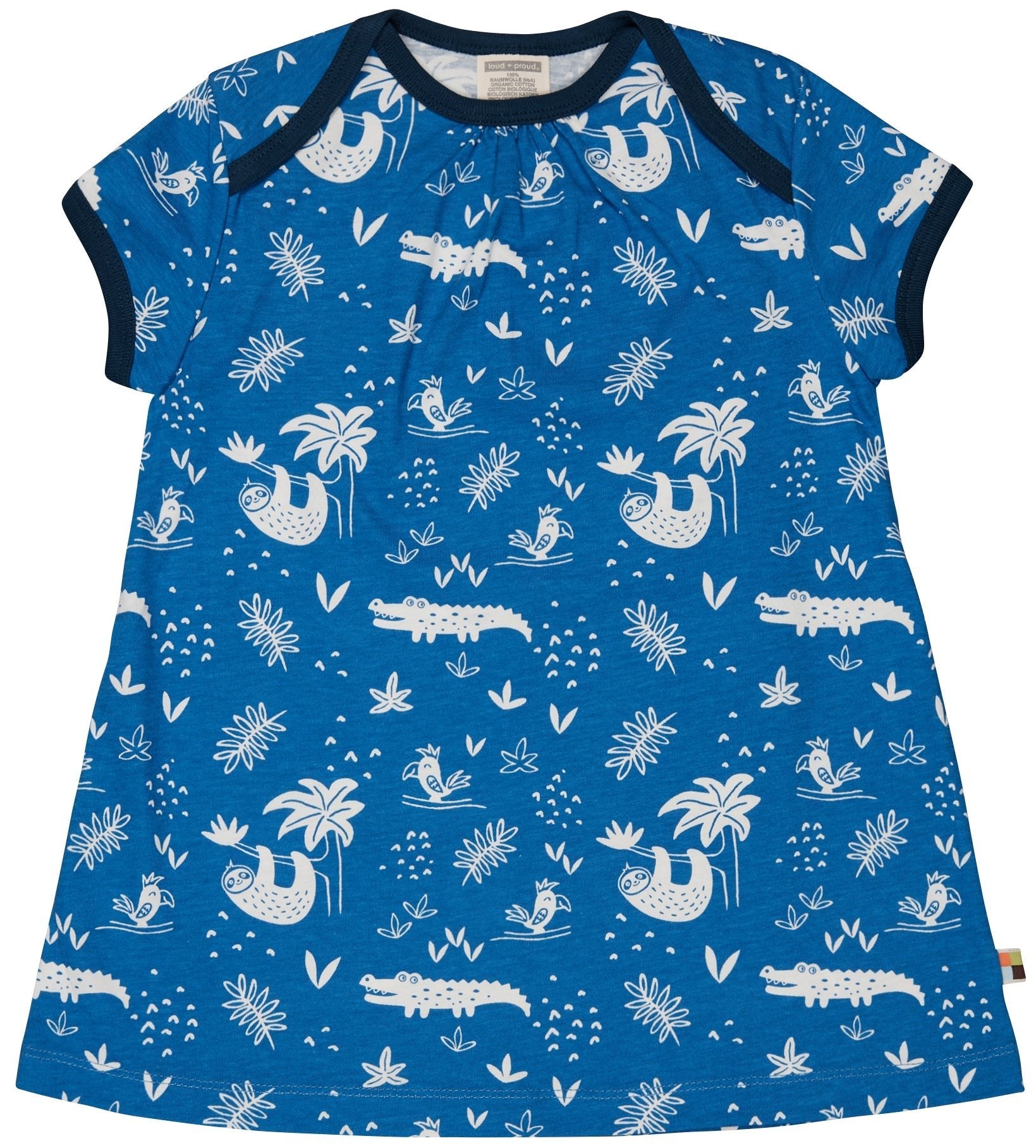 Dress made of undyed, soft single jersey with an all-over print (water-based print). Ruffled at the neckline. All edges are trimmed with fine rib in a contrasting color. The neckline opens wide up to size 86/92, and the round neckline starts at size 98/104. Flag on the side seam. Made in Portugal. Washable at 30°C.