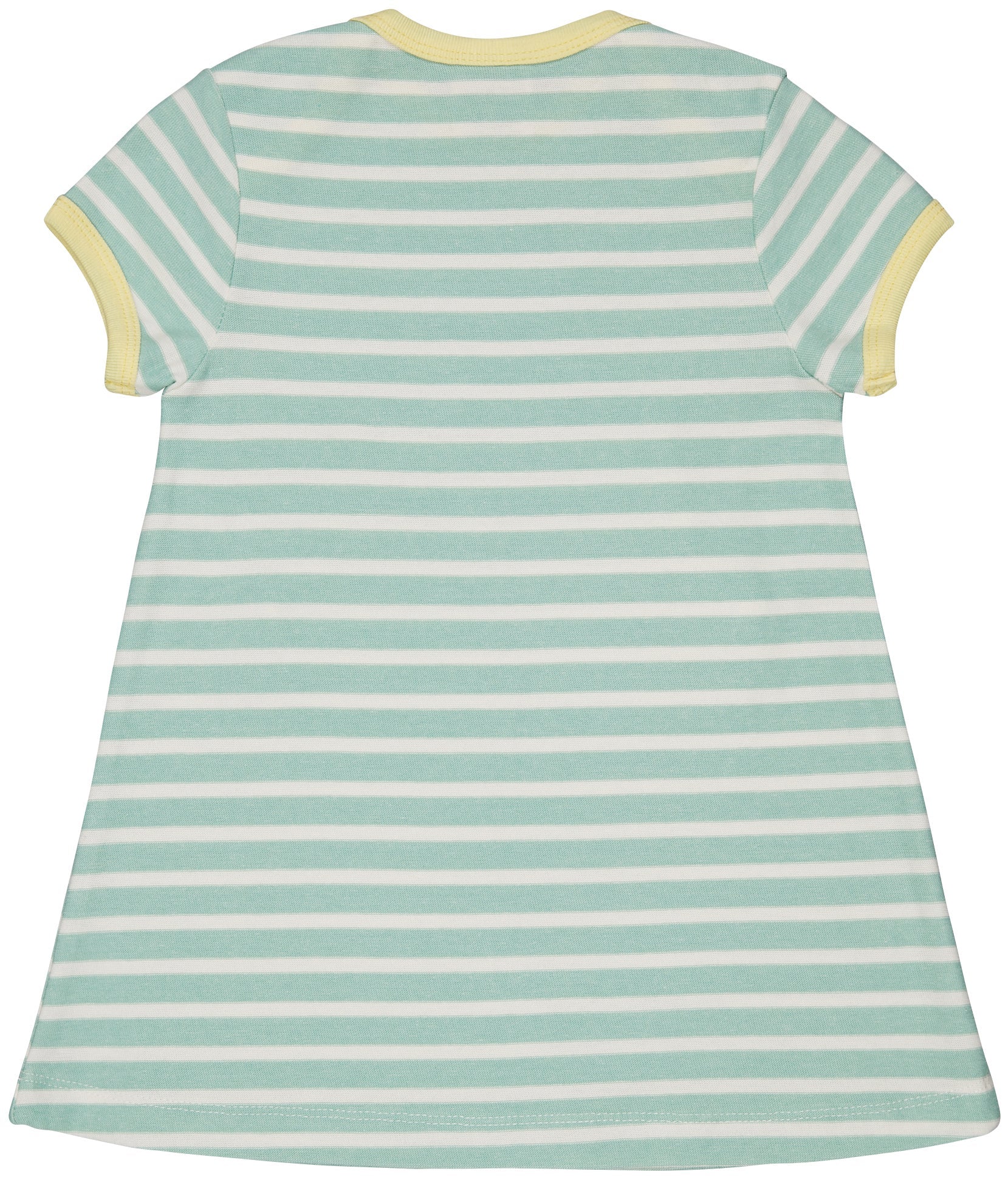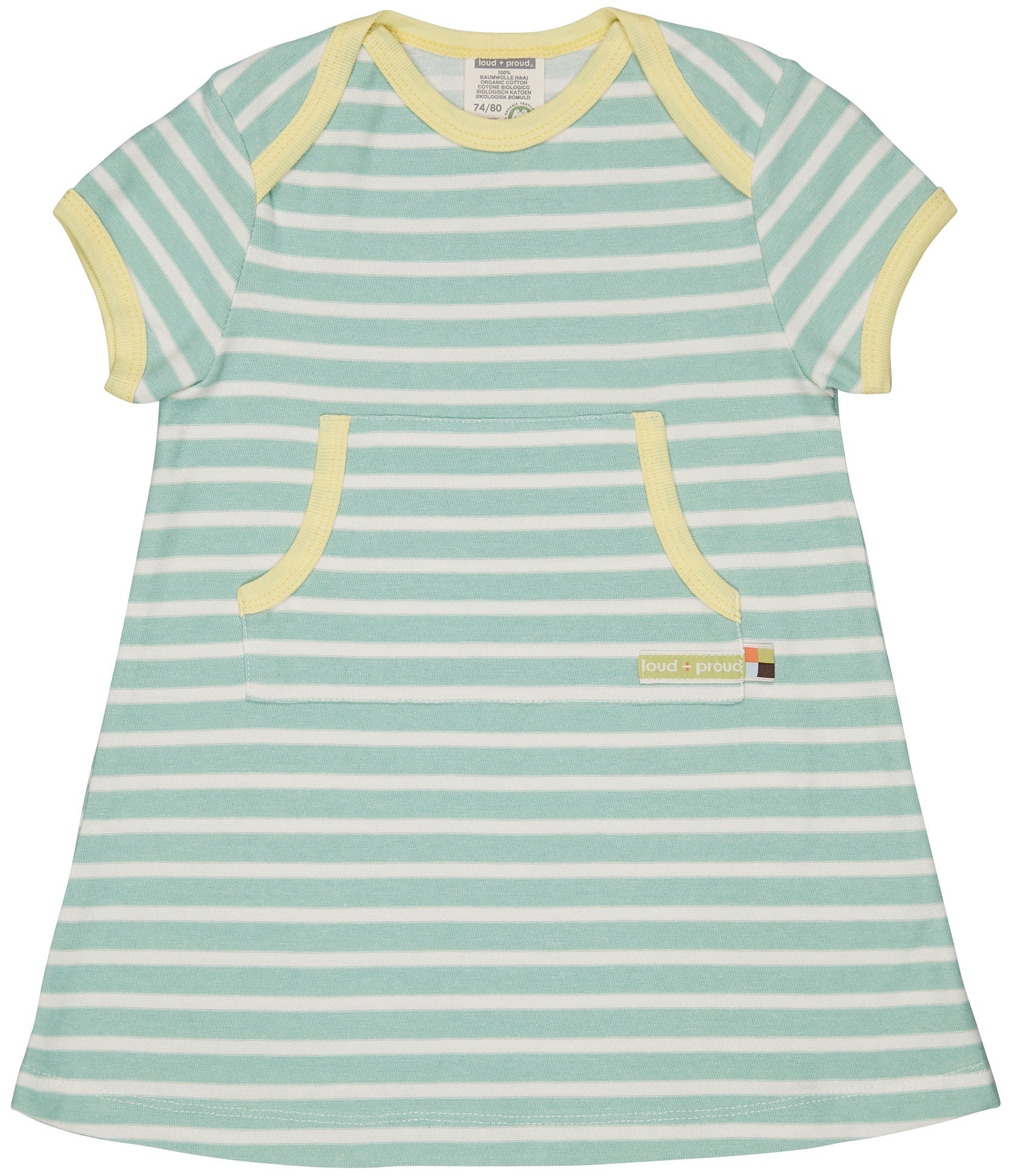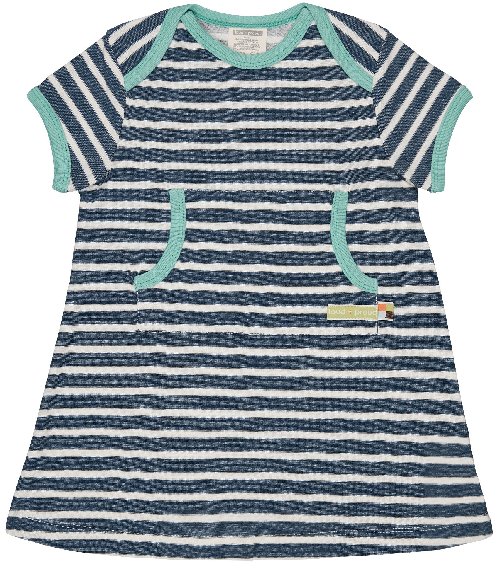 Dress made of soft jersey with mottled stripes, worked inside out. All edges are trimmed with contrasting fine rib. Kangaroo patch pocket at the front. A wide opening neckline is available up to size 86/92, and a round neckline is available from size 98/104. Logo label with flag on the pocket. Made in Portugal. Washable at 30°C.