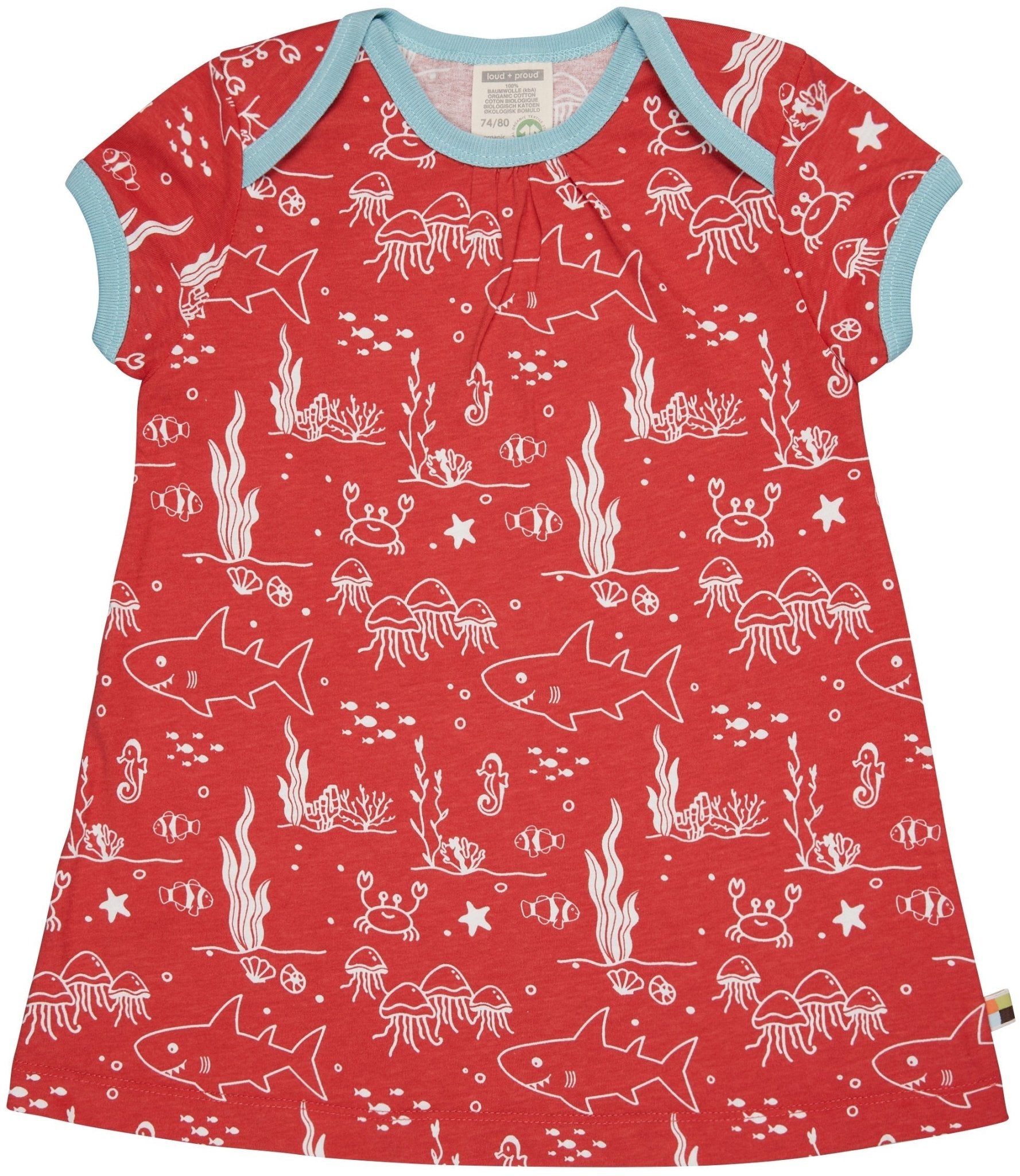 Dress made of undyed, soft single jersey with an all-over print (water-based print). Ruffled at the neckline. All edges are trimmed with fine rib in a contrasting color. The neckline opens wide up to size 86/92, and the round neckline is available from size 98/104. Flags on the side seam. Made in Portugal. Washable at 30°C.