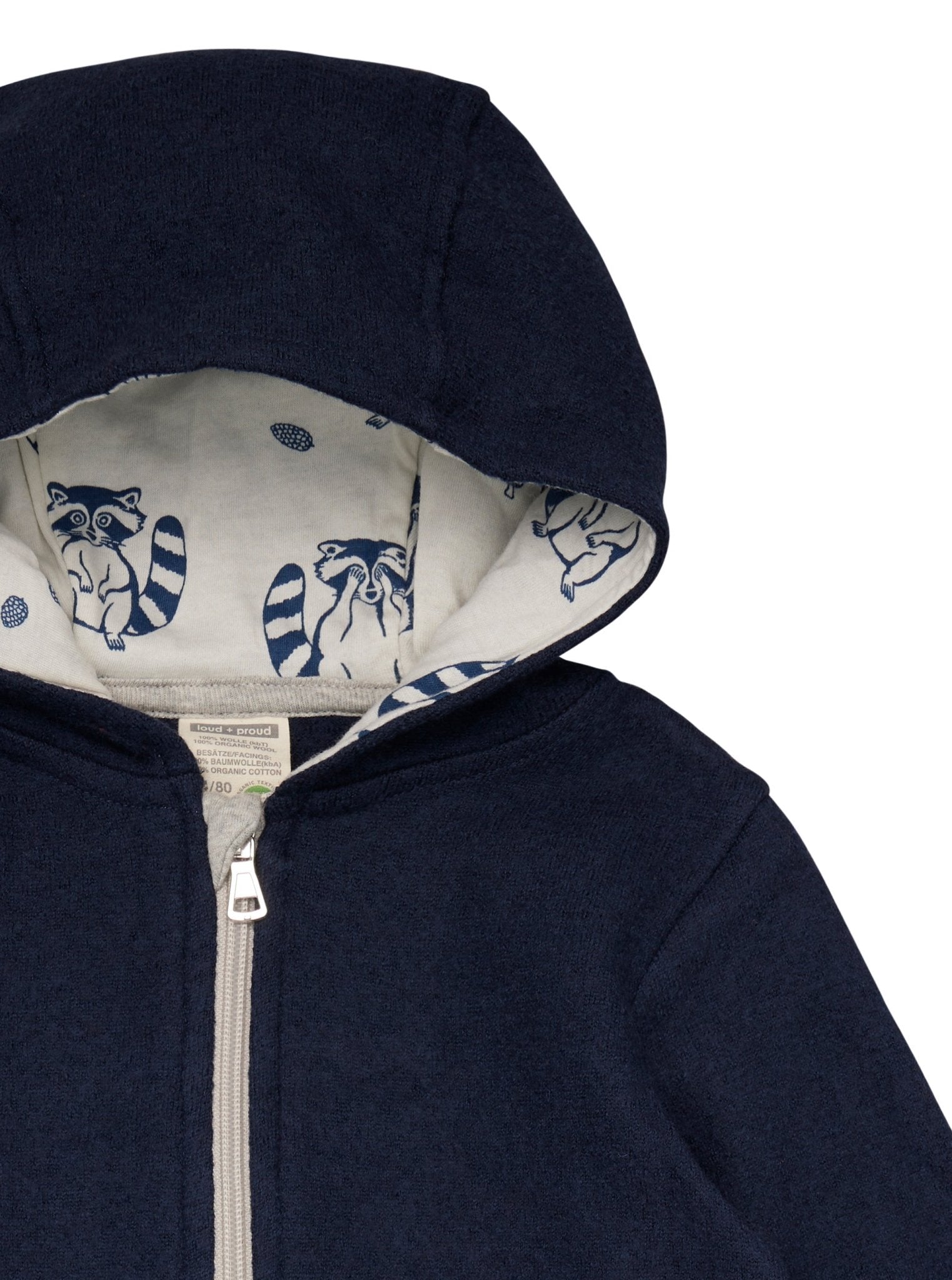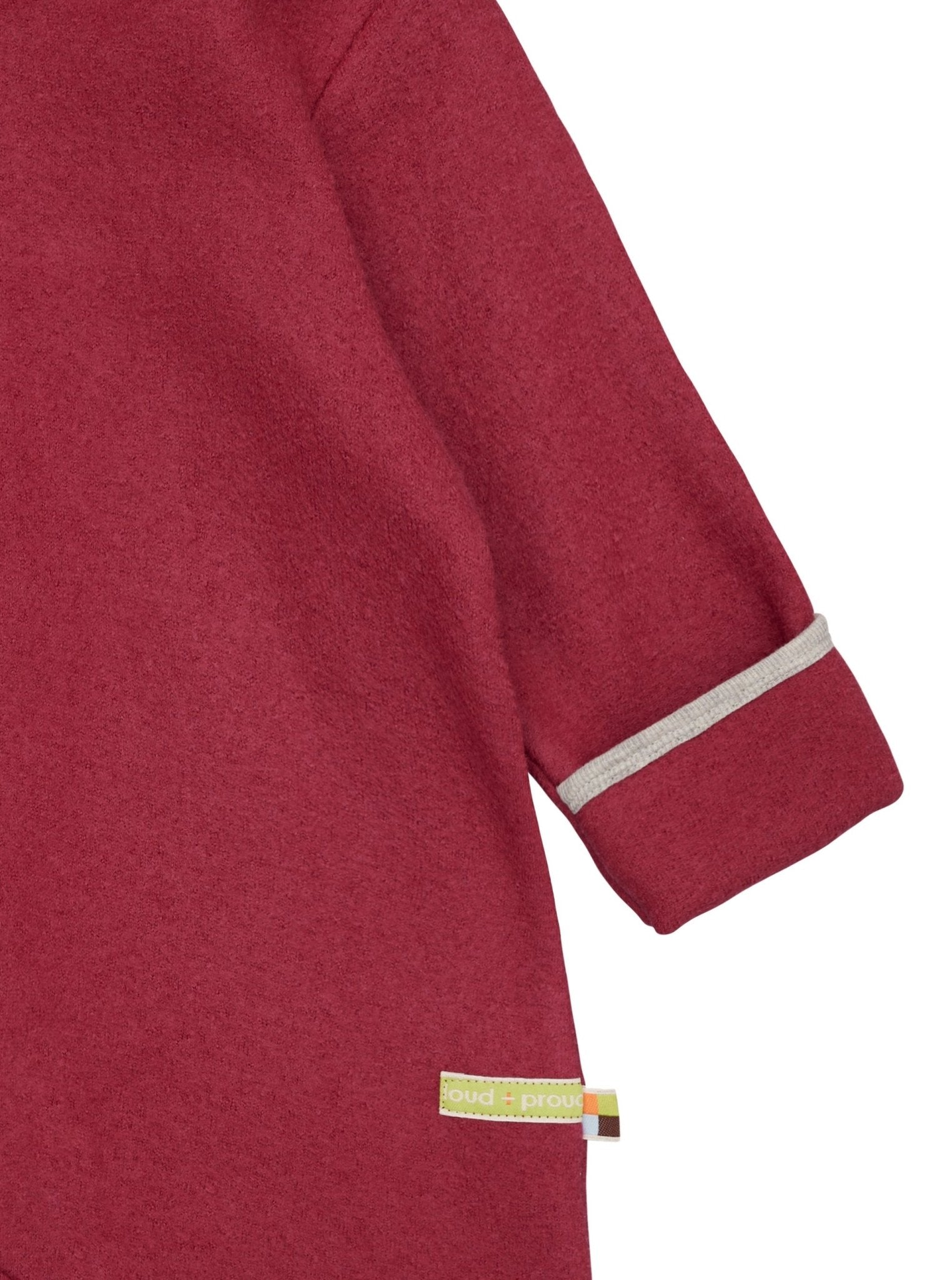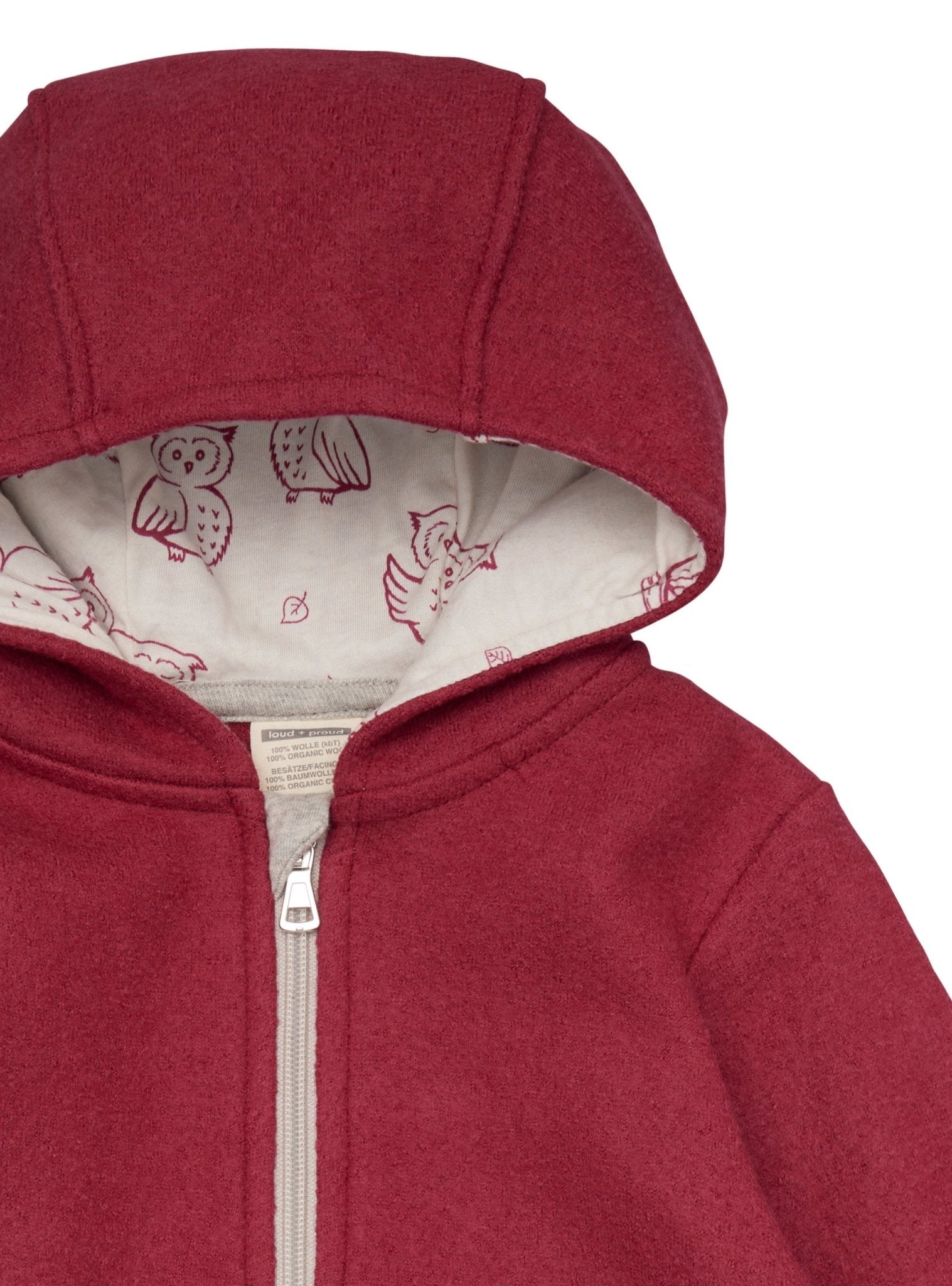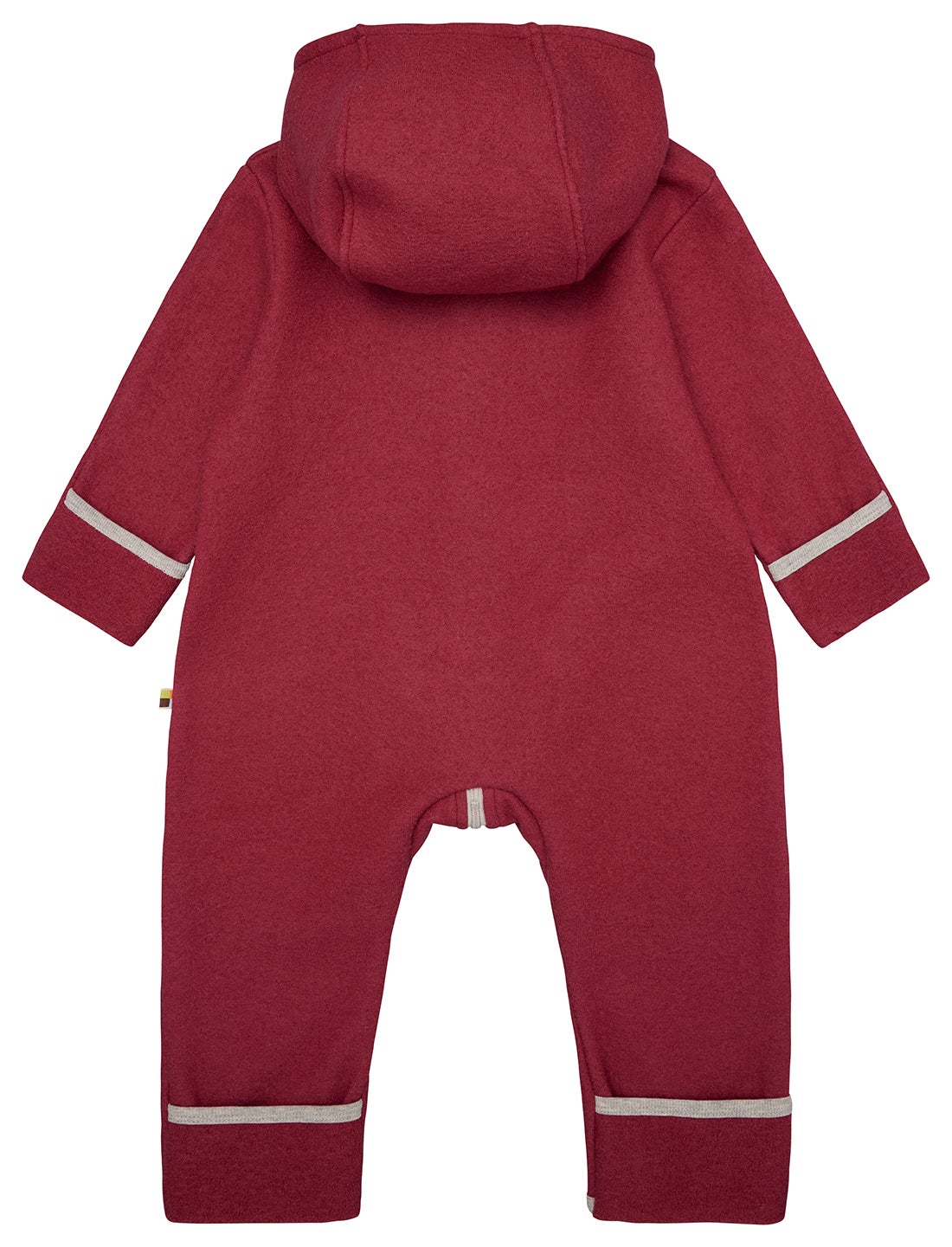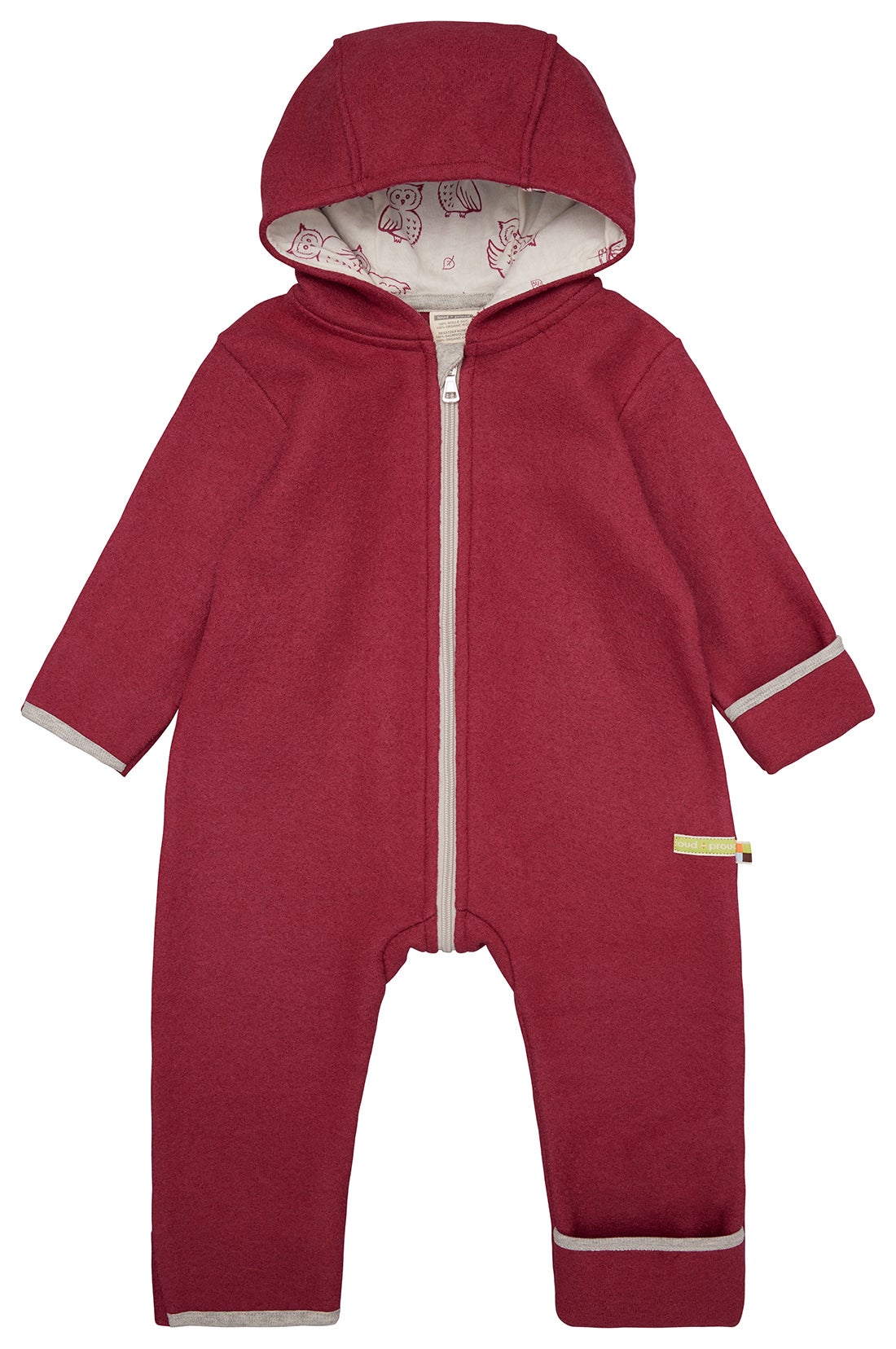 Overall made of warm boiled wool. The hood is lined with printed cotton jersey. It features a front zipper and a zipper garage at the neck. It features fold-over mittens and booties. A logo label with a flag is attached to the side seam. Washable at 30°C on a wool cycle. Spin briefly at a low speed and reshape while wet. Made in Hungary.