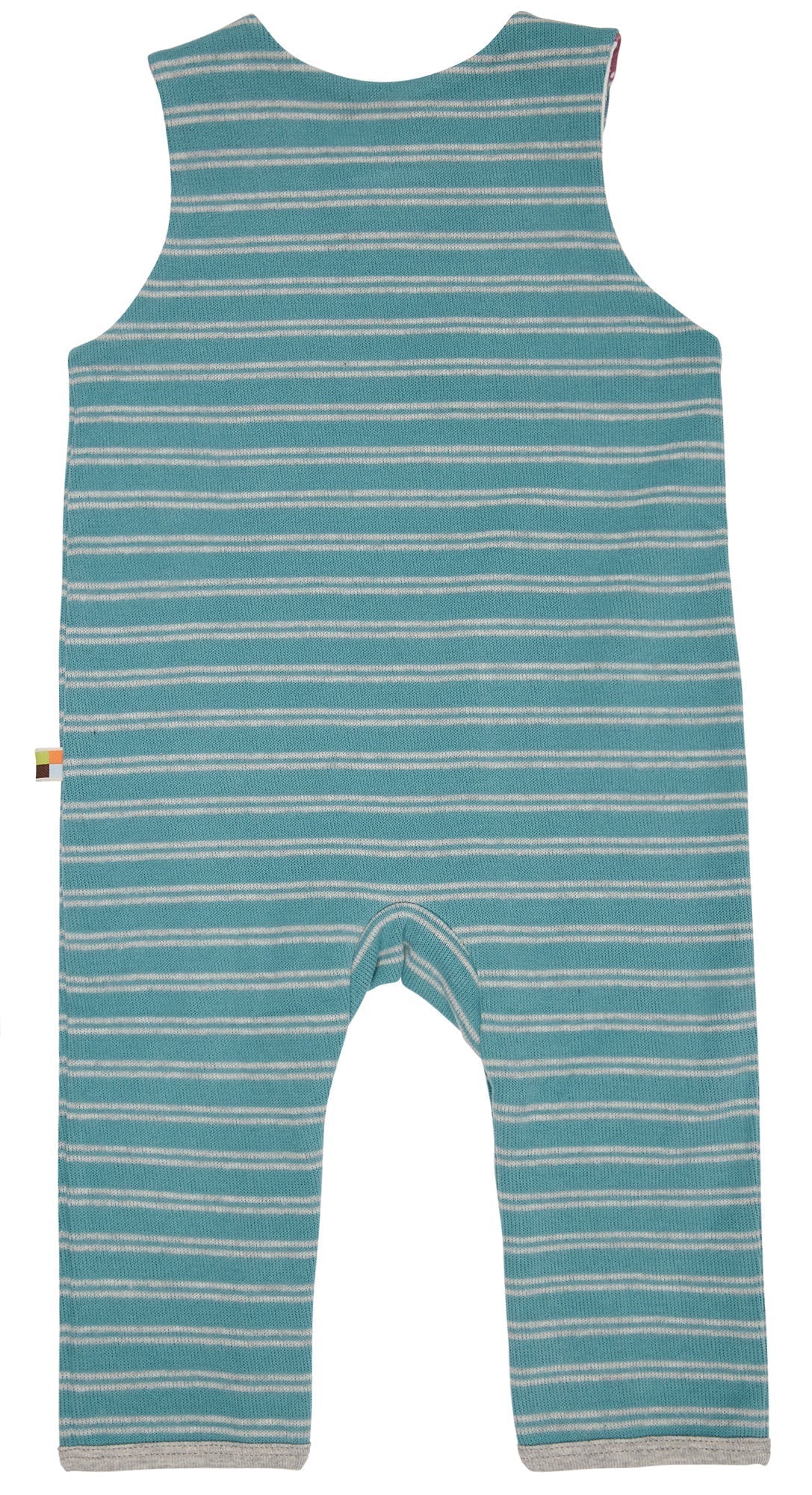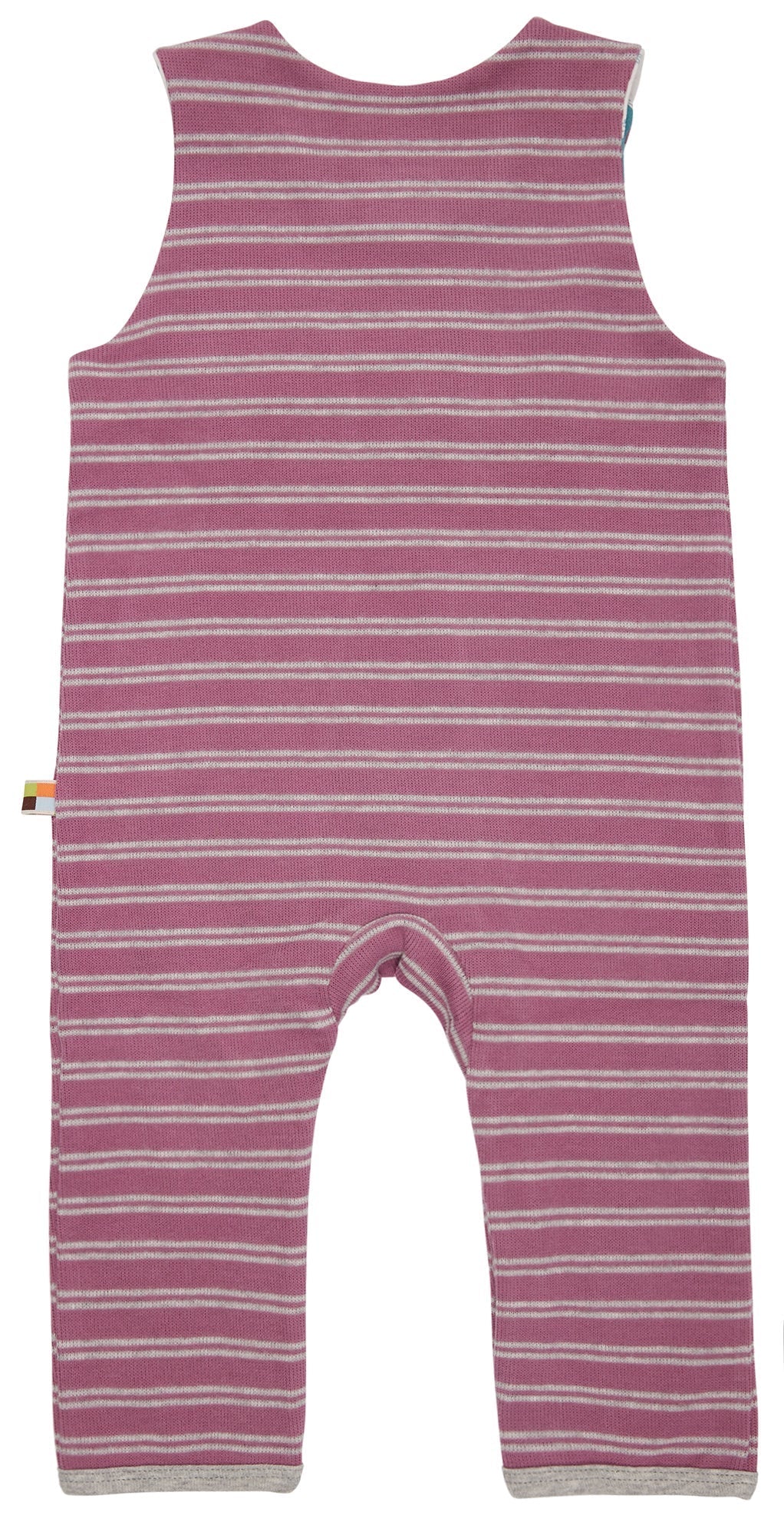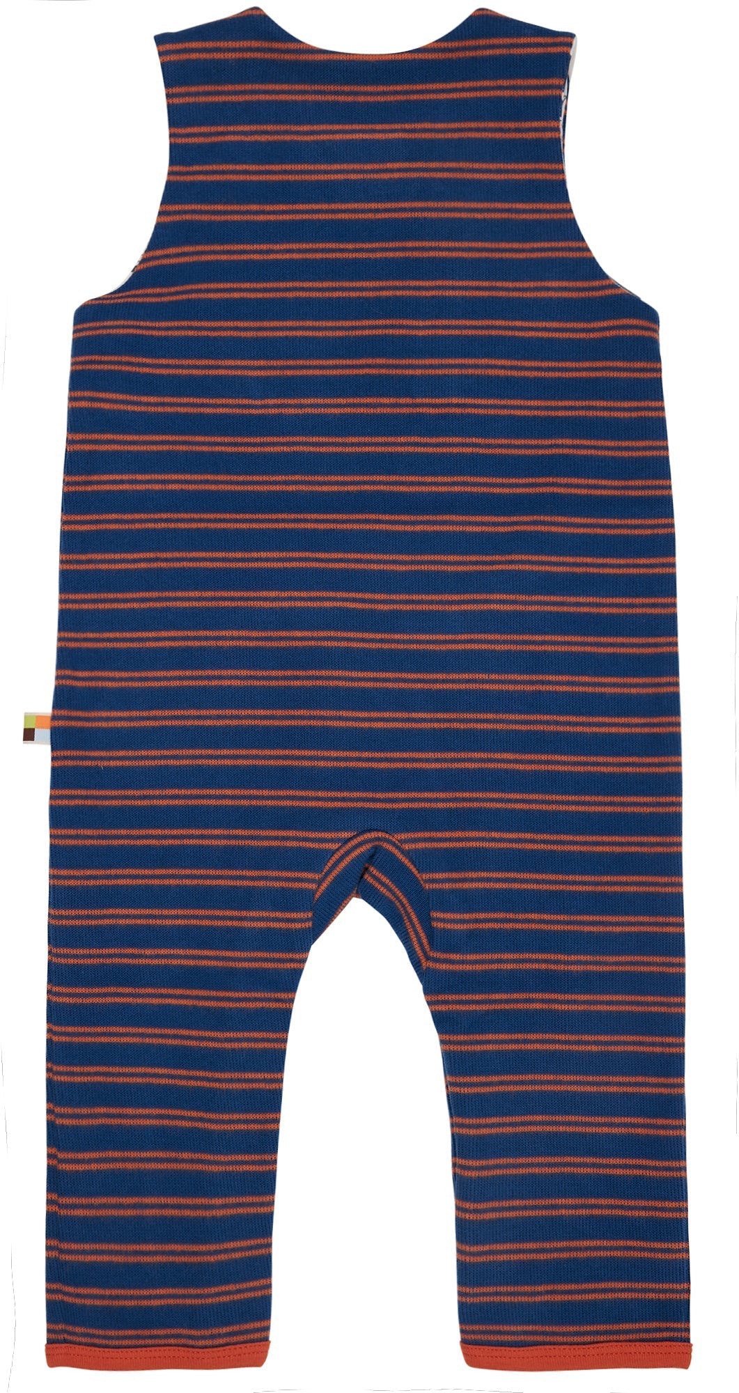 Striped interlock romper with a sanded exterior. Buttons on the shoulders for easy dressing. The shoulder area is lined with printed jersey. The crotch seam can be opened and closed with nickel-free snaps for easy changing. A logo label with a flag is attached to the pocket. Made in Portugal. Washable at 30°C.