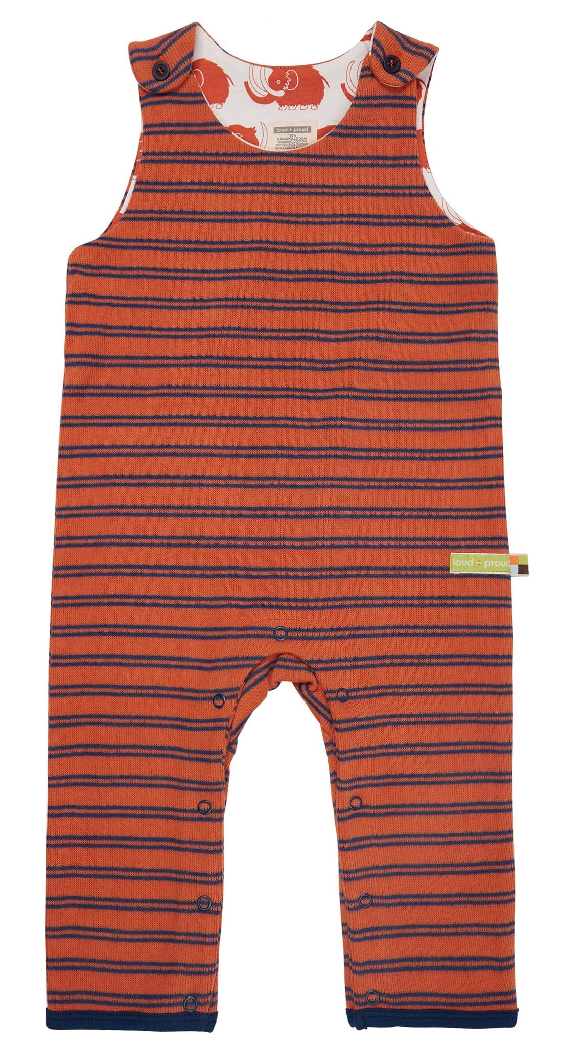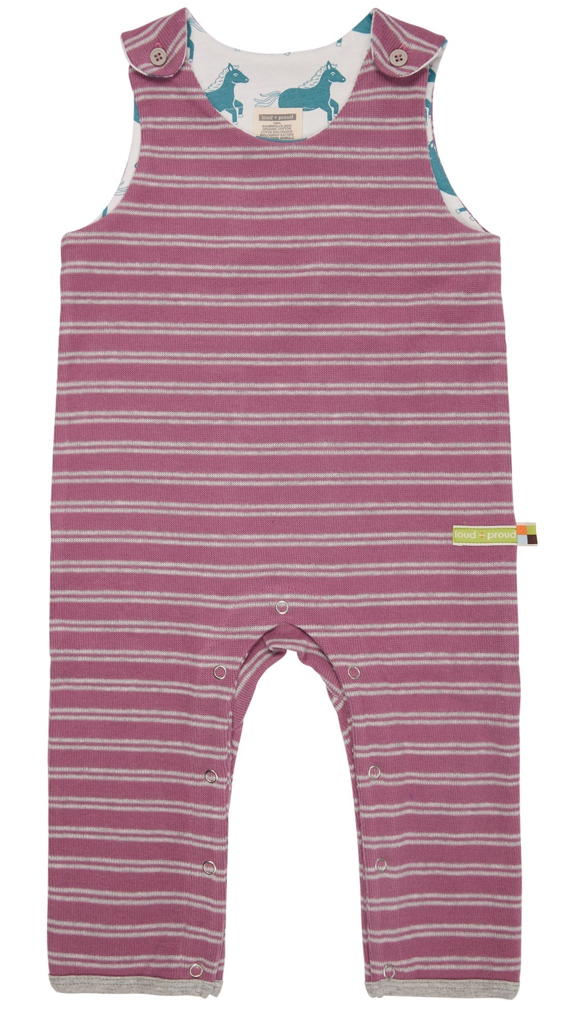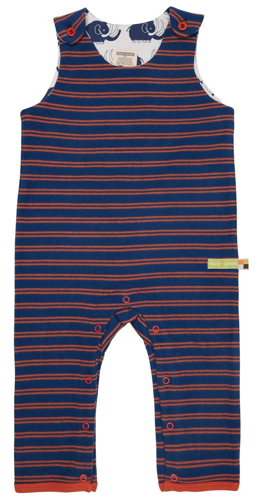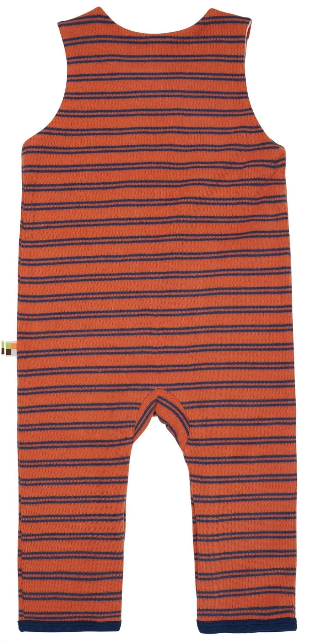 Striped interlock romper with a sanded exterior. Buttons on the shoulders for easy dressing. The shoulder area is lined with printed jersey. The crotch seam can be opened and closed with nickel-free snaps for easy changing. A logo label with a flag is attached to the pocket. Made in Portugal. Washable at 30°C.
