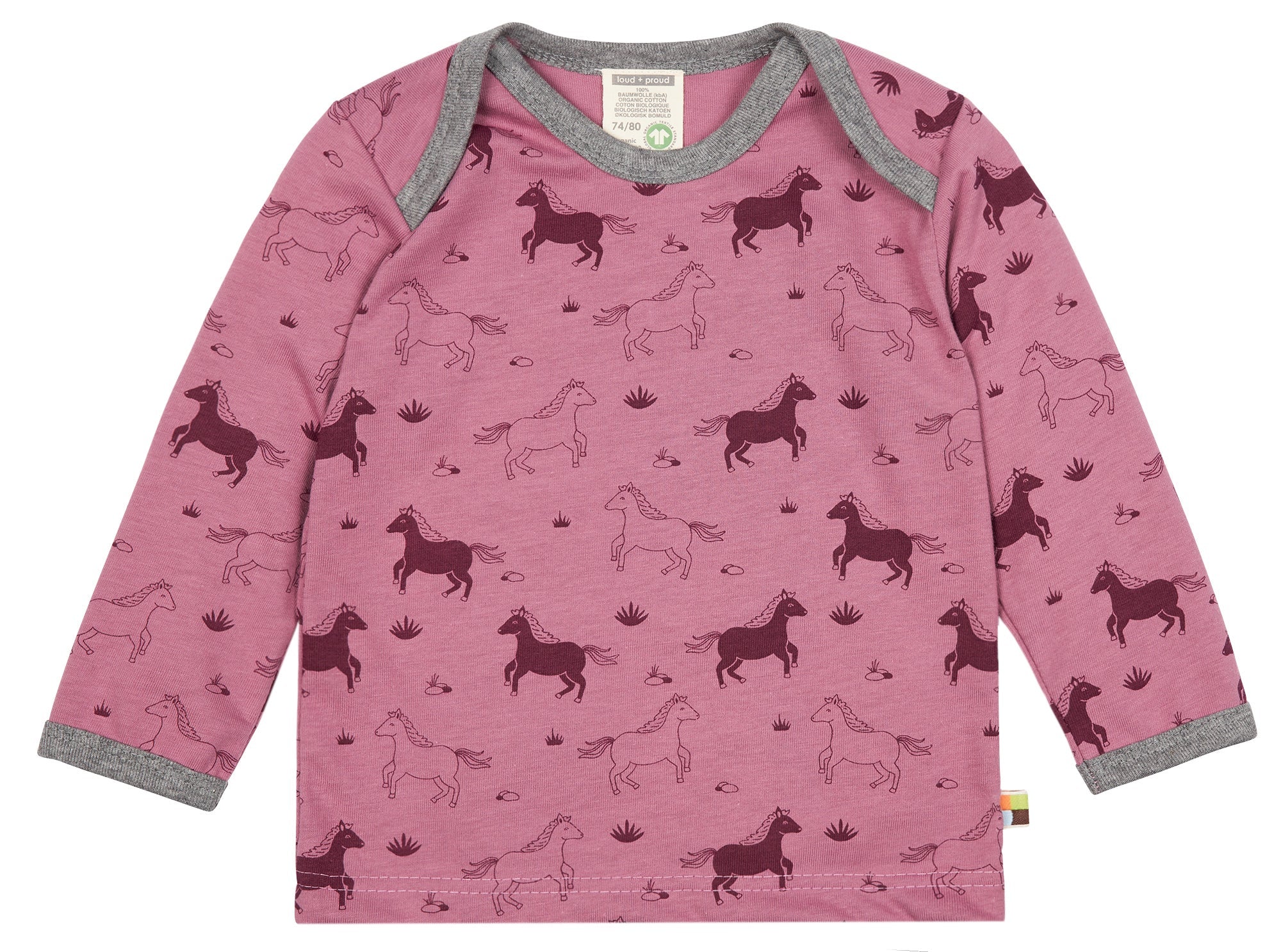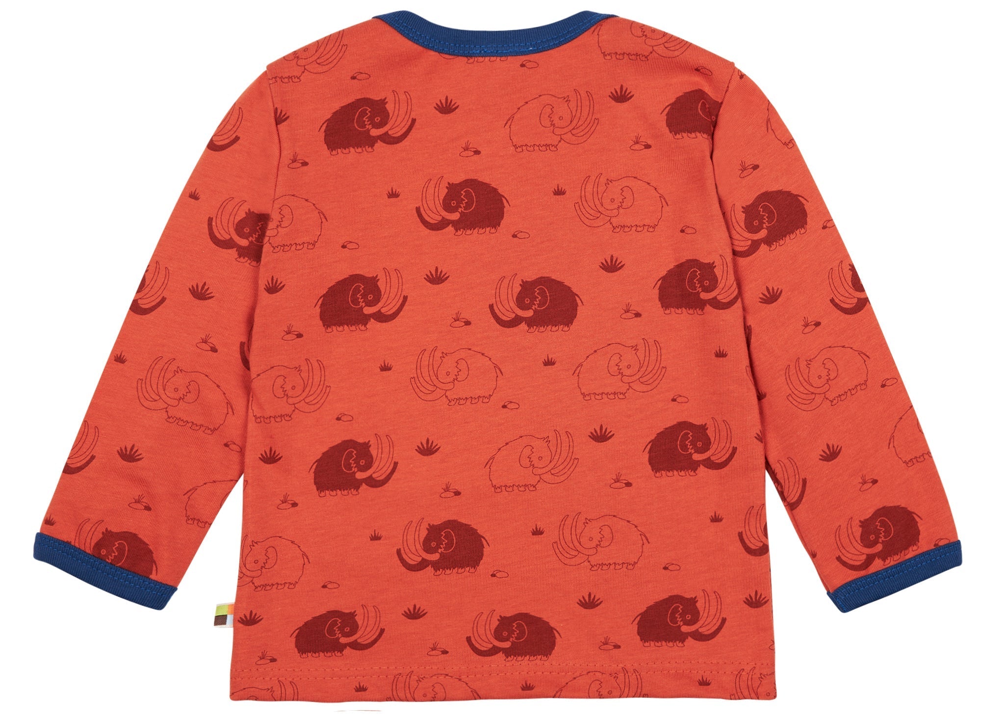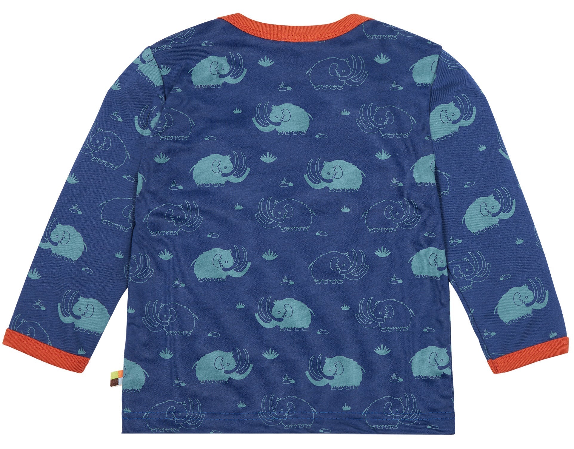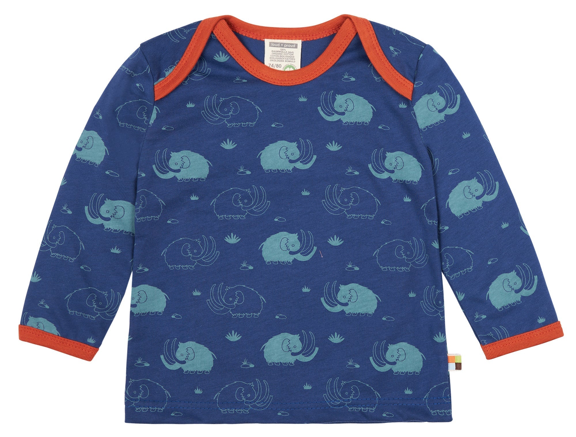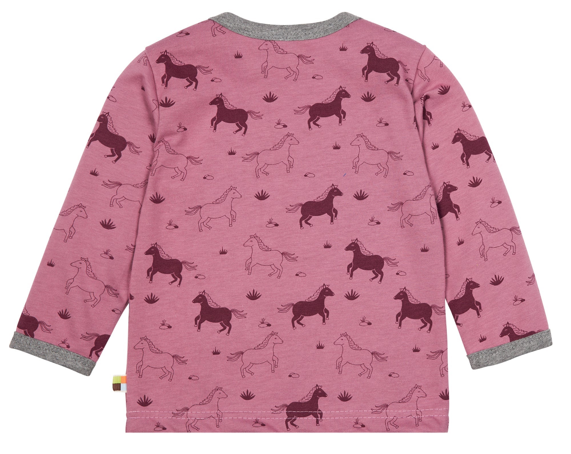 Camiseta de suave jersey con estampado integral. El cuello y los puños de las mangas están rematados en color de contraste. Hasta la talla 86/92, cuello muy abierto para facilitar el cambio; a partir de la talla 98/104, cuello redondo. Etiqueta en la costura lateral. Fabricado en Hungría. Lavable a 30°C.