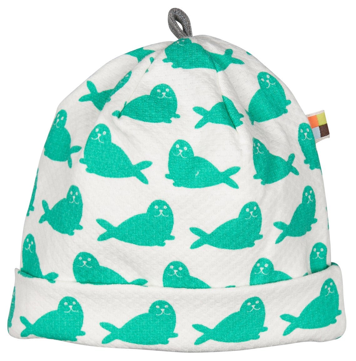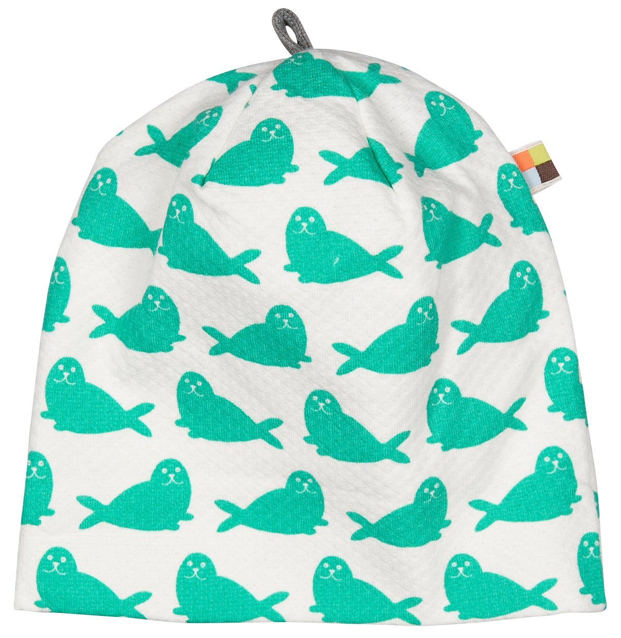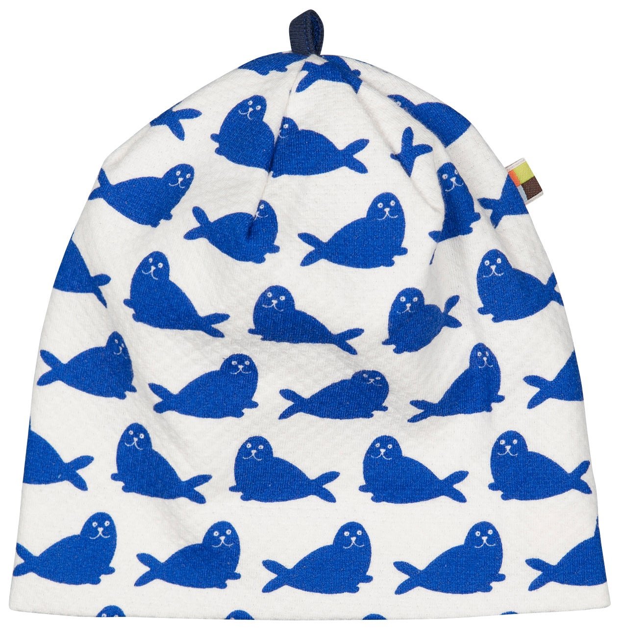Weiche Mütze aus strukturiertem Interlock mit ganzflächig aufgedruckten Tieren (Wasserbasierender Druck), doppellagig. Hinten mit Fähnchen. Made In Hungary. Waschbar bei 30°C.