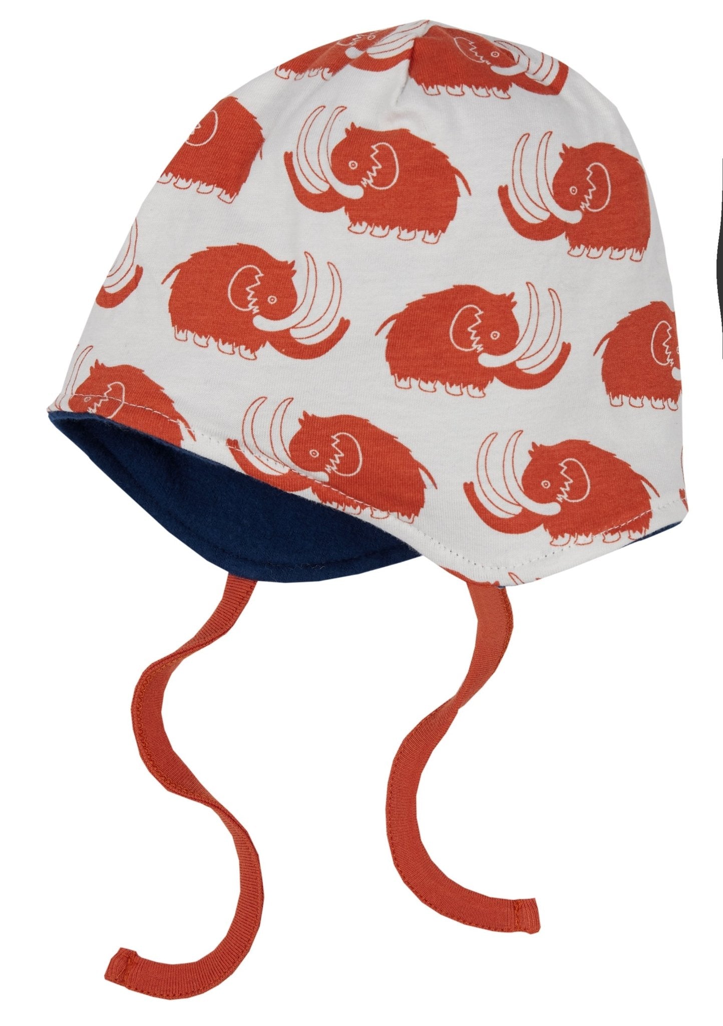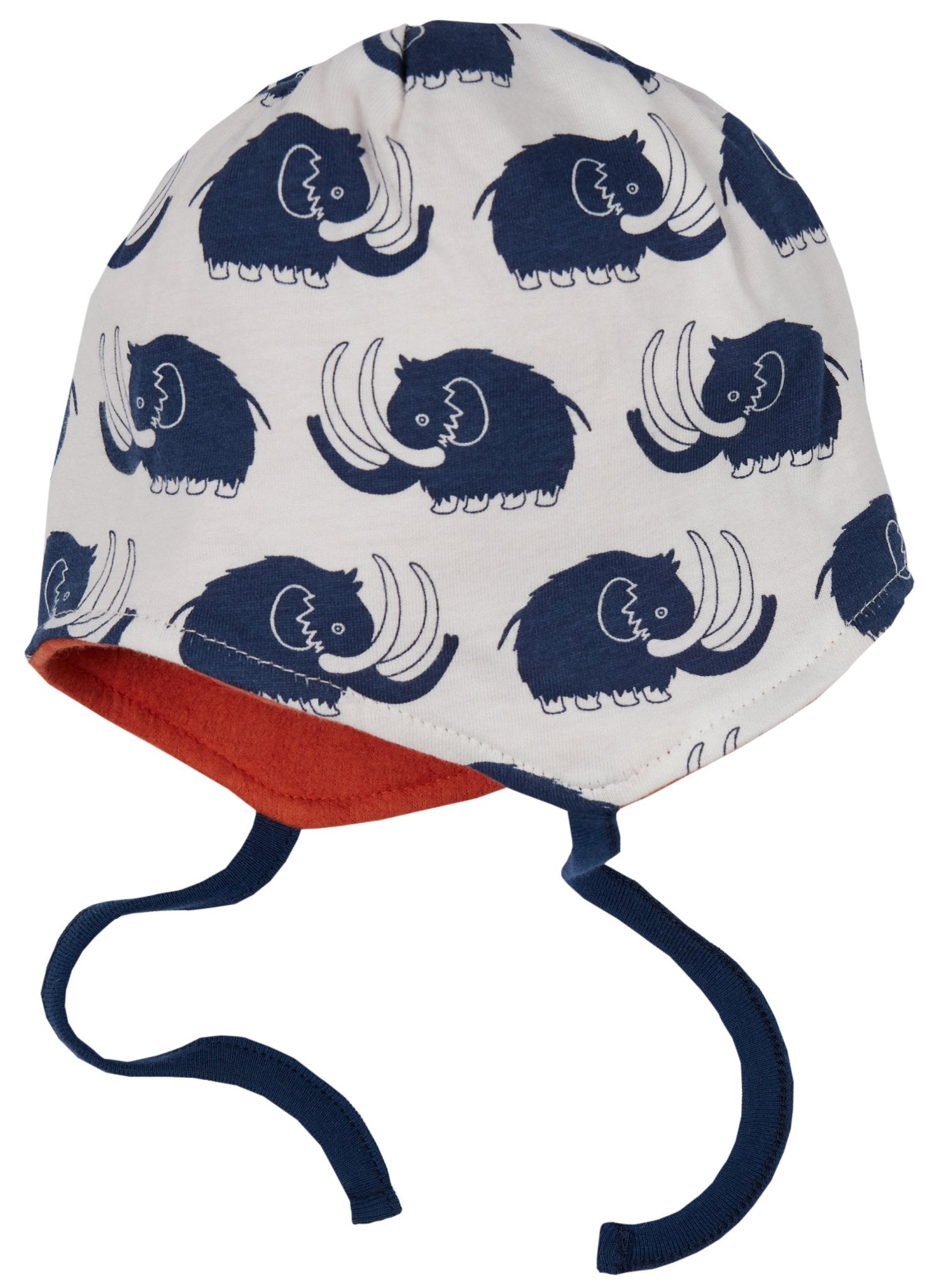 Weiche Wendemütze. Eine Seite ist aus bedrucktem Jersey, die andere Seite aus Fleece gefertigt. Kontrastfarbige Bänder. Vorne Logo-Etikett, hinten mit Fähnchen. Made in Portugal. Waschbar bei 30°C.