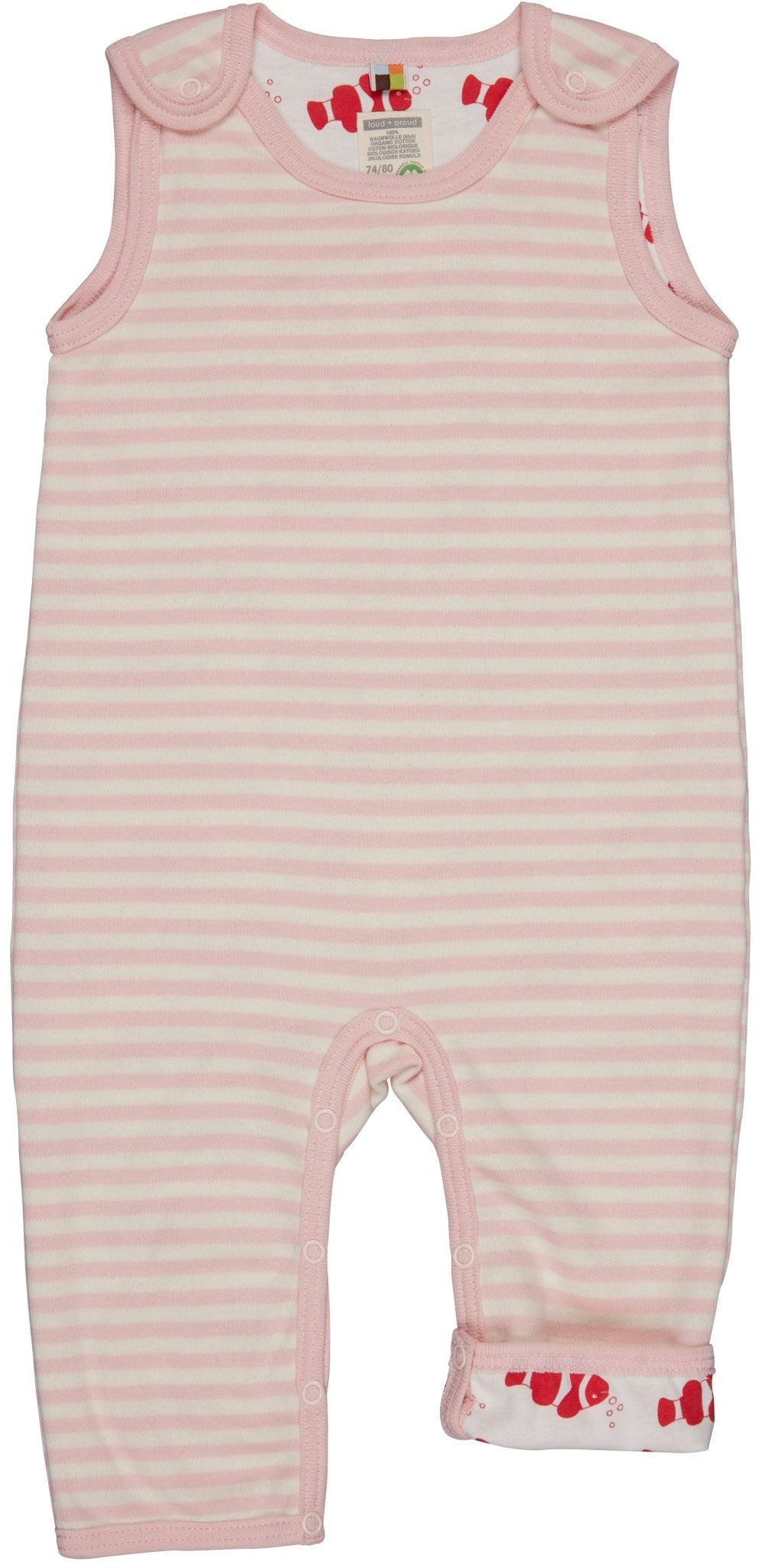 Weicher Wendestrampler. Eine Seite ist aus bedrucktem Jersey, die andere Seite aus geringeltem Interlock gefertigt. Alle Kanten sind in Kontrastfarbe eingefasst. Zum bequemen Wickeln kann die Schrittnaht mit nickelfreien Druckknöpfen geöffnet und verschlossen werden. Logo-Etikett mit Fähnchen an der Seitennaht. Made in Hungary. Waschbar bei 30°C