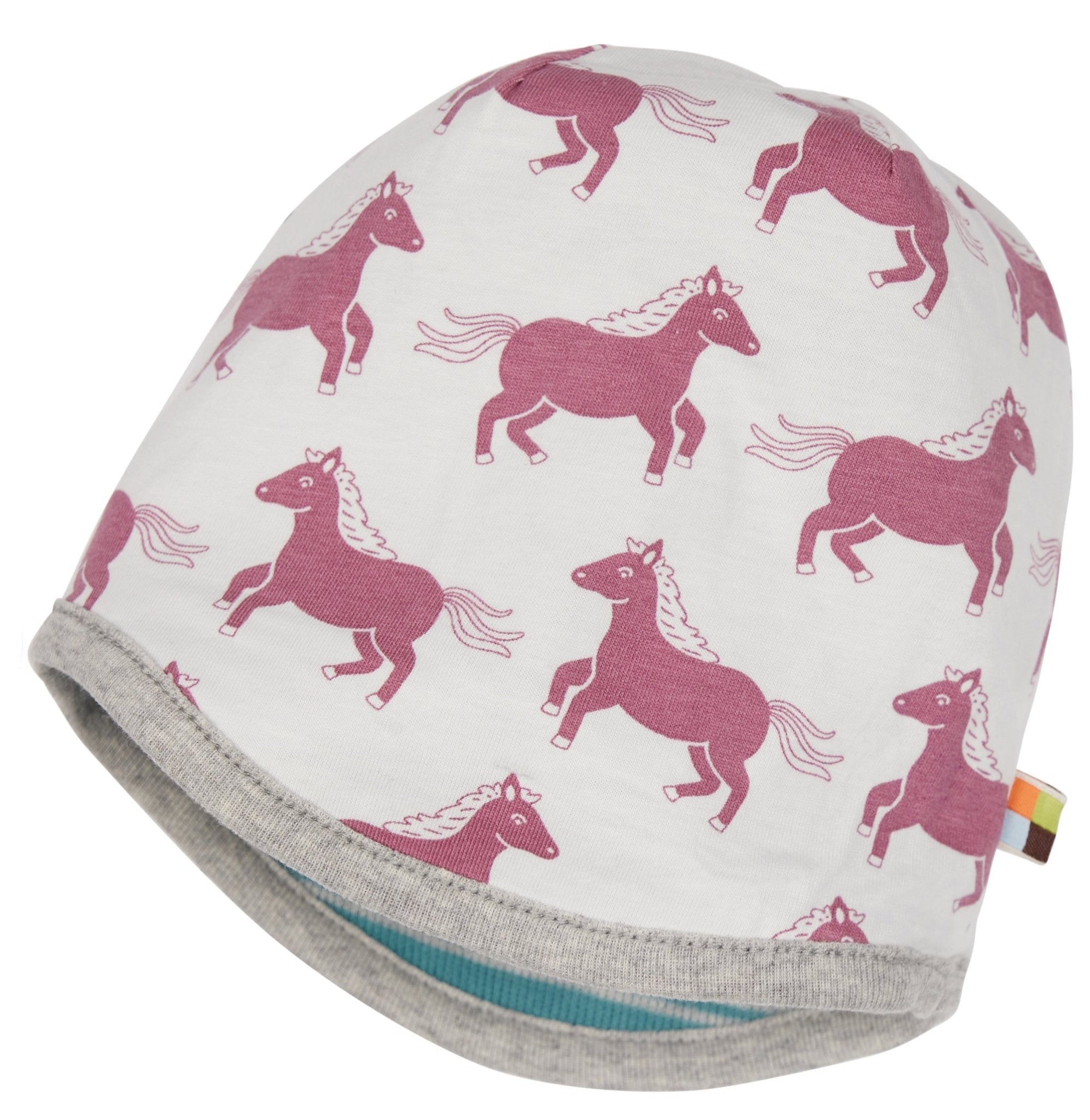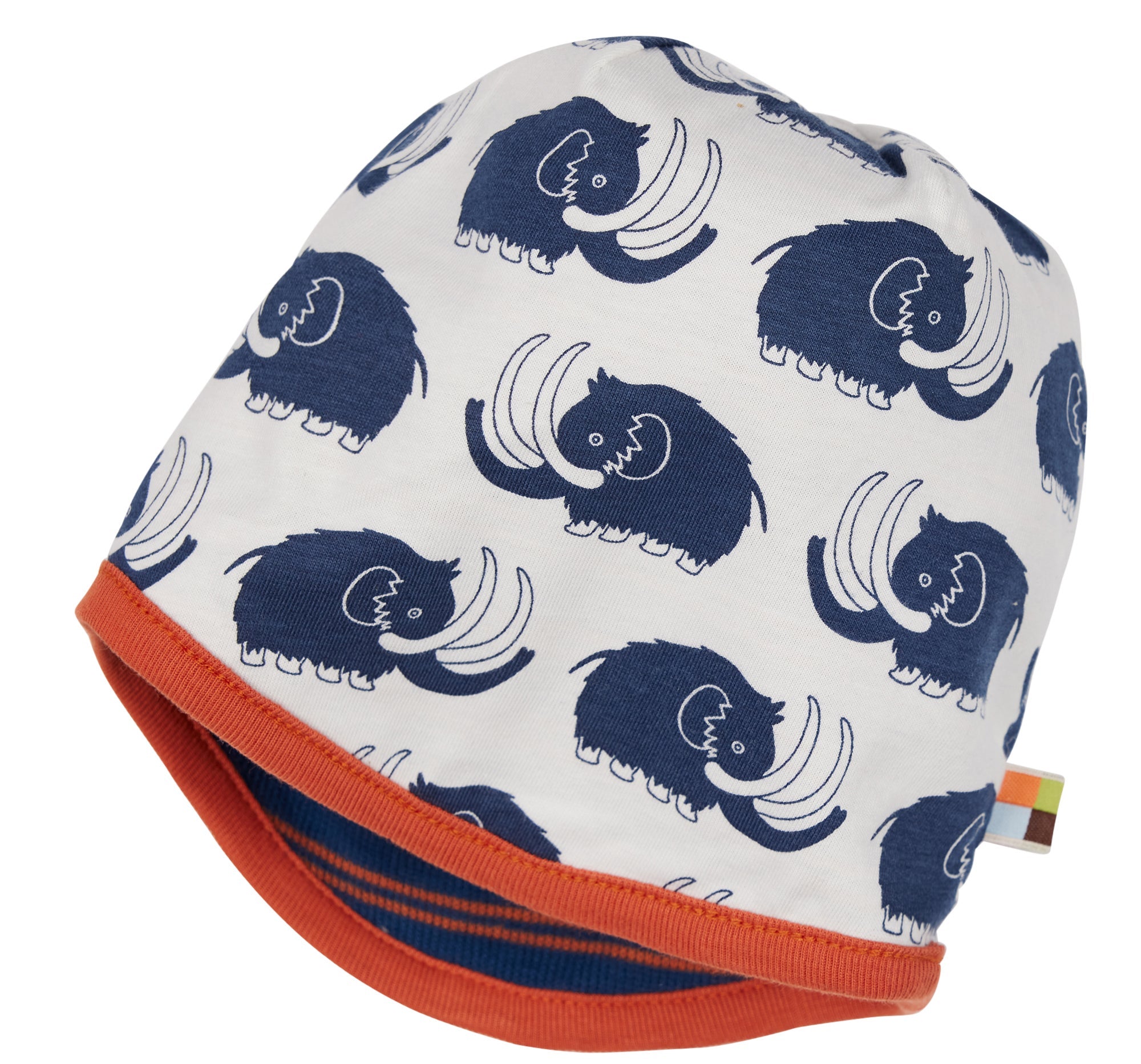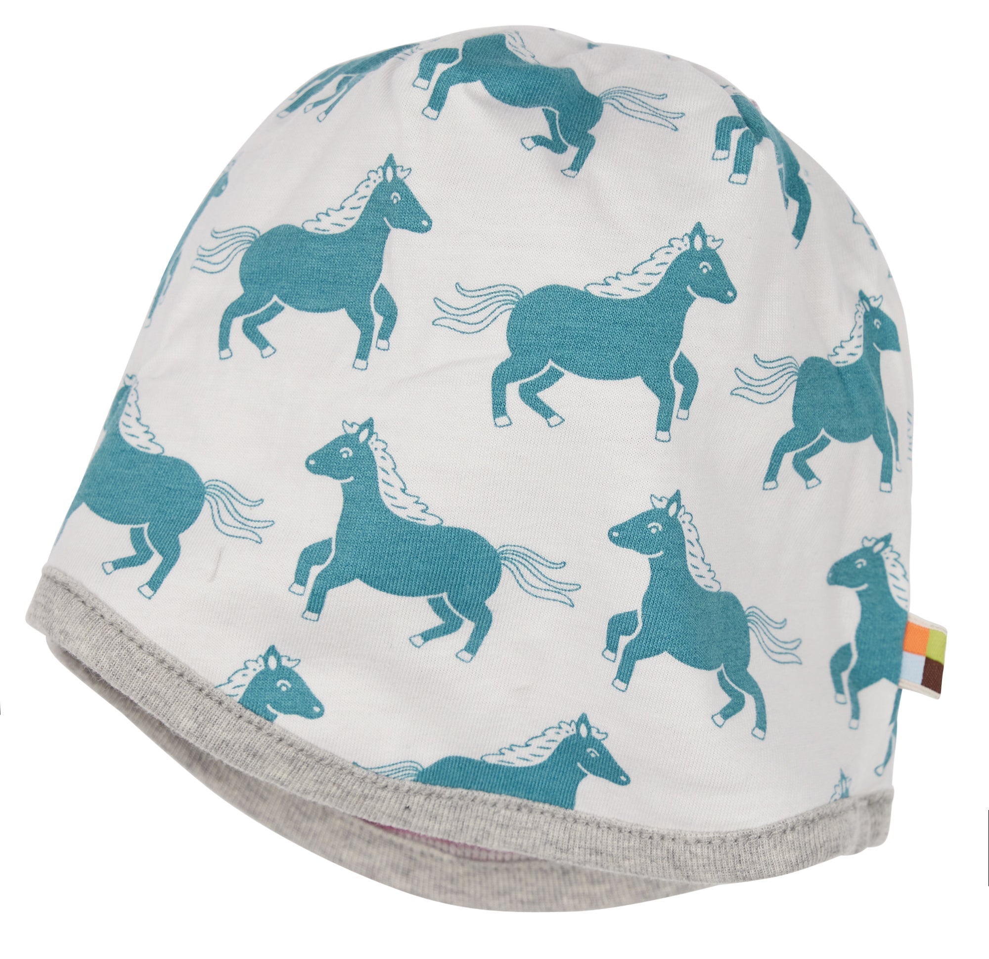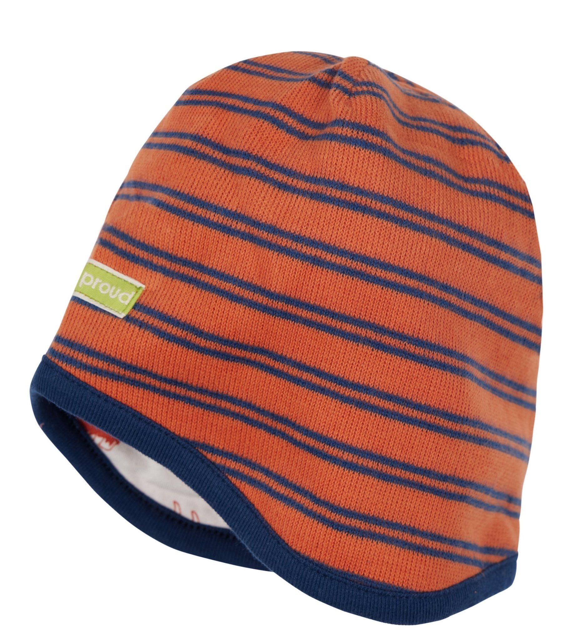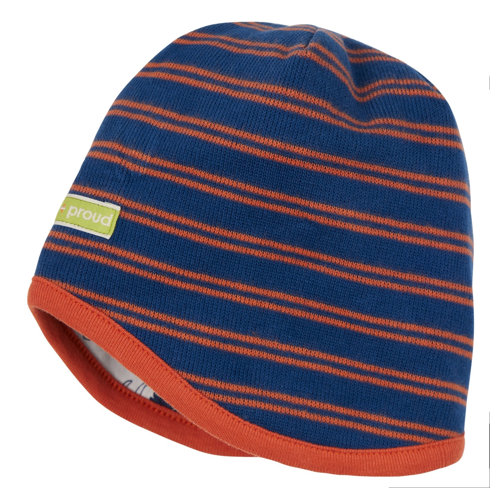 Bonnet chaud et réversible. Un côté est en jersey imprimé, l'autre en interlock rayé avec finition sablée. Le bord est bordé d'une couleur contrastante. Étiquette logo sur le devant, drapeau au dos. Fabriqué au Portugal. Lavable à 30 °C.