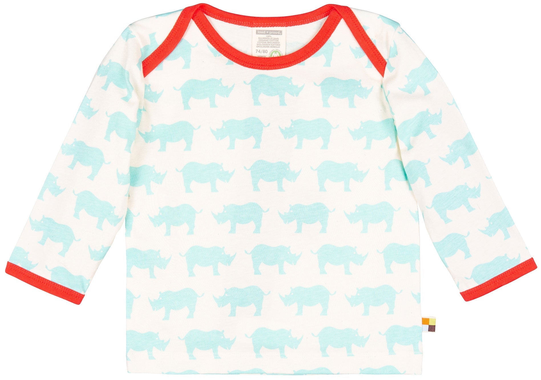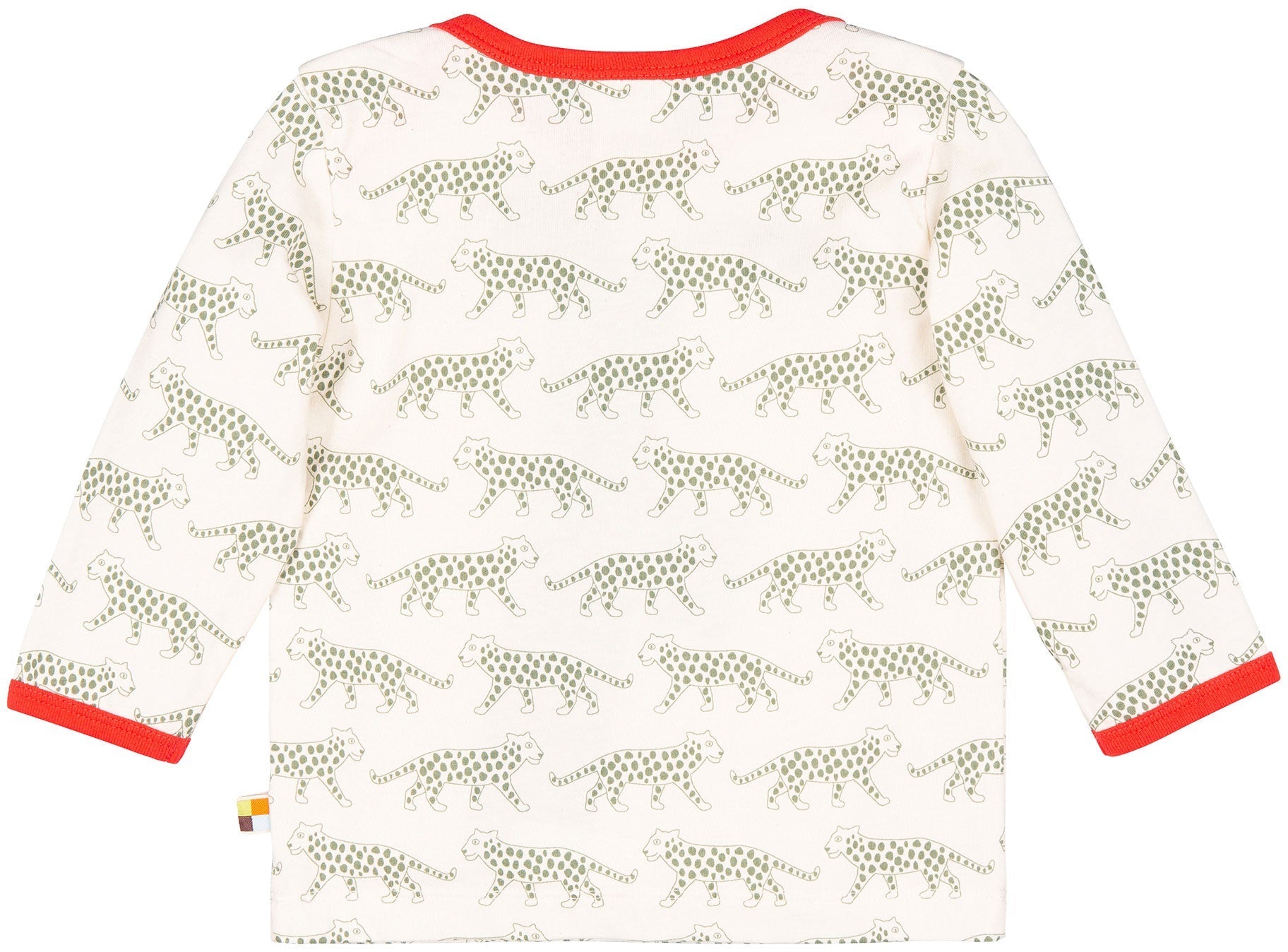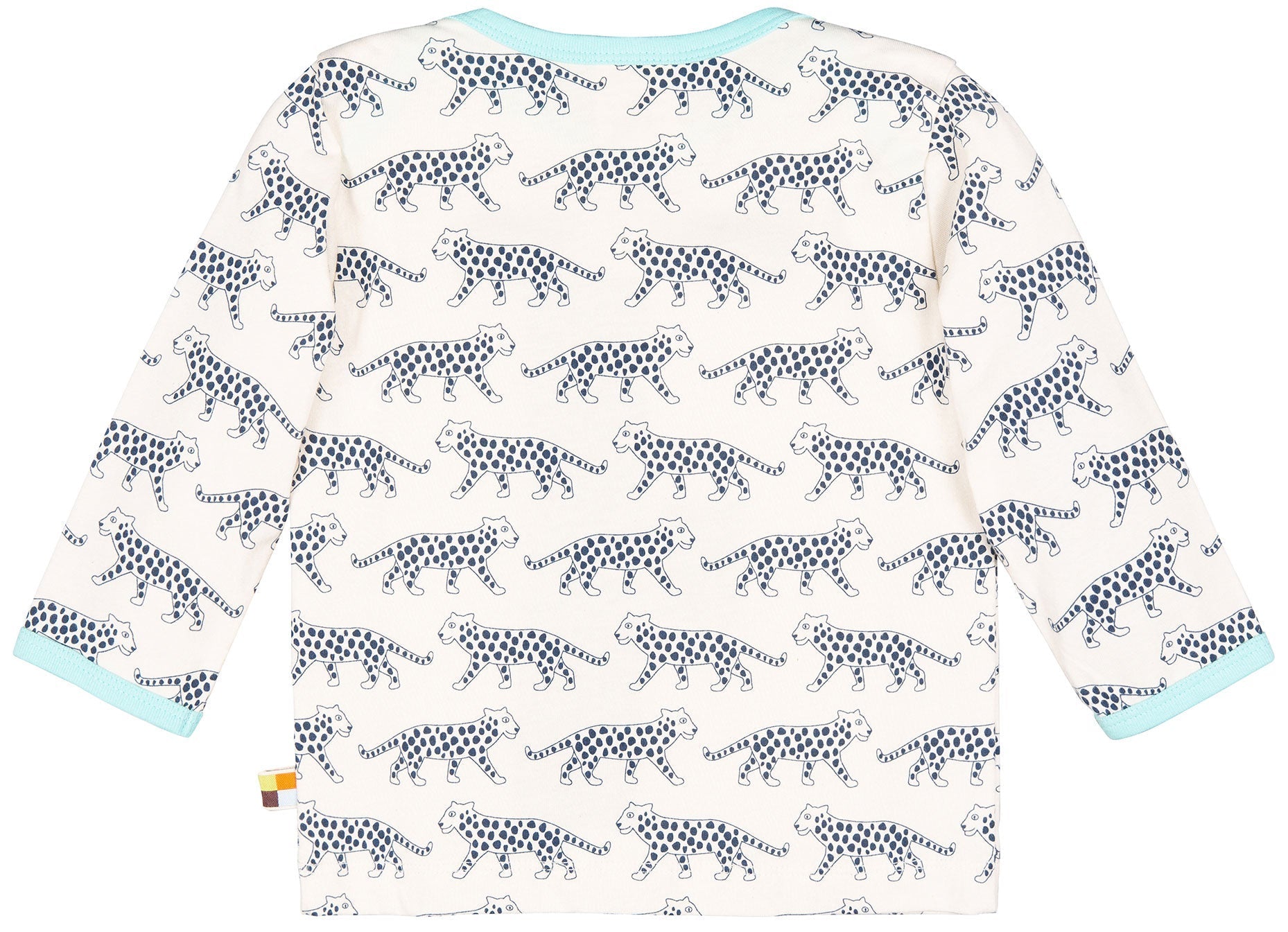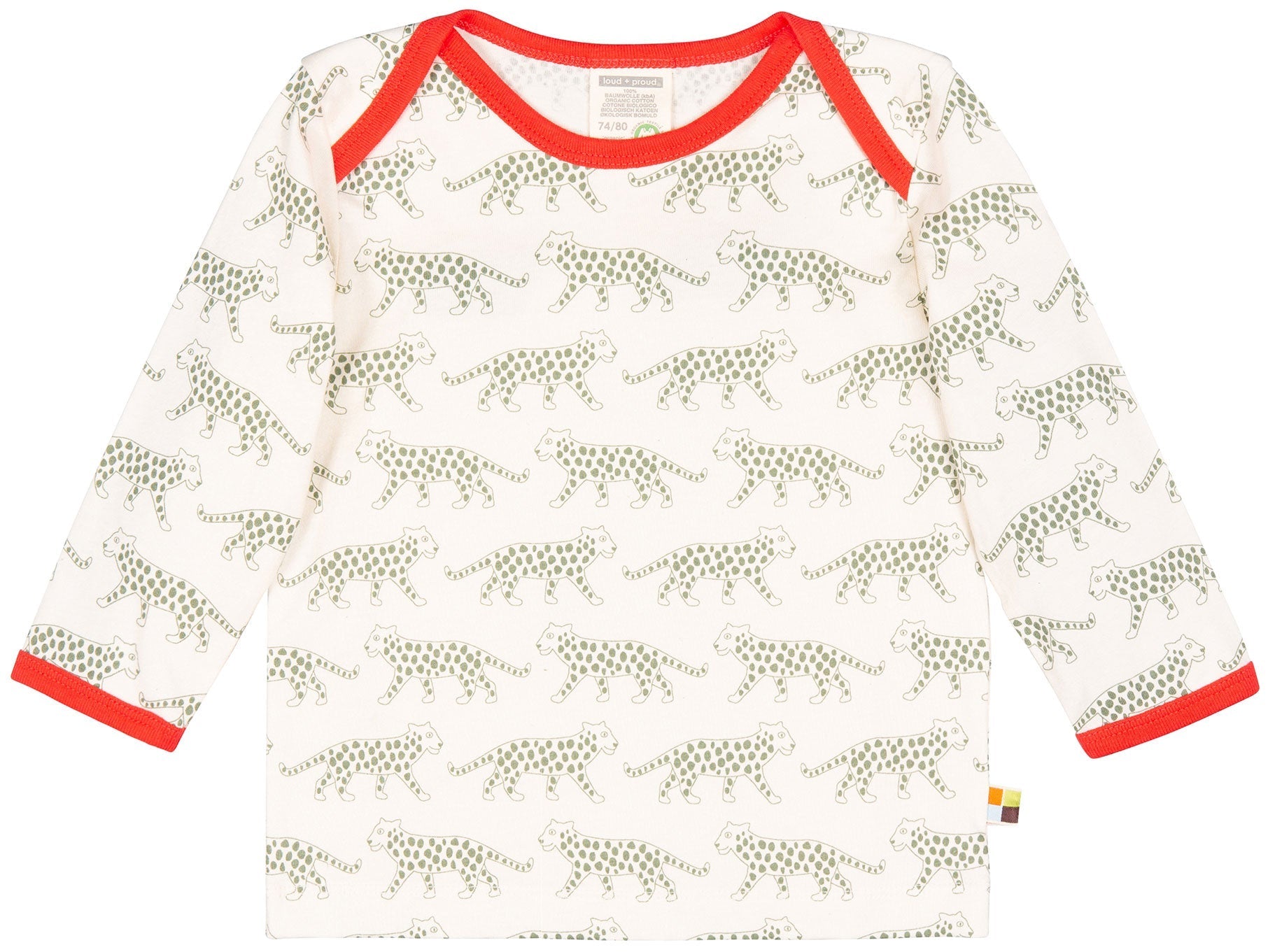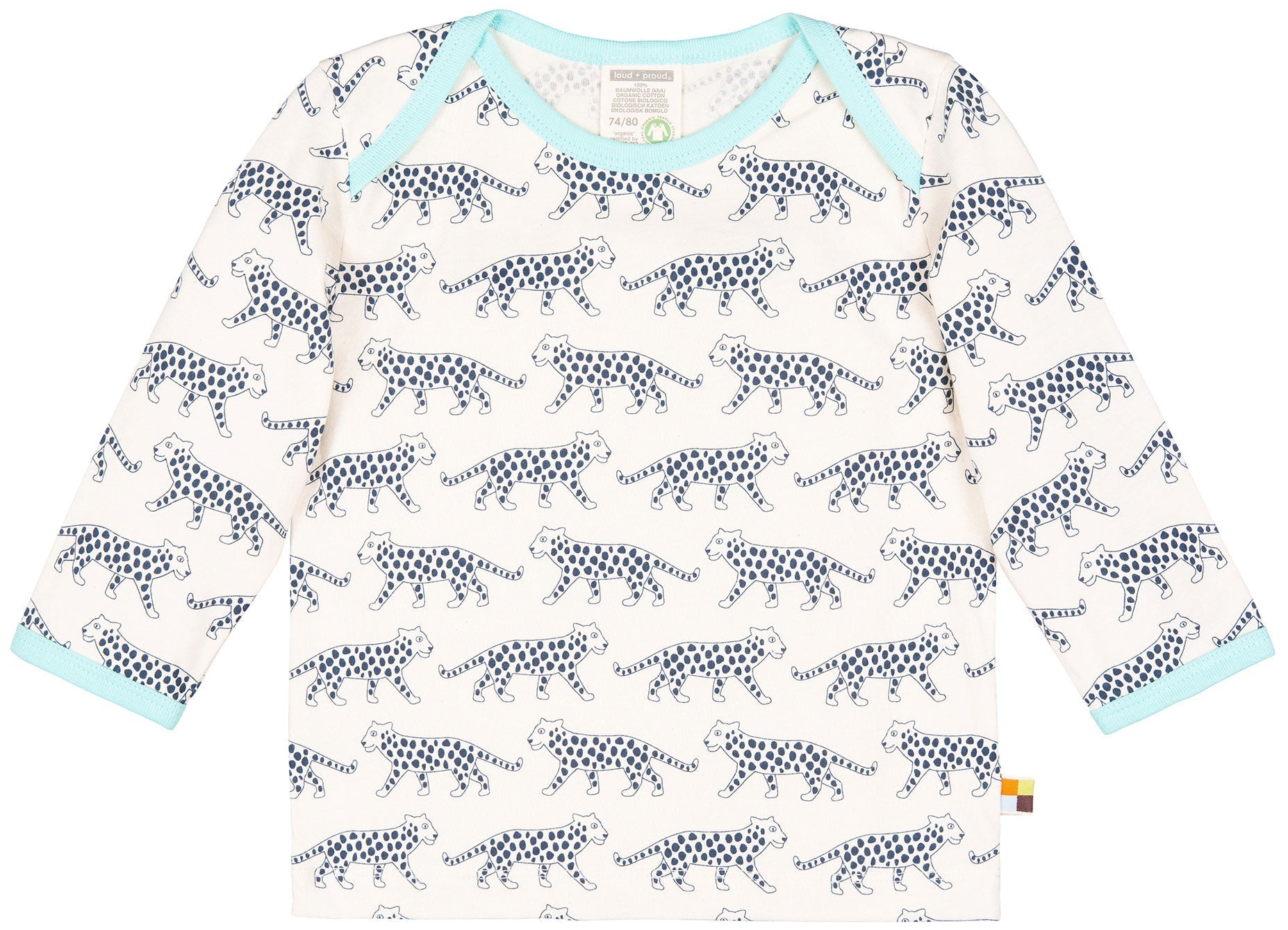 T-shirt à manches longues en jersey simple doux et non teint, orné d'un motif animalier all-over (imprimé à l'eau). Tous les bords sont bordés de fines côtes de couleur contrastante. Jusqu'à la taille 86/92, l'encolure est large ; à partir de la taille 98/104, le col est rond. Drapeau sur la couture latérale. Fabriqué au Portugal. Lavable à 30 °C.