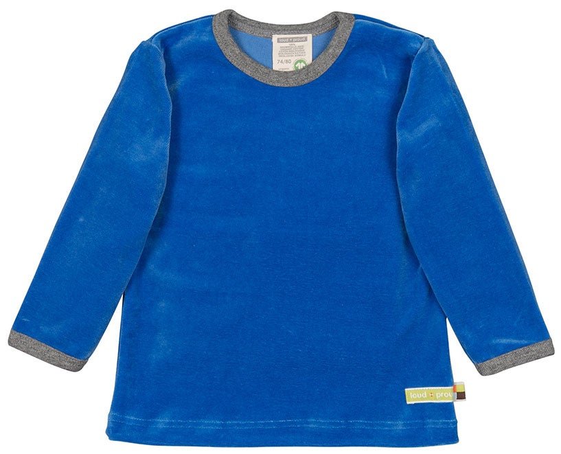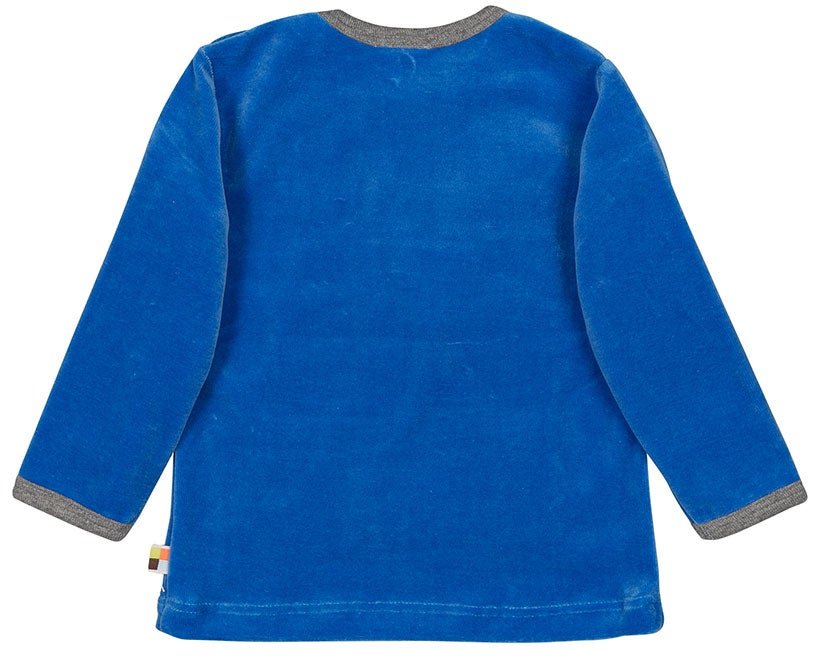 Chemise en velours doux. L'encolure et les poignets sont bordés d'une couleur contrastante. Jusqu'à la taille 86/92, elle est dotée de boutons-pression dissimulés sur l'épaule gauche. Un drapeau est fixé sur la couture latérale. Fabriquée en Hongrie. Lavable à 30 °C.