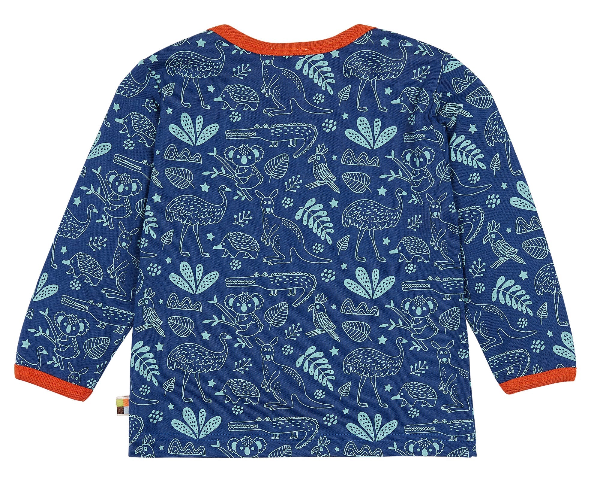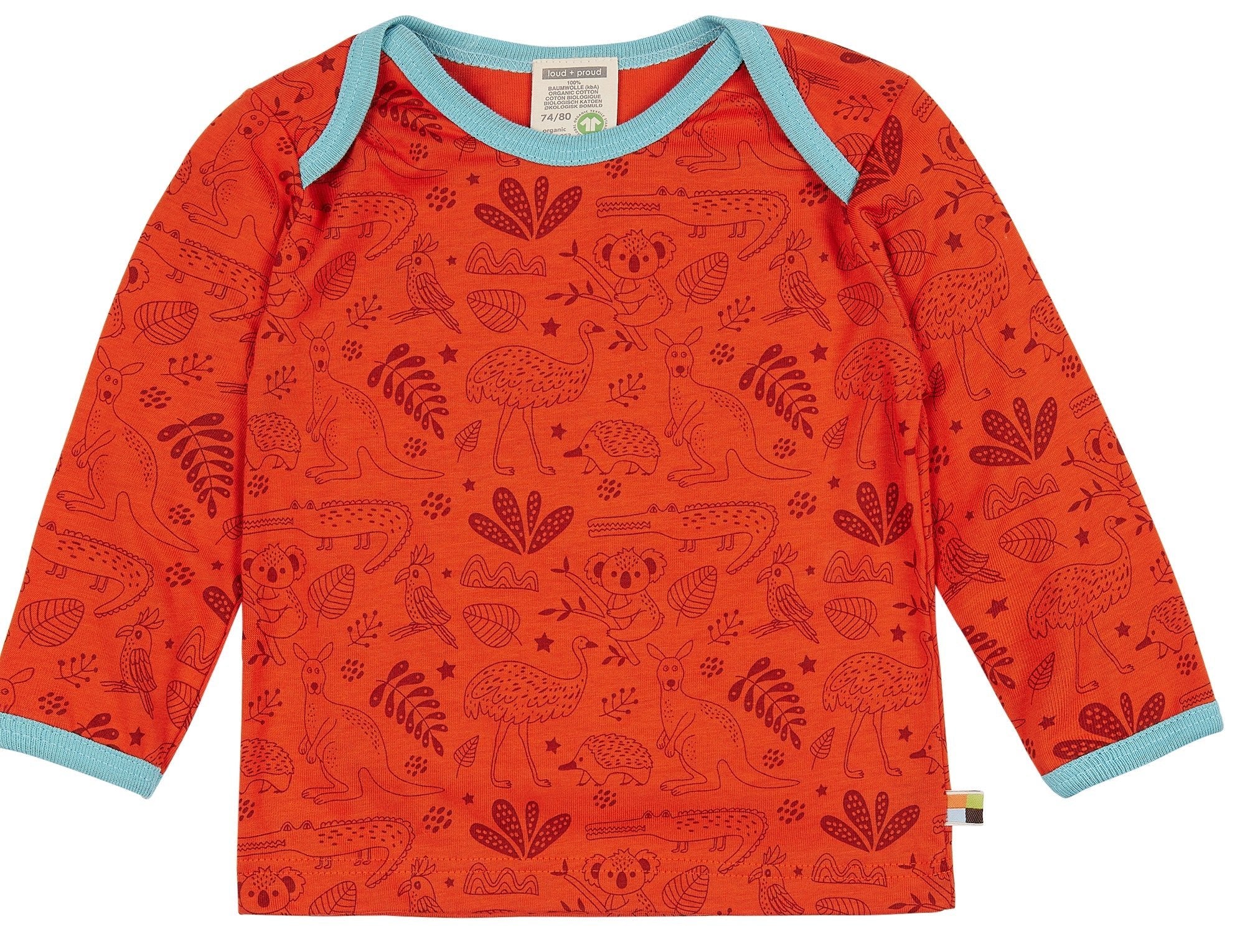 T-shirt en jersey simple doux et non teint, avec un imprimé all-over (à base d'eau). Tous les bords sont bordés de fines côtes de couleur contrastante. Jusqu'à la taille 86/92, l'encolure est large ; à partir de la taille 98/104, le col est rond. Drapeau sur la couture latérale. Fabriqué en Hongrie. Lavable à 30 °C.