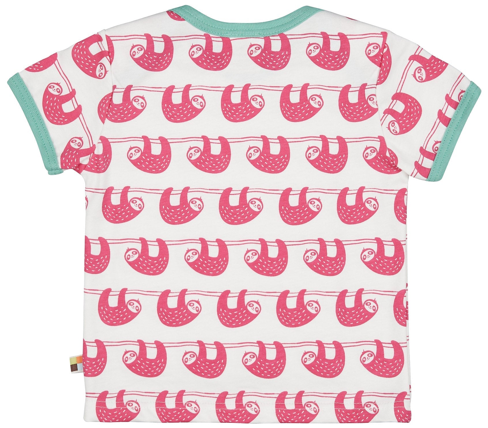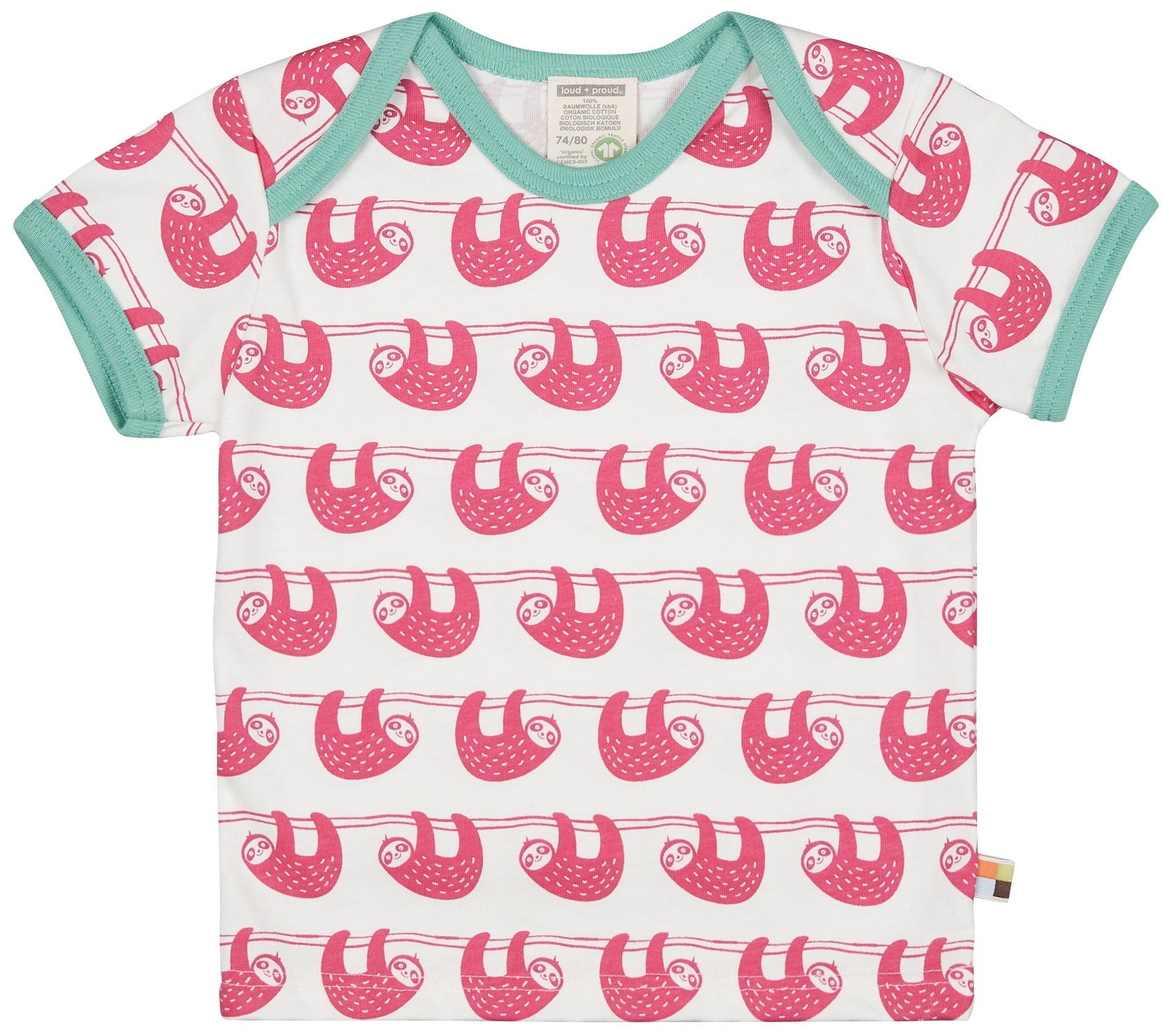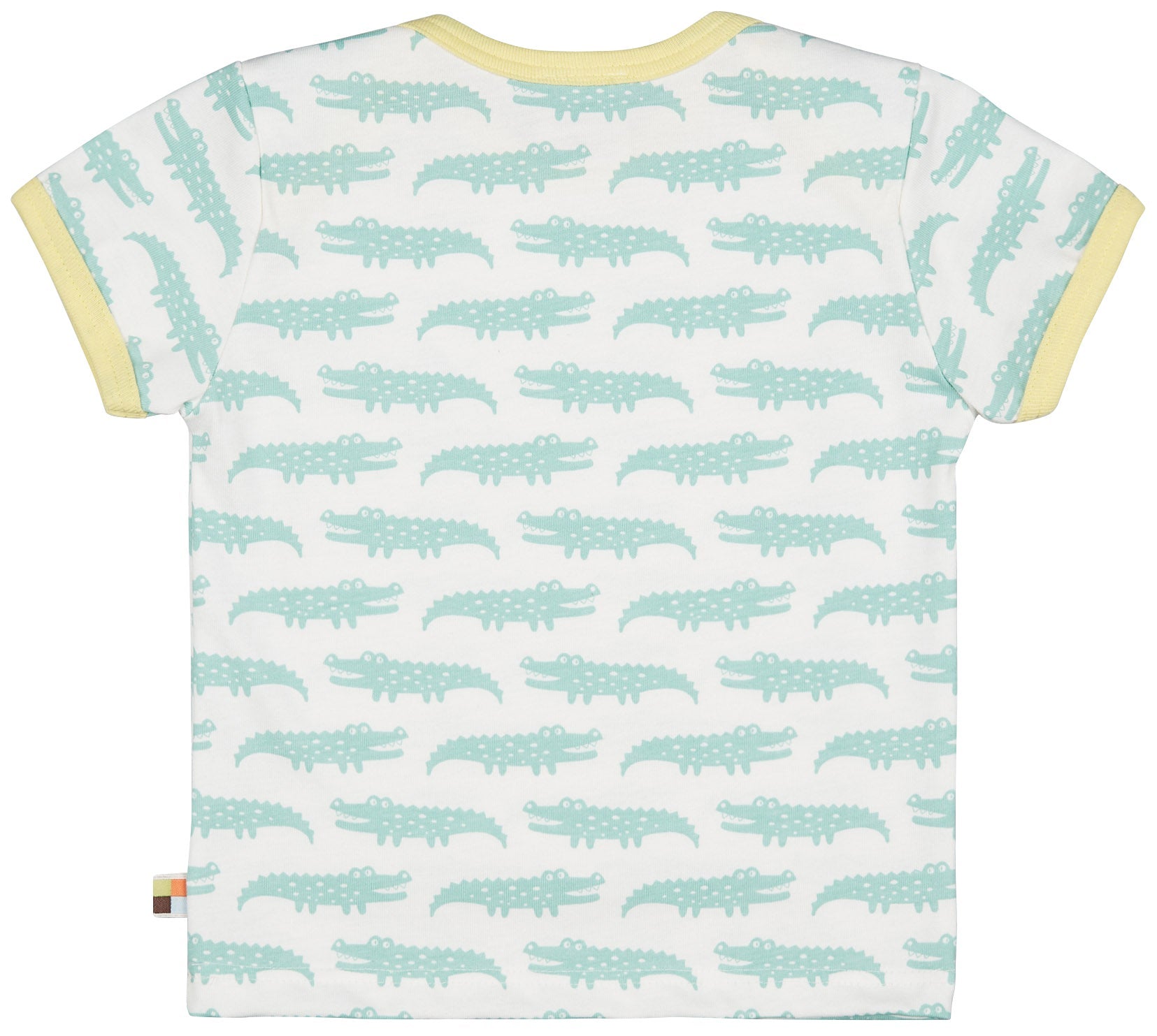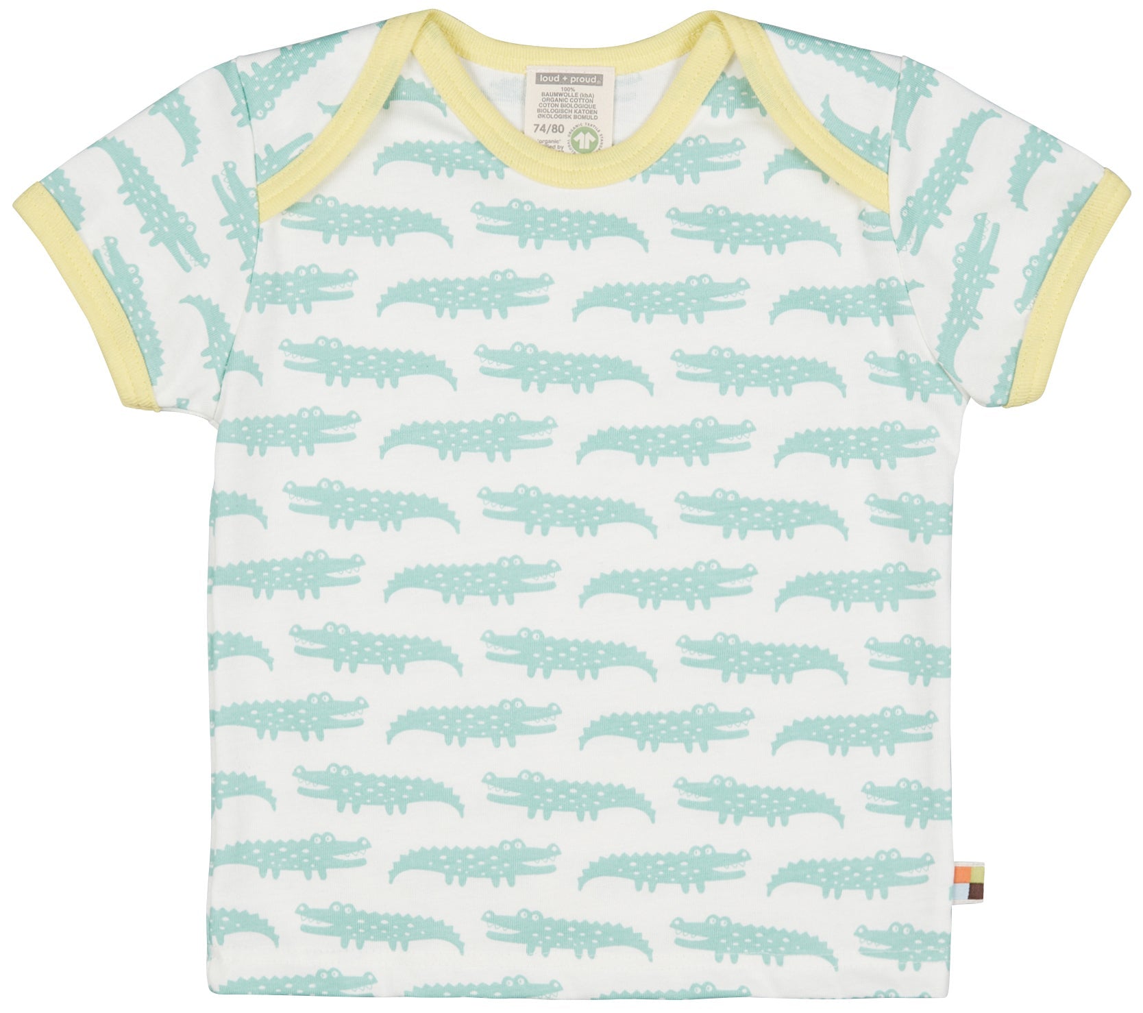 T-Shirt aus ungefärbtem weichem Single Jersey mit ganzflächigem Druck (Wasserbasierender Druck). Alle Kanten sind mit Feinripp in Kontrastfarbe eingefasst. Bis Größe 86/92 weit zu öffnendes Halsloch, ab Größe 98/104 Rundhals-Ausschnitt. Fähnchen an der Seitennaht. Made in Hungary. Waschbar bei 30°C.