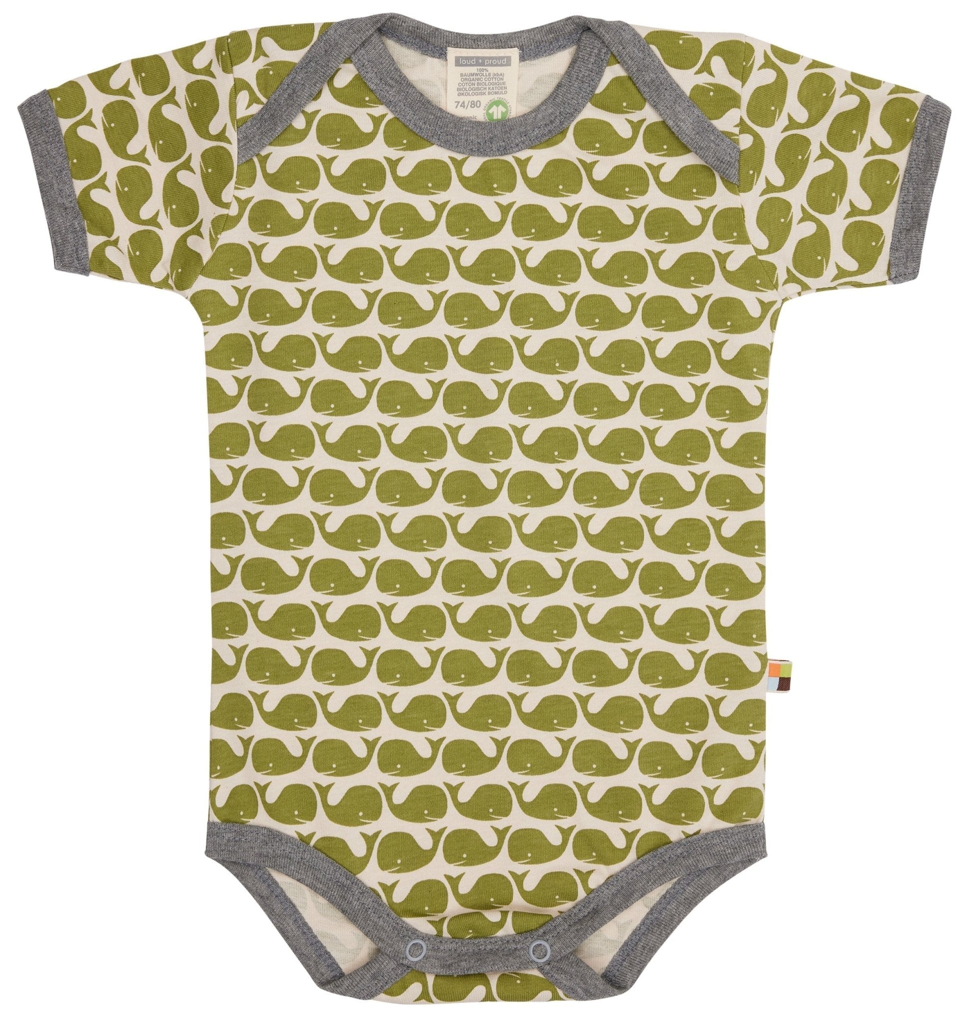Kurzarm Body aus ungefärbter weicher Bio-Baumwollw mit ganzflächig aufgedruckten Walen (Wasserbasierender Druck). Alle Kanten sind mit Feinripp in Kontrastfarbe eingefasst. Schrittverschluss mit 2 Druckknöpfen. Fähnchen an der Seitennaht. Made in Hungary. Waschbar bei 30°C.